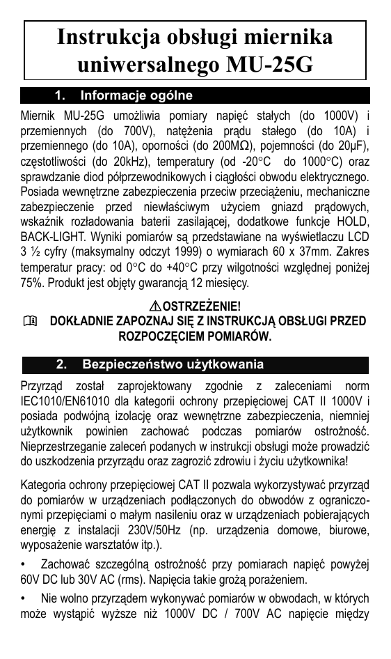 Instrukcja obsługi miernika uniwersalnego MU-25G 1. Informacje ogólne Miernik MU-25G umożliwia pomiary napięć stałych (do 1000V) i przemiennych (do 700V), natężenia prądu stałego (do 10A) i przemiennego (do 10A), oporności (do 200MΩ), pojemności (do 20μF), częstotliwości (do 20kHz), temperatury (od -20C do 1000C) oraz sprawdzanie diod półprzewodnikowych i ciągłości obwodu elektrycznego. Posiada wewnętrzne zabezpieczenia przeciw przeciążeniu, mechaniczne zabezpieczenie przed niewłaściwym użyciem gniazd prądowych, wskaźnik rozładowania baterii zasilającej, dodatkowe funkcje HOLD, BACK-LIGHT. Wyniki pomiarów są przedstawiane na wyświetlaczu LCD 3 ½ cyfry (maksymalny odczyt 1999) o wymiarach 60 x 37mm. Zakres temperatur pracy: od 0C do +40C przy wilgotności względnej poniżej 75%. Produkt jest objęty gwarancją 12 miesięcy. OSTRZEŻENIE! DOKŁADNIE ZAPOZNAJ SIĘ Z INSTRUKCJĄ OBSŁUGI PRZED ROZPOCZĘCIEM POMIARÓW. 2. Bezpieczeństwo użytkowania Przyrząd został zaprojektowany zgodnie z zaleceniami norm IEC1010/EN61010 dla kategorii ochrony przepięciowej CAT II 1000V i posiada podwójną izolację oraz wewnętrzne zabezpieczenia, niemniej użytkownik powinien zachować podczas pomiarów ostrożność. Nieprzestrzeganie zaleceń podanych w instrukcji obsługi może prowadzić do uszkodzenia przyrządu oraz zagrozić zdrowiu i życiu użytkownika! Kategoria ochrony przepięciowej CAT II pozwala wykorzystywać przyrząd do pomiarów w urządzeniach podłączonych do obwodów z ograniczonymi przepięciami o małym nasileniu oraz w urządzeniach pobierających energię z instalacji 230V/50Hz (np. urządzenia domowe, biurowe, wyposażenie warsztatów itp.). • Zachować szczególną ostrożność przy pomiarach napięć powyżej 60V DC lub 30V AC (rms). Napięcia takie grożą porażeniem. • Nie wolno przyrządem wykonywać pomiarów w obwodach, w których może wystąpić wyższe niż 1000V DC / 700V AC napięcie między punktami pomiarowymi, ani napięcie wyższe od 500V między zaciskiem COM a ziemią. • Nie należy przekraczać wartości ustawionych zakresów pomiarowych napięć i prądów. Jeśli występuje możliwość, że mierzona wartość napięcia lub prądu będzie wyższa od wartości ustawionego zakresu, to należy zmienić zakres na odpowiednio wyższy. • Bezpieczeństwo podczas wykonywania pomiarów wymaga używania oryginalnych przewodów pomiarowych. • Nie wolno używać miernika jeśli uległ on uszkodzeniu lub jeśli zostały uszkodzone przewody pomiarowe. Dotyczy to zarówno uszkodzeń elektrycznych jak i mechanicznych. • W wypadku uszkodzenia przewodu pomiarowego, powinien on zostać wymieniony na nowy oryginalny lub odpowiednik. • Przed wykonaniem pomiaru należy się upewnić czy przewody pomiarowe są włączone do właściwych gniazd pomiarowych oraz czy przełącznik obrotowy znajduje się w odpowiedniej pozycji. • Podczas pomiarów nie wolno dotykać końcówek i gniazd pomiarowych. • Nie wykonywać pomiarów mokrymi rękoma oraz w miejscach o dużej wilgotności. • Przed wykonaniem pomiaru temperatury należy upewnić się, czy przewody pomiarowe miernika nie są połączone z innym obwodem elektrycznym. • Podczas wykonywania pomiarów innych wielkości elektrycznych niż temperatury - gniazdo pomiarowe czujnika temperatury nie powinno być używane. • Przed otwarciem tylnej pokrywy obudowy miernika (np. w celu wymiany baterii zasilającej lub bezpiecznika), należy odłączyć od niego przewody pomiarowe. Pomiary można wykonywać dopiero po zamknięciu obudowy. • W przypadku konieczności wymiany wewnętrznego bezpiecznika zabezpieczającego na nowy, należy użyć tylko jego ścisłego odpowiednika. -2- 3. Opis przyrządu 1 2 3 10 9 4 5 8 7 6 -3- 1. Wyświetlacz - typu LCD 3 ½ cyfry (max. wskazanie 1999), wyświetla wartość mierzoną, znak polaryzacji, ostrzeżenie o pomiarze na najwyższym dopuszczalnym zakresie napięcia („HV”) i o rozładowaniu baterii zasilającej. 2. Przycisk funkcji HOLD 3. Przycisk funkcji BACK-LIGHT (podświetlenie) 4. Przełącznik obrotowy - służy do wybierania mierzonych wielkości oraz zakresów pomiarowych. 5. Gniazdo COM - wspólne gniazdo pomiarowe 6. Gniazdo VΩCHz - gniazdo pomiarów napięć, oporności, pojemności i częstotliwości 7. Gniazdo mA - gniazdo pomiaru natężenia prądu stałego i przemiennego dla zakresów pomiarowych do 200mA 8. Gniazdo 10A - gniazdo pomiaru natężenia prądu stałego i przemiennego dla zakresu pomiarowego 10A 9. Gniazdo czujnika temperatury 10. Przycisk włącznika zasilania -4- 3. Dane techniczne Podane poniżej dokładności są gwarantowane w warunkach pomiarów: temperatura 23 ±5˚C, wilgotność względna poniżej 75%. 3.1 Pomiar napięcia stałego: ZAKRES 200mV 2000mV 20V 200V 1000V ROZDZIELCZOŚĆ 0,1mV 1mV 10mV 100mV 1V DOKŁADNOŚĆ ±(0,5% + 3 cyfry) ±(0,8% + 3 cyfry) ±(1,0% + 2 cyfry) Zabezpieczenie przed przeciążeniem: do 1000V DC. Rezystancja wejściowa 10MΩ. 3.2 Pomiar napięcia przemiennego: ZAKRES 2V 20V 200V 700V ROZDZIELCZOŚĆ 1mV 10mV 100mV 1V DOKŁADNOŚĆ ±(1,0% + 5 cyfr) ±(1,2% + 5 cyfr) Zabezpieczenie przed przeciążeniem: do ~700Vrms. Impedancja wejściowa 10MΩ. Pasmo częstotliwości: 40Hz ~ 400Hz. 3.3 Pomiar natężenia prądu stałego: ZAKRES 2mA 20mA 200mA 10A ROZDZIELCZOŚĆ 1uA 10uA 0,1mA 10mA DOKŁADNOŚĆ ±(1,8% + 3 cyfry) ±(2,0% + 2 cyfry) ±(2,0% +10 cyfr) Zabezpieczenie przed przeciążeniem: bezpiecznik 500mA/250V na wszystkich zakresach poza 10A. 3.4 Pomiar natężenia prądu przemiennego: ZAKRES 2mA 20mA 200mA 10A ROZDZIELCZOŚĆ 1uA 10uA 0,1mA 10mA DOKŁADNOŚĆ ±(2,0% + 3 cyfry) ±(2,0% + 5 cyfr) ±(3,0% +10 cyfr) Zabezpieczenie przed przeciążeniem: bezpiecznik 500mA/250V na wszystkich zakresach poza 10A. Pasmo częstotliwości: 40Hz ~ 400Hz. -5- 3.5 Pomiar rezystancji: ZAKRES ROZDZIELCZOŚĆ 200Ω 100mΩ 2kΩ 1Ω 20KΩ 10Ω 200KΩ 100Ω 2MΩ 1KΩ 20MΩ 10KΩ 200MΩ