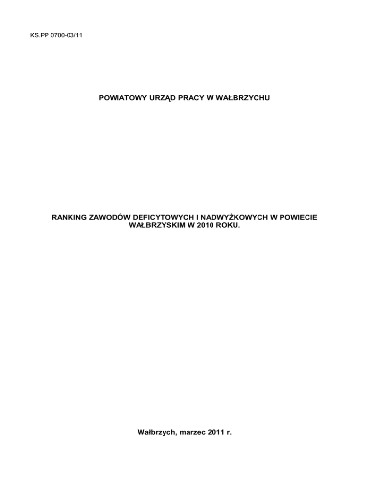KS.PP 0700-03/11 POWIATOWY URZĄD PRACY W WAŁBRZYCHU RANKING ZAWODÓW DEFICYTOWYCH I NADWYŻKOWYCH W POWIECIE WAŁBRZYSKIM W 2010 ROKU. Wałbrzych, marzec 2011 r. Spis Treści 1.Wstęp. 1.1 Cele opracowania. 1.2 Podstawa opracowania. 1.3 Metodologia opracowania. 2. Analiza bezrobocia według zawodów / grup zawodowych. 2.1 Analiza bezrobocia według zawodów. 2.2 Analiza bezrobocia według grup zawodowych. 3. Analiza ofert pracy według zawodów / grup zawodowych. 3.1 Analiza ofert pracy według grup zawodowych. 3.2 Analiza ofert pracy według zawodów. 4 Analiza zawodów deficytowych i nadwyżkowych. 4.1 Średnia miesięczna nadwyżka (deficyt) podaży siły roboczej. 4.2 Wskaźnik intensywności nadwyżki (deficytu) zawodów. 1.Wstęp 1.1 Cele opracowania. Celem opracowania rankingu zawodów deficytowych jest obserwowanie zjawisk zachodzących na rynku pracy dotyczących kształtowania popytu na pracę i podaży zasobów pracy w przekroju terytorialno -zawodowym oraz formułowania na tej podstawie ocen, wniosków i krótkotrwałych prognoz niezbędnych dla prawidłowego funkcjonowania systemów szkolenia bezrobotnych oraz kształcenia zawodowego. Prowadzenie monitoringu zawodów deficytowych i nadwyżkowych pozwala na : • Określenie kierunków i natężenia zmian zachodzących w strukturze zawodowo – kwalifikacyjnej na lokalnym, regionalnym i krajowym rynku pracy. • Stworzenie bazy informacji dla opracowania przyszłych struktur zawodowo – kwalifikacyjnych w układzie lokalnym, regionalnym i krajowym, • określenie odpowiednich kierunków szkolenia bezrobotnych, zapewniając większą efektywność organizowanych szkoleń, • bieżącą korektę poziomu, struktury i treści kształcenia zawodowego, (dotyczy władz oświatowych oraz dyrekcji szkół), • usprawnienie pośrednictwa pracy poprzez uzyskanie informacji o planowanych ofertach pracy na rok przyszły oraz przewidywanej liczbie absolwentów według zawodów. 1.2 Podstawa opracowania. Zgodnie z przepisami Ustawy z dnia 20 kwietnia 2004 r. O promocji zatrudnienia i instytucjach rynku pracy ( art.8, ust.1 pkt. 3 i art. 9, ust. 1 pkt 9) opracowanie analiz rynku pracy , w tym prowadzenie monitoringu zawodów deficytowych i nadwyżkowych jest jednym z zadań samorządu powiatu w zakresie polityki rynku pracy oraz zadaniem umieszczonym w Krajowym Planie Działań na Rzecz Zatrudnienia na 2011 r. 1.3 Metodologia opracowania Źródła informacji niezbędne do opracowania niniejszego raportu zostały pobrane ze strony internetowej https://mz.praca.gov.pl Monitoring dotyczy 30 dużych grup zawodowych, 392 grup elementarnych oraz 1707 zawodów i specjalności określonych w „Klasyfikacji zawodów i specjalności” wprowadzonej do stosowania Rozporządzeniem Ministra Gospodarki i Pracy z dnia 8 grudnia 2004 roku. Ponadto przy monitoringu uwzględniono również poziom i strukturę bezrobotnych oraz zgłoszonych ofert pracy według Polskiej Klasyfikacji Działalności. 2. Analiza bezrobocia według zawodów / grup zawodów. 2.1 Analiza bezrobocia według zawodów. Analizę bezrobocia według zawodów dokonano w oparciu o dane statystyczne za rok 2010 Poniższa tabela zawiera zestawienie zawodów, w których występowało największe bezrobocie w roku 2010. Nazwa zawodu Ilość osób bezrobotnych Ogółem Kobiety Sprzedawca 775 710 Krawiec 330 321 Murarz 315 0 Górnik eksploatacji podziemnej 262 0 Ślusarz 237 5 Szwaczka 207 200 Ekonomista 170 140 Robotnik budowlany Robotnik gospodarczy 168 162 3 87 Sprzątaczka biurowa 151 145 Kucharz 146 126 Technik mechanik 142 8 Technik prac biurowych 134 115 Pozostali robotnicy przy pracach prostych w 120 62 118 44 Technik ekonomista 97 87 Piekarz 91 20 Pozostali mechanicy pojazdów samochodowych 88 0 Pedagog 87 79 Stolarz 85 7 Technik budownictwa 83 22 Tokarz w metalu 81 3 Ceramik wyrobów użytkowych i ozdobnych 79 71 Cukiernik 76 41 Technik administracji 76 66 Kelner 72 65 Pakowacz 71 60 Mechanik samochodów osobowych 70 0 Salowa 66 64 65 60 Tkacz 62 56 Pomoc kuchenna 61 55 Robotnik drogowy 60 3 przemyśle Magazynier Fryzjer W 2010 r. największe bezrobocie występowało wśród osób z zawodem sprzedawcy oraz krawca. Przeważającą część tych osób stanowiły kobiety. Dużą grupę bezrobotnych tworzy także grupa zawodowa szwaczek, murarzy oraz górników eksploatacji podziemnej. Wśród mężczyzn największe bezrobocie panuje w zawodach murarza oraz ślusarza. Jednak największą grupą osób bezrobotnych stanowiły osoby bez zawodu, do grupy tej zaliczało się 2303 osób, w tym 1345 kobiety. Napływ bezrobotnych według zawodów w powiecie wałbrzyskim w 2010 r. największy liczbowo był w n/w zawodach: Nazwa zawodu Ilość osób bezrobotnych Ogółem Kobiety Krawiec 588 253 531 243 Murarz 225 0 Ślusarz 184 1 Górnik eksploatacji podziemnej 173 0 Szwaczka 159 152 Robotnik budowlany Pozostali robotnicy przy pracach prostych w 153 3 141 48 Sprzedawca przemyśle Robotnik gospodarczy 134 67 Ekonomista 134 110 Technik mechanik 133 3 Kucharz 113 79 Stolarz 103 4 Technik ekonomista 101 89 W badanym okresie najwięcej do urzędu pracy napłynęło osób bezrobotnych z kwalifikacjami w zawodach :sprzedawcy, krawca, murarza oraz szwaczki. Najwięcej bezrobotnych kobiet napłynęło w zawodach: sprzedawcy, krawca oraz szwaczki. Wśród mężczyzn największą grupę stanowili murarze, ślusarze oraz górnicy eksploatacji podziemnej. Jednak największą grupą w tej kategorii analizy są osoby bez zawodu, w której mieści się 6007 osób bezrobotnych, w tym 2903 kobiet. 2.2 Analiza bezrobocia według grup zawodów Struktura podziału na grupy zawodowe największa była w n/w grupach zawodów ( kod 2cyfrowy). Niżej zamieszczone zestawienie jest ułożone malejąco. Kod Nazwa grupy zawodowej Bezrobotni ogółem (udział procentowy) grupy Robotnicy w przetwórstwie spożywczym, 75 obróbce drewna, produkcji wyrobów tekstylnych 10,4367% i pokrewni 52 72 71 93 31 Sprzedawcy i pokrewni Ro