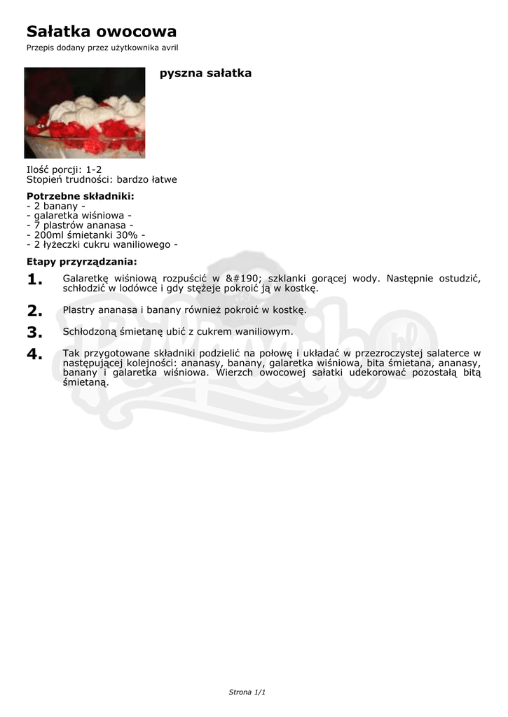 Sałatka owocowa Przepis dodany przez użytkownika avril pyszna sałatka Ilość porcji: 1-2 Stopień trudności: bardzo łatwe Potrzebne składniki: - 2 banany - galaretka wiśniowa - 7 plastrów ananasa - 200ml śmietanki 30% - 2 łyżeczki cukru waniliowego Etapy przyrządzania: 1. Galaretkę wiśniową rozpuścić w ¾ szklanki gorącej wody. Następnie ostudzić, schłodzić w lodówce i gdy stężeje pokroić ją w kostkę. 2. 3. 4. Plastry ananasa i banany również pokroić w kostkę. Schłodzoną śmietanę ubić z cukrem waniliowym. Tak przygotowane składniki podzielić na połowę i układać w przezroczystej salaterce w następującej kolejności: ananasy, banany, galaretka wiśniowa, bita śmietana, ananasy, banany i galaretka wiśniowa. Wierzch owocowej sałatki udekorować pozostałą bitą śmietaną. Strona 1/1
