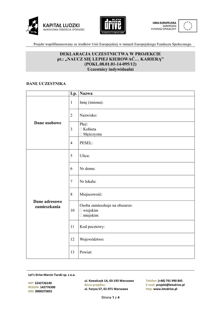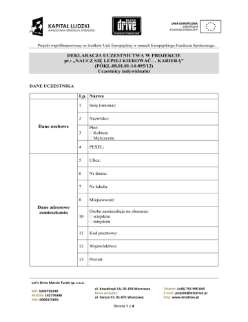 Projekt współfinansowany ze środków Unii Europejskiej w ramach Europejskiego Funduszu Społecznego. DEKLARACJA UCZESTNICTWA W PROJEKCIE pt.: „NAUCZ SIĘ LEPIEJ KIEROWAĆ… KARIERĄ” (POKL.08.01.01-14-095/12) Uczestnicy indywidualni DANE UCZESTNIKA Lp. Nazwa 1 Imię (imiona): 2 Nazwisko: 3 Płeć: Kobieta Mężczyzna 4 PESEL: 5 Ulica: 6 Nr domu: 7 Nr lokalu: 8 Miejscowość: 10 Osoba zamieszkuje na obszarze: wiejskim miejskim 11 Kod pocztowy: 12 Województwo: 13 Powiat: Dane osobowe Dane adresowe zamieszkania Let’s Drive Marcin Turski sp. z o.o. NIP: 5242726140 REGON: 142776390 KRS: 0000375855 ul. Kowalczyk 1A, 03-193 Warszawa Biuro projektu: ul. Farysa 57, 01-971 Warszawa Strona 1 z 4 Telefon: (+48) 791 990 845 E-mail: [email protected] http: www.letsdrive.pl Projekt współfinansowany ze środków Unii Europejskiej w ramach Europejskiego Funduszu Społecznego. 14 Telefon stacjonarny: 15 Telefon komórkowy: 16 17 Adres poczty elektronicznej (e-mail): Forma zatrudnienia: umowa o pracę, zlecenie lub umowa o dzieło samozatrudnienie właściciel wspólnik Zatrudniony w (nazwa i adres przedsiębiorstwa) : 18 …………….……………………………………………………….. ……………………………………………………………………… Dane dodatkowe – uzupełnić lub właściwe zakreślić 19 Wykonywany zawód: kierowca zawodowy, przedstawiciel handlowy, kierowca autokaru/busa, dostawca, kurier, osoba mobilna odpowiedzialna za kontakt z klientem, kadra zarządzająca, inny, jaki? …………………….. 20 Rodzaj szkolenia: szkolenie dla kierowców samochodów osobowych, szkolenia dla kierowców samochodów ciężarowych i typu bus. 21 Wykształcenie: podstawowe gimnazjalne ponadgimnazjalne pomaturalne wyższe Let’s Drive Marcin Turski sp. z o.o. NIP: 5242726140 REGON: 142776390 KRS: 0000375855 ul. Kowalczyk 1A, 03-193 Warszawa Biuro projektu: ul. Farysa 57, 01-971 Warszawa Strona 2 z 4 Telefon: (+48) 791 990 845 E-mail: [email protected] http: www.letsdrive.pl Projekt współfinansowany ze środków Unii Europejskiej w ramach Europejskiego Funduszu Społecznego. W związku z ubieganiem się o udział w Projekcie pt.:„Naucz się lepiej kierować … karierą” współfinansowanym ze środków Unii Europejskiej w ramach Europejskiego Funduszu Społecznego, realizowanym przez Let’s Drive Marcin Turski Sp. z o.o., na podstawie Umowy nr UDA-POKL.08.01.01-14-095/12-00 zawartej z Mazowiecką Jednostką Wdrażania Programów Unijnych w Warszawie, Ja niżej podpisana/podpisany wyrażam zgodę i deklaruję uczestnictwo w niniejszym Projekcie i oświadczam że: podane wyżej informacje dotyczące mojej osoby są zgodne z prawdą; potwierdzam zapoznanie się z „Regulaminem rekrutacji i uczestnictwa w Projekcie” i akceptuję postanowienia w nim zawarte; zgodnie z wymogami zawartymi w Regulaminie zostały spełnione kryteria uprawniające do udziału w projekcie; zostałem/łam poinformowany/a, że projekt jest współfinansowany ze środków Unii Europejskiej w ramach Europejskiego Funduszu Społecznego; wyrażam zgodę na upowszechnianie wizerunku w materiałach zdjęciowych, materiałach audiowizualnych i prezentacjach na potrzeby informacji i promocji Europejskiego Funduszu Społecznego. miejscowość i data czytelny podpis uczestnika projektu Let’s Drive Marcin Turski sp. z o.o. NIP: 5242726140 REGON: 142776390 KRS: 0000375855 ul. Kowalczyk 1A, 03-193 Warszawa Biuro projektu: ul. Farysa 57, 01-971 Warszawa Strona 3 z 4 Telefon: (+48) 791 990 845 E-mail: [email protected] http: www.letsdrive.pl Projekt współfinansowany ze środków Unii Europejskiej w ramach Europejskiego Funduszu Społecznego. OŚWIADCZENIE UCZESTNIKA PROJEKTU O WYRAŻENIU ZGODY NA PRZETWARZANIE DANYCH OSOBOWYCH W związku z przystąpieniem do Projektu „Naucz się lepiej kierować … karierą” (POKL.08.01.01-14095/12) realizowanego w ramach Programu Operacyjnego Kapitał Ludzki wyrażam zgodę na przetwarzanie moich danych osobowych. Oświadczam, iż przyjmuję do wiadomości, że: 1) administratorem tak zebranych danych osobowych jest Minister Infrastruktury i Rozwoju pełniący funkcję Instytucji Zarządzającej dla Programu Operacyjnego Kapitał Ludzki, ul. Wspólna 2/4, 00-926 Warszawa; 2) podstawę prawną przetwarzania moich danych osobowych stanowi art. 23 ust. 1 pkt 2 lub art. 27 ust. 2 pkt 2 ustawy z dnia 29 sierpnia 1997 r. o ochronie danych osobowych (tekst jednolity: Dz.U. z 2002 r. Nr 101 poz. 926, ze zm.) – dane osobowe są niezbędne dla realizacji Programu Operacyjnego Kapitał Ludzki 3) moje dane osobowe będą przetwarzane wyłącznie w celu udzielenia wsparcia, realizacji projektu „Naucz się lepiej kierować … karierą” (POKL.08.01.01-14-095/12), ewaluacji, kontroli, monitoringu i sprawozdawczości w ramach Programu Operacyjnego Kapitał Ludzki (POKL); 4) moje dane osobowe zostały powierzone do przetwarzania Instytucji Wdrażającej/Instytucji Pośredniczącej - Mazowieckiej Jednostce Wdrażania Programów Unijnych, ul. Jagiellońska 74, 03-301 Warszawa beneficjentowi realizującemu projekt – Let’s Drive Marcin Turski sp. z o.o., ul. Kowalczyka 1A, 03-193 Warszawa oraz podmiotom, które na zlecenie beneficjenta uczestniczą w realizacji projektu. Moje dane osobowe mogą zostać udostępnione firmom badawczym realizującym na zlecenie Instytucji Zarządzającej POKL, Instytucji Wdrażającej/Instytucji Pośredniczącej lub beneficjenta badania ewaluacyjne w ramach POKL oraz specjalistycznym firmom realizującym na zlecenie Instytucji Zarządzającej POKL lub Instytucji Wdrażającej/Instytucji Pośredniczącej kontrole w ramach POKL; 5) podanie danych jest dobrowolne, aczkolwiek odmowa ich podania jest równoznaczna z brakiem możliwości udzielenia wsparcia w ramach Projektu; 6) mam prawo dostępu do treści swoich danych i ich poprawiania. miejscowość i data czytelny podpis uczestnika projektu Let’s Drive Marcin Turski sp. 