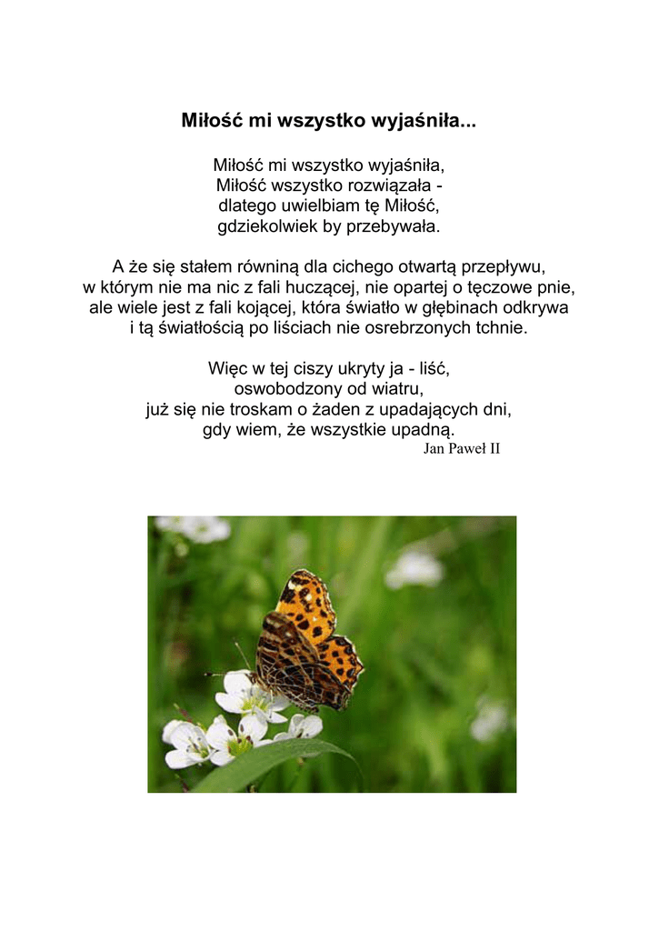 Miłość mi wszystko wyjaśniła... Miłość mi wszystko wyjaśniła, Miłość wszystko rozwiązała dlatego uwielbiam tę Miłość, gdziekolwiek by przebywała. A że się stałem równiną dla cichego otwartą przepływu, w którym nie ma nic z fali huczącej, nie opartej o tęczowe pnie, ale wiele jest z fali kojącej, która światło w głębinach odkrywa i tą światłością po liściach nie osrebrzonych tchnie. Więc w tej ciszy ukryty ja - liść, oswobodzony od wiatru, już się nie troskam o żaden z upadających dni, gdy wiem, że wszystkie upadną. Jan Paweł II