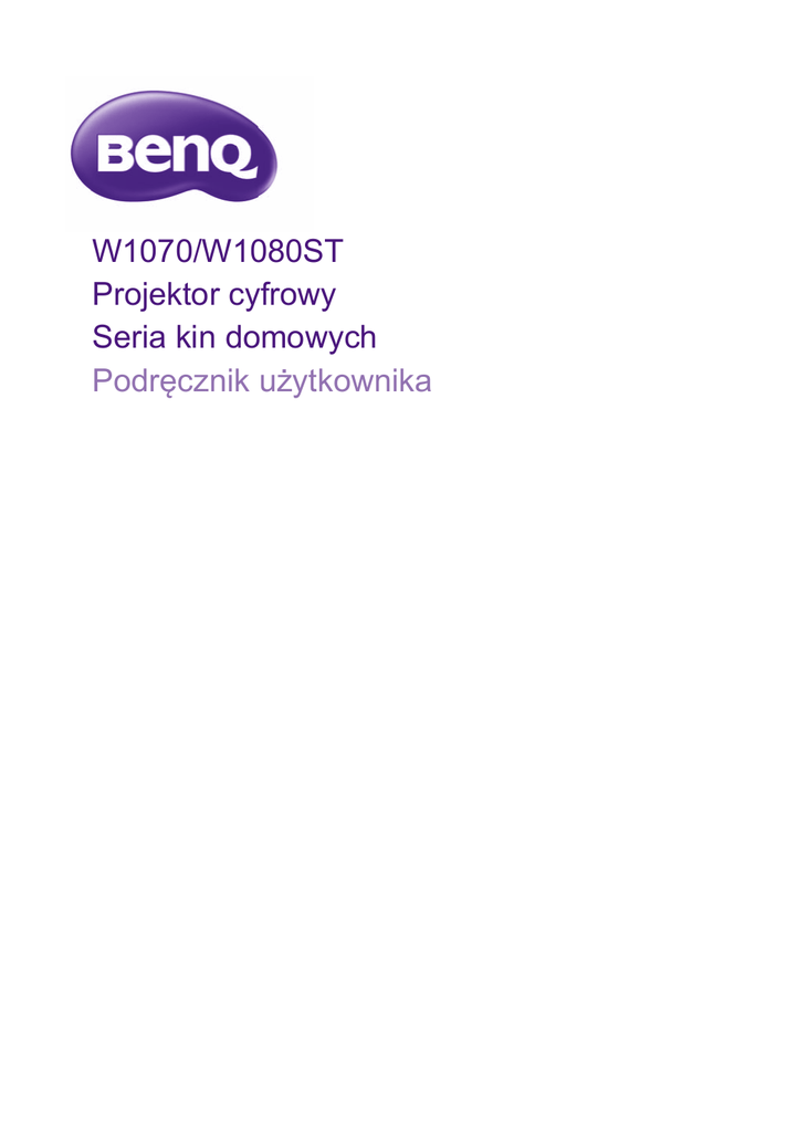 W1070/W1080ST Projektor cyfrowy Seria kin domowych Podręcznik użytkownika Spis treści Ważne instrukcje bezpieczeństwa..................... 3 Korzystanie z przewodu zabezpieczającego .......................... 26 Korzystanie z funkcji hasła .............. 27 Prezentacja ........................... 6 Regulacja wyświetlanego obrazu ......................................... 29 Zawartość zestawu ........................ 6 Wymiana baterii pilota.................... 7 Skuteczny zasięg pilota ................. 7 Funkcje projektora ......................... 9 Zewnętrzny widok projektora ....... 10 Elementy sterujące i funkcje ........ 11 Panel sterowania ..............................11 Pilot...................................................12 Ustawienie projektora.......... 13 Wybór miejsca ............................. 13 Uzyskiwanie preferowanego rozmiaru obrazu z projektora ....... 14 Jak określić położenie projektora dla danego rozmiaru ekranu...................14 Jak określić zalecany rozmiar ekranu dla określonej odległości ..................14 Rozmiary projekcji ............................16 Przesuwanie obiektywu projekcyjnego w pionie ............................................20 Podłączanie sprzętu wideo ................................... 21 Przygotowanie ..................................21 Podłączanie urządzeń HDMI ............21 Podłączanie urządzeń wideo komponentowego .............................22 Podłączanie urządzeń S-Video oraz wideo ................................................22 Podłączanie komputera ....................23 Użytkowanie projektora ....... 24 Włączanie projektora ................... 24 Wybór źródła sygnału .................. 25 Precyzyjna regulacja wielkości i wyrazistości obrazu.................... 25 Korzystanie z menu ..................... 26 Zabezpieczanie projektora........... 26 2 Spis treści Regulacja kąta projekcji .................. 29 Korekcja zniekształcenia obrazu ..... 29 Korzystanie z trybu standardowego oraz trybu użytkownika................ 30 Regulacja jakości obrazu ............ 31 Zaawansowana regulacja jakości obrazu ......................................... 33 Regulacja dźwięku ...................... 35 Wybór formatu obrazu................. 36 Powiększanie i wyszukiwanie szczegółów.................................. 37 Obsługa na dużych wysokościach .............................. 38 Wyświetlanie materiałów 3D ....... 38 Personalizacja wyświetlania menu projektora .................................... 39 Blokada przycisków sterowania .. 40 Wyłączanie projektora ................. 40 Menu ekranowe (OSD)................ 41 Informacje dodatkowe ......... 48 Jak dbać o projektor .................... 48 Informacje dotyczące lampy........ 49 Informacje dotyczące czasu użytkowania lampy .......................... 49 Przedłużanie trwałości lampy .......... 49 Czas wymiany lampy ....................... 50 Wymiana lampy ............................... 50 Kontrolki ...................................... 53 Rozwiązywanie problemów ......... 54 Dane techniczne.......................... 55 Gwarancja i informacje dotyczące prawa autorskiego.......................... 62 Dziękujemy za zakup wysokiej jakości projektora wideo firmy BenQ! Projektor został stworzony, aby zapewnić najwyższą jakość obrazu kina domowego. W celu uzyskania najlepszych wyników dokładnie zapoznaj się z niniejszym podręcznikiem zawierającym opis obsługi i pozycji menu. Ważne instrukcje bezpieczeństwa Projektor został zaprojektowany i przetestowany, aby spełniał najnowsze standardy bezpieczeństwa sprzętu elektronicznego i informatycznego. W celu zapewnienia bezpiecznego użytkowania produktu należy przestrzegać instrukcji zawartych w niniejszym podręczniku i oznaczeniach samego produktu. 4. Nie umieszczaj projektora w żadnym 1. Proszę przeczytać ten podręcznik przed z poniższych środowisk: rozpoczęciem korzystania z projektora. Zachowaj podręcznik w bezpiecznym miejscu w razie - słabo wentylowana lub ograniczona potrzeby odniesienia się do niego w przyszłości. przestrzeń. Zapewnij przynajmniej 50 cm prześwitu między ścianami i projektorem oraz swobodny przepływ powietrza wokół niego; - miejsca o tendencji do mocnego nagrzewania się, takie jak wnętrze samochodu z zamkniętymi szybami; - miejsca, w których elementy optyczne narażone będą na działanie wysokiej 2. Umieszczaj włączony projektor na równej, wilgotności, kurzu lub dymu poziomej powierzchni. papierosowego, powodujących - Nie umieszczaj projektora na niestabilnym skrócenie czasu użytkowania projektora wózku, stojaku lub stole, ponieważ może upaść i pociemnienie obrazu; i ulec uszkodzeniu; - Nie umieszczaj w pobliżu urządzenia żadnych materiałów łatwopalnych; - Nie korzystaj z projektora, jeśli jest odchylony o ponad 10 stopni w lewo lub w prawo lub ponad 15 stopni w tył lub w przód. 3. Nie stawiaj projektora na żadnym z boków, w pozycji pionowej. Może to spowodować jego przewrócenie się i doprowadzić do urazów użytkownika lub uszkodzenia urządzenia. - miejsca w pobliżu czujników pożarowych; - miejsca o temperaturze otoczenia powyżej 35°C / 95°F; - miejsca znajdujące się na wysokości powyżej 1500 m /4920 stóp n.p.m. 49209840 stóp Ważne instrukcje bezpieczeństwa 3 5. Nie zasłaniaj otworów wentylacyjnych, kiedy projektor jest włączony (nawet w stanie gotowości): - Nie przykrywaj projektora żadnym przedmiotem; - Nie stawiaj projektora na kocu, pościeli ani innej miękkiej powierzchni. 9. W czasie działania projektora nie patrz prosto w obiektyw. Możesz uszkodzić sobie wzrok. 6. W obszarach, gdzie napięcie w sieci waha się 10. Nie użytkuj lampy projektora po zakończeniu okresu eksploatacji. Eksploatacja lamp ponad w zakresie ±10 Wolt, zalecane jest przewidziany dla nich okres, może podłączenie projektora przez stabilizator w niektórych s