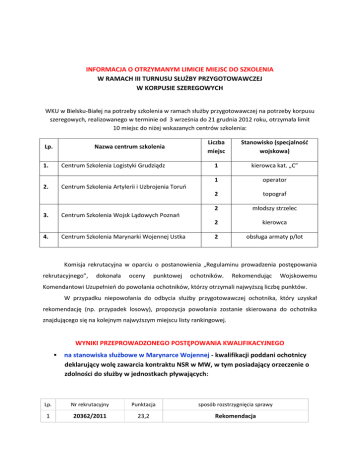 INFORMACJA O OTRZYMANYM LIMICIE MIEJSC DO SZKOLENIA W RAMACH III TURNUSU SŁUŻBY PRZYGOTOWAWCZEJ W KORPUSIE SZEREGOWYCH WKU w Bielsku-Białej na potrzeby szkolenia w ramach służby przygotowawczej na potrzeby korpusu szeregowych, realizowanego w terminie od 3 września do 21 grudnia 2012 roku, otrzymała limit 10 miejsc do niżej wskazanych centrów szkolenia: Lp. Nazwa centrum szkolenia 1. Centrum Szkolenia Logistyki Grudziądz 2. Centrum Szkolenia Artylerii i Uzbrojenia Toruń 3. Liczba miejsc Stanowisko (specjalność wojskowa) 1 kierowca kat. „C” 1 operator 2 topograf 2 młodszy strzelec 2 kierowca 2 obsługa armaty p/lot Centrum Szkolenia Wojsk Lądowych Poznań 4. Centrum Szkolenia Marynarki Wojennej Ustka Komisja rekrutacyjna w oparciu o postanowienia „Regulaminu prowadzenia postępowania rekrutacyjnego”, dokonała oceny punktowej ochotników. Rekomendując Wojskowemu Komendantowi Uzupełnień do powołania ochotników, którzy otrzymali najwyższą liczbę punktów. W przypadku niepowołania do odbycia służby przygotowawczej ochotnika, który uzyskał rekomendację (np. przypadek losowy), propozycja powołania zostanie skierowana do ochotnika znajdującego się na kolejnym najwyższym miejscu listy rankingowej. WYNIKI PRZEPROWADZONEGO POSTĘPOWANIA KWALIFIKACYJNEGO na stanowiska służbowe w Marynarce Wojennej - kwalifikacji poddani ochotnicy deklarujący wolę zawarcia kontraktu NSR w MW, w tym posiadający orzeczenie o zdolności do służby w jednostkach pływających: Lp. Nr rekrutacyjny Punktacja sposób rozstrzygnięcia sprawy 1 20362/2011 23,2 Rekomendacja do powołania 2 3 3131/2012 22,1 Rekomendacja do powołania 4059/2012 16,8 Brak limitu na stanowisko kierowcy kategorii „C” – kwalifikacji poddani wyłącznie ochotnicy posiadający uprawnienie do prowadzenia pojazdów kat. „C”: Lp. Nr rekrutacyjny Punktacja sposób rozstrzygnięcia sprawy 19575/2011 23.8 Rekomendacja do powołania 2 3131/2012 23,6 Brak limitu 3 3068/2012 23,2 Brak limitu 4 3827/2012 22,4 Brak limitu 5 6277/2012 19,5 Brak limitu 6 6279/2012 19.1 Brak limitu 7 6006/2012 18.7 Brak limitu 8 5150/2012 1 zawieszenie postępowania na wniosek strony Na pozostałe stanowiska służbowe – kwalifikacji poddani pozostali ochotnicy: Lp. Nr rekrutacyjny Punktacja sposób rozstrzygnięcia sprawy 1 2/2012 17.6 Rekomendacja do powołania 2 10334/2012 17,3 Rekomendacja do powołania 3 3068/2012 17.2 Rekomendacja do powołania 4 1/2012 17,2 Rekomendacja do powołania 5 8282/2012 17,2 Rekomendacja do powołania 6 3827/2012 16,8 Rekomendacja do powołania 7 10933/2012 16,5 Rekomendacja do powołania 8 2053/201 16,5 brak limitu 9 20219/2011 15,4 brak limitu 10 20239/2011 15,3 brak limitu 11 10853/2012 15,0 brak limitu 12 19885/2011 14,9 brak limitu 13 20224/2011 14,9 brak limitu 14 73/2012 14,9 brak limitu 15 19602/2011 14,6 brak limitu 16 8687/2012 14,2 brak limitu 17 3405/2012 14,1 brak limitu 18 385/2012 13,9 brak limitu 19 4291/2012 13,8 brak limitu 20 5328/2012 13,8 brak limitu 21 7625/2012 13,8 brak limitu 22 11605/2012 13,6 brak limitu 23 6277/2012 13,5 brak limitu 24 3606/2012 13,4 brak limitu 25 10577/2012 13,2 brak limitu 26 80/2012 13,1 brak limitu 27 6279/2012 13,1 brak limitu 28 12020/2012 13,1 brak limitu 29 714/2012 12,9 brak limitu 30 12109/2012 12,8 brak limitu 31 5917/2012 12,7 brak limitu 32 6006/2012 12,7 brak limitu 33 7802/2012 12,7 brak limitu 34 7803/2012 12,7 brak limitu 35 4727/2012 12,5 brak limitu 36 12014/2012 12,3 brak limitu 37 4059/2012 12,3 brak limitu 38 5168/2012 12,3 brak limitu 39 6700/2012 12,3 brak limitu 40 8806/2012 12,3 brak limitu 41 9791/2012 12,3 brak limitu 42 9817/2012 12,3 brak limitu 43 5176/2012 12,1 brak limitu 44 10615/2012 12,1 brak limitu 45 3989/2012 11,9 brak limitu 46 9293/2012 11,9 brak limitu 47 10986/2012 11,9 brak limitu 48 10985/2012 11,9 brak limitu 49 10984/2012 11,9 brak limitu 50 11330/2012 11,5 brak limitu 51 12021/2012 11,5 brak limitu 52 7688/2012 11,3 brak limitu 53 8517/2012 11,1 brak limitu 54 4190/2012 9,2 brak limitu 55 6278/2012 9,2 brak limitu 56 19034/2011 57 455/2012 58 5150/2012 Zawieszenie postępowania na wniosek strony Zawieszenie postępowania na wniosek strony Zawieszenie postępowania na wniosek strony