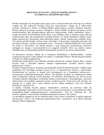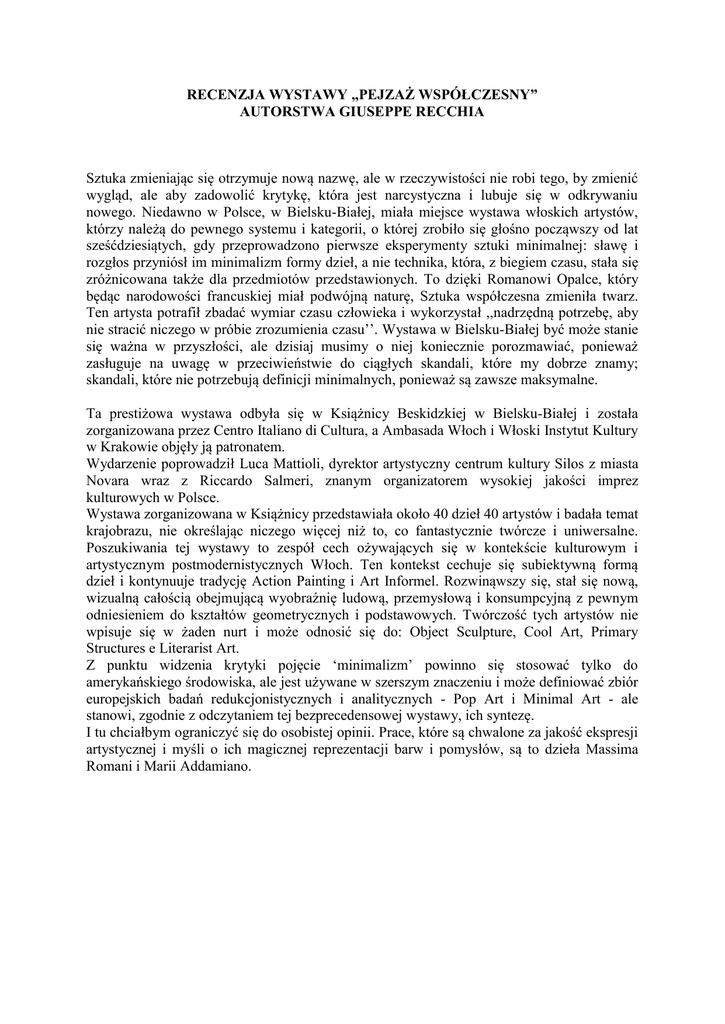 RECENZJA WYSTAWY „PEJZAŻ WSPÓŁCZESNY” AUTORSTWA GIUSEPPE RECCHIA Sztuka zmieniając się otrzymuje nową nazwę, ale w rzeczywistości nie robi tego, by zmienić wygląd, ale aby zadowolić krytykę, która jest narcystyczna i lubuje się w odkrywaniu nowego. Niedawno w Polsce, w Bielsku-Białej, miała miejsce wystawa włoskich artystów, którzy należą do pewnego systemu i kategorii, o której zrobiło się głośno począwszy od lat sześćdziesiątych, gdy przeprowadzono pierwsze eksperymenty sztuki minimalnej: sławę i rozgłos przyniósł im minimalizm formy dzieł, a nie technika, która, z biegiem czasu, stała się zróżnicowana także dla przedmiotów przedstawionych. To dzięki Romanowi Opalce, który będąc narodowości francuskiej miał podwójną naturę, Sztuka współczesna zmieniła twarz. Ten artysta potrafił zbadać wymiar czasu człowieka i wykorzystał ,,nadrzędną potrzebę, aby nie stracić niczego w próbie zrozumienia czasu’’. Wystawa w Bielsku-Białej być może stanie się ważna w przyszłości, ale dzisiaj musimy o niej koniecznie porozmawiać, ponieważ zasługuje na uwagę w przeciwieństwie do ciągłych skandali, które my dobrze znamy; skandali, które nie potrzebują definicji minimalnych, ponieważ są zawsze maksymalne. Ta prestiżowa wystawa odbyła się w Książnicy Beskidzkiej w Bielsku-Białej i została zorganizowana przez Centro Italiano di Cultura, a Ambasada Włoch i Włoski Instytut Kultury w Krakowie objęły ją patronatem. Wydarzenie poprowadził Luca Mattioli, dyrektor artystyczny centrum kultury Silos z miasta Novara wraz z Riccardo Salmeri, znanym organizatorem wysokiej jakości imprez kulturowych w Polsce. Wystawa zorganizowana w Książnicy przedstawiała około 40 dzieł 40 artystów i badała temat krajobrazu, nie określając niczego więcej niż to, co fantastycznie twórcze i uniwersalne. Poszukiwania tej wystawy to zespół cech ożywających się w kontekście kulturowym i artystycznym postmodernistycznych Włoch. Ten kontekst cechuje się subiektywną formą dzieł i kontynuuje tradycję Action Painting i Art Informel. Rozwinąwszy się, stał się nową, wizualną całością obejmującą wyobraźnię ludową, przemysłową i konsumpcyjną z pewnym odniesieniem do kształtów geometrycznych i podstawowych. Twórczość tych artystów nie wpisuje się w żaden nurt i może odnosić się do: Object Sculpture, Cool Art, Primary Structures e Literarist Art. Z punktu widzenia krytyki pojęcie ‘minimalizm’ powinno się stosować tylko do amerykańskiego środowiska, ale jest używane w szerszym znaczeniu i może definiować zbiór europejskich badań redukcjonistycznych i analitycznych - Pop Art i Minimal Art - ale stanowi, zgodnie z odczytaniem tej bezprecedensowej wystawy, ich syntezę. I tu chciałbym ograniczyć się do osobistej opinii. Prace, które są chwalone za jakość ekspresji artystycznej i myśli o ich magicznej reprezentacji barw i pomysłów, są to dzieła Massima Romani i Marii Addamiano.