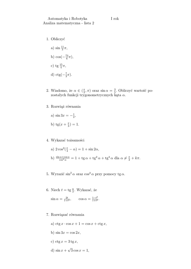 Automatyka i Robotyka Analiza matematyczna - lista 2 I rok 1. Obliczyć a) sin 11 π, 3 b) cos(− 73 π), 6 c) tg 15 π, 4 d) ctg(− 73 π). 2. Wiadomo, że α ∈ ( π2 , π) oraz sin α = 53 . Obliczyć wartość pozostałych funkcji trygonometrycznych kąta α. 3. Rozwiąż równania a) sin 3x = − 12 , b) tg(x + π3 ) = 1. 4. Wykazać tożsamości a) 2 cos2 ( π4 − α) = 1 + sin 2α, b) sin α+cos α cos3 α = 1 + tg α + tg2 α + tg3 α dla α 6= 5. Wyrazić sin2 α oraz cos2 α przy pomocy tg α. 6. Niech t = tg α2 . Wykazać, że sin α = 2t , 1+t2 cos α = 1−t2 . 1+t2 7. Rozwiązać równania a) ctg x · cos x + 1 = cos x + ctg x, b) sin 3x = cos 2x, c) ctg x = 3 tg x, d) sin x + √ 3 cos x = 1, π 2 + kπ. e) 2 cos2 x − 5 cos x + 2 = 0. 8. Naszkicować wykresy funkcji a) y = sin 2x, b) y = cos(x + π4 ), c) y = tg x · ctg x, d) y = sin x + cos x, e) y = sin2 x. Bogusław Merdas, Grzegorz Mielczarek