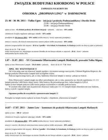 ZWIĄZEK BUDDYJSKI KHORDONG W POLSCE ZAPRASZA NA KURSY DO OŚRODKA „DROPHAN LING” w DARNKOWIE 23. 06 - 30. 06. 2011 – Tulku Ugen - inicjacja i praktyka Padmasambhawy i Dordże Drolo 23.06 – inicjacja Padmasambhawy 25.06 – inicjacja Dordże Drolo opłata za kurs - 45 zł/dzień praktyk, 60 zł/dzień inicjacji + jedzenie, cały kurs - 10% zniżki członkowie Związku regularnie opłacający składki - 10% zniżki przedpłata do 10 czerwca 2011 - 10% zniżki (zniżka dotyczy kwoty wpłaconej przedpłaty) emeryci i renciści, dla których emerytura/renta stanowi jedyne źródło utrzymania - 30% zniżki jedzenie (wegetariańskie lub mięsne) - 28 zł za 3 posiłki = 16 zł obiad, 6 zł śniadanie, 6 zł kolacja (zniżki nie dotyczą opłat za jedzenie) dzieci do lat 10 - 7 zł./ dzień osoby towarzyszące tzn. mieszkające na terenie Ośrodka ale nie biorące udziału w zajęciach - 20 zł. / dzień + jedzenie maksymalna łączna zniżka 50% ------------------------------------------------------------------------------------------------------------------------------------------------------- 1.07 – 31.07. 2011 - XV Ceremonia Ofiarowania Lampek Maślanych, prowadzi Tulku Migme. opłata za kurs Ofiarowania Lampek – 20 zł/ dzień + jedzenie, dzieci do lat 10 - 7 zł./ dzień APEL DO WSZYSTKICH !!! Od 14 lat udaje nam się ofiarować lampki zgodnie z życzeniem naszego nauczyciela, Chhimed Rigdzina Rinpocze, dla którego praktyka Ofiarowania Lampek była szczególnie ważna. Podczas tegorocznego kursu, jak co roku, będziemy ofiarować lampki w intencji pokoju na świecie. Żeby Ofiarowanie Lampek mogło się odbyć potrzebujemy, jak co roku, sponsorów na: olej (do napełnienia 111.111 lampek potrzeba 3.400 litrów oleju), knoty i bilet lotniczy dla prowadzącego kurs. Jedna lampka to 0,20 zł Opłata za kurs lampek pokrywa tylko koszty pobytu uczestników w ośrodku podczas kursu. W zeszłym roku udało nam się ponownie ofiarować tradycyjne 111 111 lampek dzięki ofiarodawcom oraz ludziom, którzy czyścili i zapalali lampki. Ogromna prośba do wszystkich o sponsorowanie lampek !!! Pieniądze na lampki można wpłacać na konto Związku z dopiskiem „Darowizna na lampki” ------------------------------------------------------------------------------------------------------------------------------------------- 14.07 – 17.07. 2011 - James Low - komentarz do praktyki Ofiarowania Lampek Maślanych opłata za kurs – 180 zł + jedzenie członkowie Związku regularnie opłacający składki - 10% zniżki przedpłata do 10 czerwca 2011 - 10% zniżki (zniżka dotyczy kwoty wpłaconej przedpłaty) emeryci i renciści, dla których emerytura/renta stanowi jedyne źródło utrzymania - 30% zniżki jedzenie (wegetariańskie lub mięsne) - 28 zł za 3 posiłki = 16 zł obiad, 6 zł śniadanie, 6 zł kolacja (zniżki nie dotyczą opłat za jedzenie) dzieci do lat 10 - 7 zł./ dzień osoby towarzyszące tzn. mieszkające na terenie Ośrodka ale nie biorące udziału w zajęciach - 20 zł. / dzień + jedzenie 1.08 – 31. 08. 2011 – J.Ś. Taklung Tsetrul Rinpocze – w tym roku prosiliśmy Rinpocze o: przekaz Dypa`I Do Pemy Trinleya z Ningma Kama (Dypa`I Do albo inaczej Do Gongpa Dypa - Sutra Jednocząca Wszystkie Intencje lub Sutra Jednocząca Umysły Wszystkich Buddów to jedna z czterech rdzennych tantr Anujogi. Inicjacje do niej dawane są niezmiernie rzadko. Komentarz do inicjacji napisany został przez jednego z głównych lamów tradycji Dziangter, Rigdzina Pema Trinle na prośbę Piątego Dalajlamy. Do Gongpa Dypa należy do linii Kama, czyli długiego ustnego przekazu, nauk przekazywanych od nauczyciela do ucznia. Rinpocze powiedział ze udzieli inicjacji Do Gongpa Dypa, ponieważ jest to jeden z najważniejszych tekstów w linii Kama) , inicjacje Tse Gur Drag Ma (gniewne dakinie Sengdongma, Kurukula i Vadzrawarahi) i Lha Chen Rigdzina Godema oraz o nauki do praktyki Vajrakilaya i nauki o Bardo. (strażnik Mahadewa) Uwaga! data rozpoczęcia kursu z Rinpocze może się zmienić o kilka dni opłata za kurs - 60 zł/dzień + jedzenie, cały kurs - 10% zniżki członkowie Związku regularnie opłacający składki - 10% zniżki przedpłata do 20 czerwca 2011 - 10% zniżki (zniżka dotyczy kwoty wpłaconej przedpłaty) emeryci i renciści, dla których emerytura/renta stanowi jedyne źródło utrzymania - 30% zniżki jedzenie (wegetariańskie lub mięsne) - 28 zł za 3 posiłki = 16 zł obiad, 6 zł śniadanie, 6 zł kolacja (zniżki nie dotyczą opłat za jedzenie) dzieci do lat 10 - 7 zł./ dzień osoby towarzyszące tzn. mieszkające na terenie Ośrodka ale nie biorące udziału w zajęciach - 20 zł. / dzień + jedzenie maksymalna łączna zniżka 50% -------------------------------------------------------------------------------------------------------------------------------------------------------ZGŁOSZENIA NA KURSY NALEŻY PRZYSYŁAĆ MAILEM w TERMINACH: (formularz zgłoszeniowy dostępny jest na naszej stronie www.khordong.pl ) KURS Z TULKU UGENEM do 10 czerwca 2011 OFIAROWANIE LAMPEK do 20 czerwca 2011 KURS Z JAMESEM LOW do 1 lipca 2011 KURS Z RINPOCZE do 20 lipca 2011 Osoby bez zgłoszenia nie będą miały zapewnionych noclegów ani wyżywienia !!! Zgłoszenie musi zawierać: imię i nazwisko, datę przyjazdu i wyjazdu, rodzaj noclegu, rodzaj wyżywienia: ile posiłków i jakie – mięsne czy wegetariańskie Noclegi : - w starym dormitorium, 35 miejsc (kolejność zgłoszeń) - w nowym dormitorium nad jadalnią, 20 miejsc (kolejność zgłoszeń) - w namiotach własnych/przyczepach kempingowych na przygotowanym polu namiotowym - noclegi na 1 piętrze gompy TYLKO PODCZAS KURSU Z TULKU UGENEM oraz OFIAROWANIA LAMPEK !!! w pokojach, za dopłatą 10zł/dzień/osobę – 17 miejsc, pierwszeństwo mają osoby starsze, z problemami zdrowotnymi (kolejność zgłoszeń) - osoby zakwaterowane poza terenem ośrodka - zniżka 10 zł dziennie Uwagi : - noce w górach, nawet w lecie 
