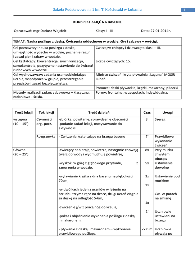 Szkoła Podstawowa nr 1 im. T. Kościuszki w Lubaniu 1 KONSPEKT ZAJĘĆ NA BASENIE Opracował: mgr Dariusz Wajcfelt Klasy: I - III Data: 27.01.2014r. TEMAT: Nauka poślizgu z deską. Ćwiczenia oddechowe w wodzie. Gry i zabawy – wyścigi. Cel poznawczy: nauka poślizgu z deską, umiejętność wydechu w wodzie, poznanie reguł i zasad gier i zabaw w wodzie. Cel kształcący: koncentracja, synchronizacja, samokontrola, pozytywne nastawienie do ćwiczeń ruchowych w wodzie . Cel wychowawczy: zadania usamodzielniające ucznia, współpraca w grupie, przestrzeganie przepisów i zasad bezpieczeństwa. Metody realizacji zadań: zabawowa – klasyczna, zadaniowa - ścisła, Treść lekcji wstępna (10 – 15’) Tok lekcji Czynności org.-porz. Ćwiczący: chłopcy i dziewczęta klas I – III. Liczba ćwiczących: 15. Miejsce ćwiczeń: kryta pływalnia „Laguna” MOSiR Lubań. Pomoce: deski pływackie, krążki. makarony, piłeczki Formy: frontalna, w zespołach, indywidualna. Treść działań Czas -zbiórka, powitanie, sprawdzenie obecności -podanie zadań lekcji, motywowanie do aktywności Rozgrzewka - Ćwiczenia kształtujące na brzegu basenu Główna (20 – 25’) 3’ Szereg 7’ Prawidłowe wykonanie ćwiczeń Przy murku chwytem oburącz Ustawienie dowolne -ćwiczący nabierają powietrze, następnie chowają twarz do wody i wydmuchują powietrze, 8x -wyskoki w górę z głębokiego przysiadu, zanurzenia w wodzie, 5x z -wyławianie krążka z dna basenu na głębokości 70cm, Uwagi 3x Ustawienie pod murkiem 1x -w dwójkach jeden z uczniów w leżeniu na brzuchu trzyma ręce na desce, drugi uczeń ciągnie za deskę na odległość 5-6m, Ćw. W parach na zmianę 1x -ćwiczenie j/w z pracą nóg do kraula, 2’ -pokaz i objaśnienie wykonania poślizgu z deską i makaronem, - pływanie z deską i makaronem – wykonanie prawidłowego poślizgu, Uczniowie ustawieni na brzegu 2x25m Uczniowie pływają po Szkoła Podstawowa nr 1 im. T. Kościuszki w Lubaniu - ćwiczenia oddechowe – dmuchanie piłeczek po wodzie, Końcowa (5 – 10’) - gry i zabawy w wodzie. Czynności -wyjście z wody, ustawienie w szeregu, porządkowe -omówienie i ocena zajęć , -mycie, suszenie i ubieranie w szatni. 2 2x25m torach, korekcja 5’ Podział na 2 zespoły 10’ n-l nagradza uczniów za zaangażowanie, motywuje do dalszej nauki.