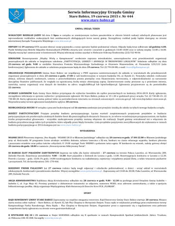Serwis Informacyjny Urzędu Gminy Stare Babice, 19 czerwca 2015 r. Nr 444 www.stare-babice.pl GMINA, URZĄD, TEREN WAKACYJNY ROZKŁAD JAZDY Od dnia 1 lipca w związku ze zmniejszonym ruchem pasażerskim w okresie letnich wakacji szkolnych planowane jest wprowadzenie rozkładów wakacyjnych linii autobusowych obsługujących teren naszej gminy. Szczegółowy rozkład jazdy będzie dostępny na stronie internetowej Zarządu Transportu Miejskiego www.ztm.waw.pl ODPADY Od 29 czerwca SITA zacznie zbierać swoje pojemniki, a nowy operator będzie podstawiać własne. Odpady będą teraz odbierane od godziny 6.00. Punkt Selektywnej Zbiórki Odpadów Komunalnych (PSZOK) otwarty jest: wtorek i czwartek w godzinach 14.00-18.00 oraz w sobotę między 12.00 a 16.00. Odpady muszą być umieszczone w kontenerach. Więcej informacji można uzyskać w Referacie Ochrony Środowiska: (22) 722 90 06 SZKOLENIE Stowarzyszenie ,,Między Wisłą a Kampinosem’’ serdecznie zaprasza mieszkańców, samorządowców oraz przedstawicieli organizacji pozarządowych do udziału w bezpłatnym szkoleniu ,,PARTYCYPACJA, LIDERZY I ANIMACJA W ŚRODOWISKU LOKALNYM’’ Szkolenie odbędzie się dnia 23 czerwca od godz. 9:00 w siedzibie Starostwa Powiatu Warszawskiego Zachodniego w Ożarowie Mazowieckim, ul. Poznańska 129/133 (sala konferencyjna). Zgłoszenia do udziału w szkoleniu przyjmowane będą do dnia 19 czerwca. Tel. 22 794 04 88, e-mail: [email protected]. ORGANIZACJE POZARZĄDOWE Gmina Stare Babice we współpracy z PWZ zaprasza zainteresowanych do udziału w warsztatach dla przedstawicieli organizacji pozarządowych w dniu 23 czerwca o godz. 17.00 w sali konferencyjnej w nowym budynku UG, ul. Rynek 21. Tematyka szkoleń: rozliczanie dotacji, ochrona danych osobowych, ustawa o przeciwdziałaniu praniu pieniędzy oraz finansowaniu terroryzmu, o odpowiedzialności za naruszenie dyscypliny finansów publicznych. Ze względu na ograniczoną liczbę miejsc obowiązują zapisy. Zainteresowane osoby proszone są o przesłanie imienia, nazwiska, nazwy organizacji oraz danych do kontaktu na adres: [email protected] lub [email protected]. Zgłoszenia przyjmowane są do poniedziałku 22 czerwca. WYBORY ŁAWNIKÓW Rada Gminy Stare Babice przystępuje do wyborów ławników do sądów powszechnych na kadencję 2016-2019. Karty zgłoszenia, szczegółowe informacje w sprawie wyborów i przyjmowanie zgłoszeń: UG Stare Babice, pokoje nr 15 i 28 w godzinach pracy urzędu. Tel. 22 730-80-15; 22 730-80-28. Kartę zgłoszenia można pobrać także za pośrednictwem internetu na stronach oznaczonych: www.ms.gov.pl lub www.bip.babice-stare.waw.pl. Nieprzekraczalny termin zgłaszania kandydatów upływa 30 czerwca. REORGANIZACJA RUCHU W związku z pracami budowlanymi od 16 czerwca zamknięte jest przejście ścieżką do szkoły na tyłach nowego budynku urzędu. BUDŻET PARTYCYPACYJNY Przyjęto projekty budżetu partycypacyjnego. Łączna wartość zaopiniowanych pozytywnie projektów w budżecie partycypacyjnym nie przekroczyła ustalonych limitów kwot dla poszczególnych obszarach. Oznacza to, że wbrew wcześniejszym przypuszczeniom, nie będzie trzeba przeprowadzać głosowania – wszystkie zaakceptowane projekty zostaną włączone do realizacji. Zespół gminny wnioskował też o włączenie do budżetu przyszłorocznego także tych projektów, które odpadły przez błędy formalne. Lista projektów pozytywnie zweryfikowanych do wykonania w ramach budżetu partycypacyjnego w 2016 dostępna jest na www.stare-babice.pl WYDARZENIA WIANKI 2015 Plenerowa impreza „Noc Kupały - WIANKI 2015 w Bliznem Jasińskiego” odbędzie się 20 czerwca w godz. 17.00-22.00 w Bliznem Jasińskiego przy ul. Kościuszki. W programie liczne atrakcje: wróżbita Antonio, zabawa taneczna z DJ-em, konkurs na ciasto własnego wypieku, konkurs plecenia i puszczania wianków oraz pokaz tańców celtyckich. O 19.00 wystąpi Teatr WIDMO z pokazem tańca ognia. W konkursie na wianek, należy gotowy złożyć 20 czerwca do godz. 18.00 w namiocie „Stowarzyszenia Odkrywamy Świat”. III BABICKI ZLOT POJAZDÓW ZABYTKOWYCH Impreza nie tylko dla fanów oldmobili – 27 czerwca na terenie Pałacu Lasotów, ul. Warszawska 289, Zielonki Parcele. Rejestracja zawodników: 9.00 – 11.00. Start pojazdów z Zielonek do Leszna o godz. 11.00. Rozstrzygnięcie konkursu w Lesznie o 12.30. Powrót z Leszna – godz. 13.00. Po godz. 14.00 rozstrzygnięcie konkursu na najładniejszy, najstarszy i wyjątkowy pojazd Zlotu, a także wręczenie pucharów i poczęstunek. Tel. do koordynatora: 501-170-466. RODZINNY PIKNIK PAŁACOWY Już 27 czerwca rodzice będą mogli odpocząć i szlachecko pobiesiadować, a dzieci - wziąć udział w warsztatach edukacyjnych, konkursach i poszukiwaniu skarbów. Więcej szczegółów www.palaclasotow.pl . Zapraszamy od 13:00 do 20:00, Pałac Lasotów, ul. Warszawska 289, Zielonki Parcele. AKCJA KRWIODAWSTWA Najbliższa Akcję Krwiodawstwa odbędzie się 28 czerwca w godz. 9.00 - 12.30 na parkingu przed Urzędem Gminy Izabelin – Izabelin C, ul. 3-go Maja 42. Prosimy pamiętać o dokumencie tożsamości ze zdjęciem, numerem PESEL oraz adresem zamieszkania, a także o spożyciu lekkostrawnego posiłku. Akcję organizuje Międzygminny Klub Honorowych Dawców Krwi PCK „FLORIAN”. SPORT RAJD ROWEROWY GMINY STARE BABICE Zapraszamy na wspólne zmagania rowerowe. Rajd Rowerowy Gminy Stare Babice startuje 20 czerwca. Miejsce startu można sobie wybrać – Stare Babice, ul. Rynek 32, lub Plac Chopina w Borzęcinie Dużym. Trasa rajdu w większości przebiega przez malownicze tereny Kampinoskiego Parku Narodowego. Meta Rajdu – Plac Chopina w Borzęcinie Dużym. Organizator prosi o zapoznanie się z regulaminem oraz pobranie i wypełnienie karty zgłoszenia na stronie www.gosirstarebabice.pl. II SPOTKANIE KSJ 20 i 21 czerwca w Stajni SAWANKA odbędzie się II spotkanie w ramach Kampinoskich Spotkań Jeździeckiech. Adres: Truskaw, ul. Północ