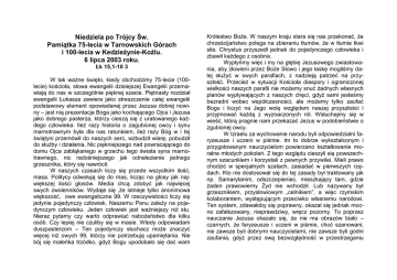 Niedziela po Trójcy Św. Pamiątka 75-lecia w Tarnowskich Górach i 100-lecia w Kedzieżynie-Koźlu. 6 lipca 2003 roku. Łk 15,1-10 3 W tak ważne święto, kiedy obchodzimy 75-lecie (100lecie) kościoła, słowa ewangelii dzisiejszej Ewangelii przemawiają do nas w szczególnie pięknej szacie. Piętnasty rozdział ewangelii Łukasza zawiera jako streszczenie całej ewangelii podstawowy element opowiadanej przez Jezusa dobrej nowiny – jest nią prezentacja Boga jako kochającego Ojca i Jezusa jako dobrego pasterza, którzy cieszą się z uratowanego każdego człowieka. Ileż razy historia o zagubionej owcy i synu marnotrawnym była dla nas ratunkiem, ileż razy Bóg w i tej świątyni przemówił do naszych serc, wzbudził wiarę, pobudził do służby i działania. Nic piękniejszego nad powracającego do domu Ojca zabłąkanego w grzechu tego świata syna marnotrawnego, nic radośniejszego jak odnalezienie jednego grzesznika, który się nawrócił. W naszych czasach liczy się przede wszystkim ilość, masa. Politycy odwołują się do mas, licząc na głosy jak największej ilości głosów. Media chcą zdobyć jak najwięcej swych zwolenników. Wydaje się ,że istnieje tylko anonimowa większość, owe ewangeliczne 99. W rzeczywistości liczy się jedynie pojedynczy człowiek. Naszemu Panu zależy na pojedynczym człowieku. Jeden człowiek jest ważniejszy niż stu. Nieraz pytamy czy warto odprawiać nabożeństwo dla kilku osób. Czy lepiej nie czuliby się w masie. Wtedy odpowiadam duszpasterzom – Ten pojedynczy słuchacz może znaczyć więcej niż owych 99, którzy nie potrzebują upamiętania. Nie bój się maleńka trzódko, gdyż Bogu upodobało się dać wam Królestwo Boże. W naszym kraju stara się nas przekonać, że chrześcijaństwo polega na zbieraniu tłumów, że w tłumie tkwi siła. Chrystus przyszedł jednak do pojedynczego człowieka i zbawił każdego z osobna. Wypłyńmy więc i my na głębię Jezusowego zwiastowania, aby złowieni przez Boże Słowo i jego łaskę mogliśmy dalej służyć w swych parafiach, z nadzieją patrzeć na przyszłość. Przecież w sytuacji Kościoła diaspory i ograniczonej wielkości naszych parafii nie możemy snuć żadnych własnych planów wypływających z naszych chęci, gdyż sami jesteśmy bezradni wobec współczesności, ale możemy tylko zaufać Bogu i liczyć na Jego wolę względem naszej przyszłości i przyjmować każdą z wyznaczonych ról. Wsłuchajmy się w wieść, którą pragnie nam przekazać Jezus w podobieństwie o zgubionej owcy. W Izraelu za wychowanie narodu byli odpowiedzialni faryzeusze i uczeni w piśmie. Im to dobrze wykształconym i przygotowanym nauczycielom powierzano kształtowanie moralne młodych pokoleń. Z tego względu cieszyli się powszechnym szacunkiem i korzystali z pewnych przywilei. Mieli prawo chodzić w specjalnych szatach, zasiadać w pierwszych rzędach. Kto nie dostosował się do tej zasady był traktowany jak np. Samarytanim, odszczepieniec, mieszkający tam, gdzie żaden prawowierny Żyd nie wchodził. Lub nazywany był grzesznikiem, przysłowiowym „celnikiem”, a więc rzymskim kolaborantem, występującym przeciwko własnemu narodowi. Ten system, zdawałoby się poprawny, okazał się jednak mocno zafałszowany, nieprawdziwy, wręcz pozorny. To poprzez nauczanie Jezusa okazało się, że nie ma obrazów biało – czarnych, że faryzeusze i uczeni w piśmie, choć szanowani, nie zawsze byli dobrymi nauczycielami, nie zawsze byli godni zaufania, gdyż przez swą bezwzględność w przestrzeganiu zakonu wyzbywali się miłości i stawali się bezdusznymi egoistami, zaś grzesznicy i celnicy nie do końca byli automatycznie pozbawieni serca i współczucia. Jezus, który przecież nie przyszedł po to, aby skrytykować faryzeuszy a pochwalić grzeszników, ale przyszedł, aby ludzkiemu życiu nadać autentyzm, a stosunkom między Bogiem a ludźmi przywrócić nowy, prawdziwy sens. To co robi Chrystus jest w konsekwencji burzeniem stereotypów myślenia i uprzedzeń a budowaniem nowych relacji miedzy Człowiekiem i Bogiem w dziele zbawienia. Takie działanie zagrażało staremu porządkowi, wytworzonemu przez faryzeuszy i uczonych w piśmie, dlatego przeciwko Jezusowi występowali i zaprowadzili go aż na Golgotę, ale równocześnie ta postawa Jezusa napawa nadzieją, że Bóg ocenia człowieka obiektywnie, że nie można żyć na pokaz, że Bóg w Jezusie Chrystusie szuka każdego zagubionego, ratuje go i przygarnia do siebie. Takie zwiastowanie jest dzisiaj bardzo potrzebne, kiedy tyle wokół nas tylko deklaratywnego chrześcijaństwa, chrześcijaństwa na pokaz, kiedy tak mocno pomieszali się owi „faryzeusze” z grzesznikami i celnikami, kiedy tak wielu wychodzi z domu Ojca, odłącza się od stada a potem nie ma sił, aby o własnych siłach zawrócić i powrócić. Człowiek jest tyle wart ile znaczy w oczach Bożych. Choć na ziemi musimy się liczyć z opiniami ludzi, to przecież w konsekwencji liczy się co powie Bóg. Wartość człowieka nie jest mierzona ilością majątku i bogactwa, czy pozycją społeczną. Jesteśmy własnością Chrystusa, on dla nas przyszedł na świat, on za nas cierpiał i umarł, aby dać nam życie wieczne. On też umie właściwie ocenić, niezależnie od masek, jakie założymy czy przypominamy faryzeuszy czy ewangelicznych grzeszników, umiejących wyznać – „Bądź miłościw mnie grzesznemu”. On też przygotowuje nam, jak przygotowywał naszym poprzednim pokoleniom, godną duchową przyszłość, która może również wpływać na rodzaj życia na ziemi. Tak więc Chrystus nas dzisiaj woła. On jest zapraszającym nie z wysokości chwały, ale ze stanu swego uniżenia, stąd jego opieka nad nami, troska o życie cielesne i duchowe. Praca pasterska w Palestynie nie należała do łatwych. Judzkie pastwiska były niebezpieczne – nocami słychać było wycie hien, w dzień niewiele było zielonej trawy, chyba 