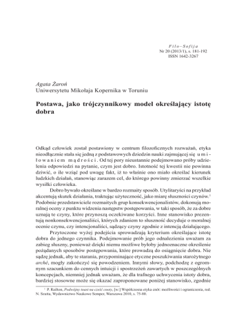 Filo–Sofija Nr 20 (2013/1), s. 181-192 ISSN 1642-3267 Agata Żaroń Uniwersytetu Mikołaja Kopernika w Toruniu Postawa, jako trójczynnikowy model określający istotę dobra Odkąd człowiek został postawiony w centrum filozoficznych rozważań, etyka nieodłącznie stała się jedną z podstawowych dziedzin nauki zajmującej się u m i ł o w a n i e m m ą d r o ś c i . Od tej pory nieustannie podejmowano próby udzielenia odpowiedzi na pytanie, czym jest dobro. Istotność tej kwestii nie powinna dziwić, o ile wziąć pod uwagę fakt, iż to właśnie ono miało określać kierunek ludzkich działań, stanowiąc zarazem cel, do którego powinny zmierzać wszelkie wysiłki człowieka. Dobro bywało określane w bardzo rozmaity sposób. Utylitaryści na przykład akcentują skutek działania, traktując użyteczność, jako miarę słuszności czynów.1 Podobnie przedstawiciele rozmaitych grup konsekwencjonalistów, dokonują moralnej oceny z punktu widzenia następstw postępowania, w taki sposób, że za dobre uznają te czyny, które przynoszą oczekiwane korzyści. Inne stanowisko prezentują nonkonsekwencjonaliści, których zdaniem to słuszność decyduje o moralnej ocenie czynu, czy intencjonaliści, sądzący czyny zgodnie z intencją działającego. Przytoczone wyżej podejścia sprowadzają kryterium określające istotę dobra do jednego czynnika. Podejmowanie prób jego odnalezienia uważam za zabieg słuszny, ponieważ dzięki niemu możliwe byłoby jednoznaczne określenie pożądanych sposobów postępowania, które prowadzą do osiągnięcie dobra. Nie sądzę jednak, aby te starania, przypominające etyczne poszukiwania starożytnego arché, mogły zakończyć się powodzeniem. Innymi słowy, podchodzę z ogromnym szacunkiem do cennych intuicji i spostrzeżeń zawartych w poszczególnych koncepcjach, niemniej jednak uważam, że dla trafnego uchwycenia istoty dobra, bardziej stosowne może się okazać zaproponowane poniżej stanowisko, zgodnie 1 P. Railton, Podwójny toast na cześć cnoty, [w:] Współczesna etyka cnót: możliwości i ograniczenia, red. N. Szutta, Wydawnictwo Naukowe Semper, Warszawa 2010, s. 75-80. 182 AGATA ŻAROŃ z którym realizacja dobra w jego pełnym rozumieniu zakłada uwzględnienie trzech czynników – emocjonalnego, poznawczego i behawioralnego. Trudno zaprzeczyć, że samo posiadanie dobrych intencji, jako pragnienia postępowania w sposób dobry, odczuwania emocji, skłaniających wolę do właściwego postępowania, jest raczej dobre, niż złe. Nie zgadzam się jednak, by nazywać je dobrymi w sposób ostateczny, ale dobrymi o tyle, o ile przyczyniają się one do realizacji dobra. Innymi słowy, można by je nazwać dobrymi, ale nie dobrem. Podobnie rzecz ma się z przekonaniami. Stanowiska – odnoszące się przede wszystkim do kwestii moralnych – mają niebagatelny wpływ na realizację dobra. I w tym przypadku nie można ich jednak nazwać dobrem, ale dobrymi o tyle, o ile prowadzą do dobra. Trzeci z czynników, który – zgodnie z prezentowana koncepcją – powinien być uwzględniony, polega na skłonności do realizacji dobrego czynu, która przejawia się w działaniu. Ten ostatni warunek może być spełniony przy pominięciu wcześniej wymienionych czynników, nabierając przy tym przypadkowego charakteru. W takich okolicznościach nadal można mówić o zachowaniu, czy postępowaniu, które jest dobre, ale analogicznie do wcześniejszych sytuacji, nie może być mowy o realizacji dobra, które zostaje spełnione dopiero wtedy, kiedy wspomniane powyżej czynniki, tj. emocje, intelekt i czyn zostają ze sobą zestrojone. Fakt, że nie można mówić o dobru, jeżeli nie stanowi ono rzeczywistej konsekwencji podejmowanego działania, zdaje się nie podlegać dyskusji. Nie może tego zmienić przekonanie o słuszności postępowania, ani najlepsze intencje. W związku z tym, warunek polegający na spełnieniu dobrych czynów zdaje się być centralną kwestią dla określenia jego istoty. Nie można także pominąć faktu, że to przede wszystkim akt godzi w drugiego człowieka powodując krzywdę, która staje się często przyczyną zła. Należy jednocześnie uwzględnić cały szereg aspektów, które wpływają na sposób postępowania, wliczając również te, które nie podlegają świadomej kontroli. Z drugiej strony należy jasno zaznaczyć, że konsekwencje czynu nie znajdują się pod bezpośrednim wpływem działającego i dlatego nie podlegają moralnemu doskonaleniu. W związku z tym, należy także uwzględnić pragnienia (czynnik emocjonalny), doskonalenie wiedzy dotyczącej przyszłych działań (czynnik poznawczy) oraz polepszanie zdolności do dobrego postępowania (czynnik behawioralny), pamiętając jednocześnie, że rola konsekwencji zdaje się być niepodważalna. W takim ujęciu d o b r o j a w i s i ę j a k o p o s t a w a , o b e j m u j ą c a skłonności emocjonalne, przekonania, i zdolności do d z i a ł a n i a . Jej przejaw, jest z jednej strony nieprzypadkowy, czyli oparty na przemyślnym działaniu, z drugiej, pozostaje zgodny z emocjonalną skłonnością. Innymi słowy, o dobru w pełnym tego słowa znaczeniu będzie mowa dopiero wtedy, kiedy spełnione zostaną trzy warunki: po pierwsze, osoba działająca musi wiedzieć, jak zachować się we właściwy sposób, po drugie, pragnie postąpić słusznie i po trzecie, rzeczywiście realizuje dobry czyn. Oznacza to, że potrafi i chce POSTAWA, JAKO TRÓJCZYNNIKOWY MODEL OKREŚLAJĄCY ISTOTĘ DOBRA 183 zachować się w odpowiedni sposób oraz, że w taki sposób postępuje. Określone w ten sposób czynniki są od siebie wzajemnie zależne, ściśle powiązane i często współzmienne. Niemniej jednak, każdy z nich zdaje się odpowiadać za pewien odsetek etycznej zmienności. Z tego punktu widzenia konsekwencjonalizm, który uwzględnia jedynie czynnik behawioralny i jego następstwa, stanowi swego rodzaju uproszczenie. Podobn