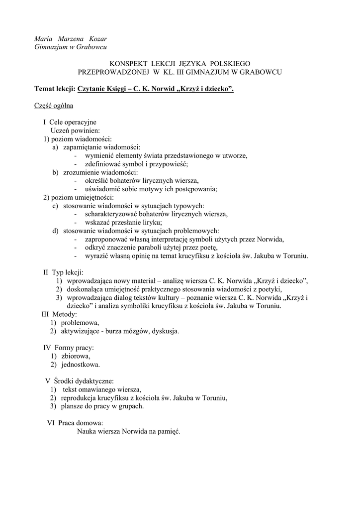 Maria Marzena Kozar Gimnazjum w Grabowcu KONSPEKT LEKCJI JĘZYKA POLSKIEGO PRZEPROWADZONEJ W KL. III GIMNAZJUM W GRABOWCU Temat lekcji: Czytanie Księgi – C. K. Norwid „Krzyż i dziecko”. Część ogólna I Cele operacyjne Uczeń powinien: 1) poziom wiadomości: a) zapamiętanie wiadomości: - wymienić elementy świata przedstawionego w utworze, - zdefiniować symbol i przypowieść; b) zrozumienie wiadomości: - określić bohaterów lirycznych wiersza, - uświadomić sobie motywy ich postępowania; 2) poziom umiejętności: c) stosowanie wiadomości w sytuacjach typowych: - scharakteryzować bohaterów lirycznych wiersza, - wskazać przesłanie liryku; d) stosowanie wiadomości w sytuacjach problemowych: - zaproponować własną interpretację symboli użytych przez Norwida, - odkryć znaczenie paraboli użytej przez poetę, - wyrazić własną opinię na temat krucyfiksu z kościoła św. Jakuba w Toruniu. II Typ lekcji: 1) wprowadzająca nowy materiał – analizę wiersza C. K. Norwida „Krzyż i dziecko”, 2) doskonaląca umiejętność praktycznego stosowania wiadomości z poetyki, 3) wprowadzająca dialog tekstów kultury – poznanie wiersza C. K. Norwida „Krzyż i dziecko” i analiza symboliki krucyfiksu z kościoła św. Jakuba w Toruniu. III Metody: 1) problemowa, 2) aktywizujące - burza mózgów, dyskusja. IV Formy pracy: 1) zbiorowa, 2) jednostkowa. V Środki dydaktyczne: 1) tekst omawianego wiersza, 2) reprodukcja krucyfiksu z kościoła św. Jakuba w Toruniu, 3) plansze do pracy w grupach. VI Praca domowa: Nauka wiersza Norwida na pamięć. Część szczegółowa I Powtórzenie najważniejszych wiadomości o C. K. Norwidzie. Odczytanie noty biograficznej z podręcznika. Sprawdzenie rozumienia tekstu poprzez pytania: 1. W jakim wieku żył i tworzył C. K. Norwid? 2. Czym się zajmował ? 3. Skąd pochodzi jego drugie imię? 4. Gdzie spędził większość życia? 5. Jakich cierpień doświadczył? 6. Dlaczego Norwid nie był doceniony za życia? Uzupełnienie odpowiedzi na karcie pracy /każdy uczeń indywidualnie/. II Głośna lektura wiersza C. K. Norwida „Krzyż i dziecko”. III Analiza przeczytanego tekstu uporządkowana pytaniami: 1. Jak ujawnia się podmiot liryczny wiersza? 2. Do jakiego rodzaju liryki należy wiersz? 3. Kim są bohaterowie liryczni wiersza? 4. Jaka jest dosłowna ich historia? 5. Które środki artystycznego wyrazu dominują w utworze? Jakie mają znaczenie? /Uzupełnienie narysowanych na tablicy wykresów znaczeniami symboli./ syn ojciec krzyż dziecko Przykładowe odpowiedzi: syn - synek, dziecko, człowiek niedoświadczony, Chrystus, uczeń, wychowanek, podopieczny, ktoś posłuszny kierownikowi duchowemu; ojciec – tata, Bóg Ojciec, mistrz, nauczyciel, osoba doświadczona, mędrzec, kierownik duchowy, cierpliwy opiekun; krzyż – szubienica, znak zgorszenia dla Żydów, znak zbawienia dla chrześcijan, odkupienie, cierpienie, choroba, śmierć, Miłość, samotność; dziecko – bezradność, bezbronność, niewinność, niesamodzielność, ufność, przejrzystość, czystość, początek, poranek, wiosna. 6. 7. 8. 9. Jak nazywa się prosta historia, która za pomocą symboli wyjaśnia trudne prawdy? Dlaczego krzyż ,,stał się nam bramą”? Jaki kontekst historyczny przywołuje data zamieszczona pod wierszem? Jakie jest paraboliczne znaczenie utworu? /Uzupełnienie karty odpowiedzi./ IV Podsumowanie. Notatka ilustrowana wykresami podanych wyżej słoneczek: Podmiot liryczny wiersza C. K. Norwida „Krzyż i dziecko” mówi za pośrednictwem dialogu bohaterów lirycznych, dlatego wiersz należy do liryki pośredniej. Dominują w nim symbole: ojciec, syn, krzyż, dziecko. Opowiedziana jest tu prosta historia. Ojciec i syn żeglują statkiem. Grozi im śmierć na skutek zderzenia masztu z mostem. Syn jest przerażony śmiercią widząc, jak maszt z mostem tworzy krzyż. Ojciec pociesza go, że to znak zbawienia. Historia ta jest przypowieścią o spotkaniu człowieka z cierpieniem i śmiercią. Napisana została w dziewięćsetną rocznicę chrztu Polski. Przez śmierć Chrystusa krzyż „stał się nam bramą” do nieba. Człowiek wobec tajemnicy cierpienia i śmierci jest bezradny jak dziecko. Jak w takiej sytuacji postępować uczy nas Chrystus, który przyjął krzyż, dając nam zbawienie. Nasze krzyże przyjęte z miłością mają moc zbawczą. V Rekapitulacja wtórna – wyjaśnienie tytułu wiersza. VI Czym krucyfiks z kościoła św. Jakuba w Toruniu różni się od tradycyjnego? Jak to koresponduje z wymową wiersza? Przykładowa odpowiedź: Krucyfiks z kościoła św. Jakuba w Toruniu przypomina drzewo owocowe. Ma on dwanaście ramion, na których widać dwanaście postaci z wiosłami.. Owocami Chrystusowego krzyża jest męczeństwo apostołów i późniejszych świętych. VII Żeby pokonać lęk przed śmiercią warto wsłuchać się w słowa wiersza K. Wojtyły, który mówi o wielkiej tęsknocie za dniem spotkania z odwieczną Miłością. /Wysłuchanie recytacji wiersza./ „Często myślę o tym dniu widzenia, który pełen będzie zdziwienia nad tą Prostotą, z której świat jest ujęty, w której przebywa nietknięty aż dotąd - i dalej niż dotąd. A wtedy konieczność prosta coraz większą się staje tęsknotą za owym dniem, który wszystko obejmie taką niezmierną Prostotą, miłosnym tchem.” /K. Wojtyła „Pieśń o Bogu ukrytym”/ VIII Praca domowa: Nauka wiersza Norwida na pamięć.