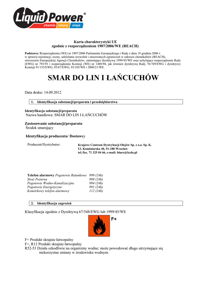 Karta charakterystyki UE zgodnie z rozporządzeniem 1907/2006/WE (REACH) Podstawa: Rozporządzenie (WE) nr 1907/2006 Parlamentu Europejskiego i Rady z dnia 18 grudnia 2006 r. w sprawie rejestracji, oceny, udzielania zezwoleń i stosowanych ograniczeń w zakresie chemikaliów (REACH), utworzenia Europejskiej Agencji Chemikaliów, zmieniające dyrektywę 1999/45/WE oraz uchylające rozporządzenie Rady (EWG) nr 793/93 i rozporządzenie Komisji (WE) nr 1488/94, jak również dyrektywę Rady 76/769/EWG i dyrektywy Komisji 91/155/EWG, 93/67/EWG, 93/105/WE i 2000/21/WE. SMAR DO LIN I ŁAŃCUCHÓW Data druku: 14.09.2012 1. Identyfikacja substancji/preparatu i przedsiębiorstwa Identyfikacja substancji/preparatu Nazwa handlowa: SMAR DO LIN I ŁAŃCUCHÓW Zastosowanie substancji/preparatu Środek smarujący Identyfikacja producenta/ Dostawcy Producent/Dystrybutor: Krajowe Centrum Dystrybucji Olejów Sp. z o.o. Sp. K. Ul. Kominiarska 40, 51-180 Wrocław tel./fax. 71 325 04 66, e-mail: [email protected] Telefon alarmowy Pogotowie Ratunkowe Straż Pożarna Pogotowie Wodno-Kanalizacyjne Pogotowie Energetyczne Komórkowy telefon alarmowy 999 (24h) 998 (24h) 994 (24h) 991 (24h) 112 (24h) 2I 2. Identyfikacja zagrożeń Klasyfikacja zgodnie z Dyrektywą 67/548/EWG lub 1999/45/WE F+ Produkt skrajnie łatwopalny F+, R12 Produkt skrajnie łatwopalny R52-53 Działa szkodliwie na organizmy wodne; może powodować długo utrzymujące się niekorzystne zmiany w środowisku wodnym. 3. Skład/informacja o składnikach Charakterystyka chemiczna: Mieszanka składników aktywnych z gazem wytłaczającym Składniki niebezpieczne CAS nr EINECS/ELINCS 64742-49-0 265-151-9 Opis nafta (ropanaftowa) cięzka, obrabiana wodorem zawartość 1-5% klasyfikacja F, R11, N; R51-53, R67.Xi; R38.Xn; R65 75-28-5 200-857-2 izobutan, czysty 25-50% F+; R 12 74-98-6 200-827-9 propan 10-20% F+; R 12 4. Pierwsza pomoc sza pomoc Po wdychaniu: Osobie poszkodowanej zapewnić dopływ świeżego powietrza, okryć i pozwolić odpocząć. W razie dolegliwości związanych z oddychaniem wezwać lekarza. Po styczności ze skórą: Zdjąć zabrudzone ubranie. Powierzchnie zabrudzone zmyć wodą z mydłem. Nie używać rozpuszczalników ani rozcieńczalników. Przy reakcjach skórnych skonsultować się z lekarzem. Po styczności z okiem: Przepłukać oczy z otwartą powieką przez kilka minut pod bieżącą wodą. W przypadku wystąpienia lub utrzymujących się dolegliwości zasięgnąć porady okulisty. Uwagi dla lekarza: leczenie objawowe. 5. Postępowanie w przypadku pożaru Przydatne środki gaśnicze: piana odporna na działanie alkoholu, proszek gaśniczy, rozpylony strumień wody, dwutlenek węgla. Środki gaśnicze nieprzydatne ze względów bezpieczeństwa: Pełny strumień wody. Specjalne zagrożenia związane z narażeniem wynikającym z właściwości substancji/preparatu jako takiego, produktów spalania, powstających gazów: Produkt skrajnie łatwopalny. Możliwe powstanie wybuchowej mieszaniny parowo- powietrznej. W przypadku pożary: gęsty, czarny dym mogący spowodować uszkodzenie zdrowia. Ponadto mogą powstawać: tlenek węgla i dwutlenek węgla. Specjalne wyposażenie ochronne: nosić aparat izolujący drogi oddechowe Dodatkowe informacje: Zajęte pożarem pojemniki schłodzić rozpylonym strumieniem wody. Pojemniki pod ciśnieniem. Przy ogrzewaniu istniej możliwość rozerwania. 6. Postępowanie w przypadku niezamierzonego uwolnienia do środowiska Indywidualne środki ostrożności: Zadbać o wystarczające wietrzenie. Nie wdychać pary/aerozolu. Nosić odpowiednią odzież ochronną. Unikać kontaktów z substancją. Środki ochrony środowiska: Nie dopuścić do przedostania się do wód gruntowych, kanalizacji , zbiorników wodnych, miejsc położonych poniżej i wykopów/kopalni. Metoda oczyszczania/ wchłaniania: odgrodzić niepalnym materiałem chłonnym (np. piaskiem, ziemią, wermikulitem, ziemią okrzemkową) i zebrać zgodnie z lokalnymi przepisami do przeznaczonych do tego pojemników celem utylizacji (patrz rozdział 13). Oczyścić powierzchnię środkami czyszczącymi, nie używać rozpuszczalników. Dodatkowe uwagi: Usunąć wszelkie źródła zapłonu. 7. Postępowanie z produktem i jego magazynowanie Postępowanie Wskazówki dla bezpiecznego użytkowania: Używać tylko w dobrze wentylowanych miejscach pracy. Nie wdychać pary/aerozolu. Unikać intensywnego kontaktu ze skórą. Nie pryskać w oczy. Wskazówki dla ochrony przeciwpożarowej i przeciwwybuchowej: Pary tworzą z powietrzem wybuchowe opary, cięższe od powietrza. Chronić przed promieniami słońca i temperaturami powyżej 50 C. Przechowywać z dala od źródeł zapłonu.- Nie palić. Przedsięwziąć środki przeciwko naładowaniom elektrostatycznym. Także po użyciu nie otwierać gwałtownie i nie spalać. Nie rozpylać w kierunku płomieni lub na żarzące przedmioty. Składowanie Wymagania w stosunku do pomieszczeń składowych i zbiorników: Pojemniki /zbiorniki przechowywać w dobrze wietrzonym miejscu. Przechowywać tylko w oryginalnych zbiornikach. Przechowywać w temperaturze pokojowej w pozycji pionowej. Wskazówki odnośnie wspólnego składowania: Nie przechowywać razem z silnymi środkami utleniającymi . Dalsze wskazówki odnośnie warunków składowania: Podgrzewanie prowadzi do wzrostu ciśnienia i niebezpieczeństwa wybuchu. Klasa składowania VCI: 2B = Opakowania pod ciśnieniem ( opakowanie w aerozolu) 8. Kontrola narażenia/środki ochrony indywidualnej Wartości graniczne narażenia Nr CAS opis 64742-49-0 75-28-5 74-98-6 bezzapachowa mieszanka zawierająca węglowodór izobutan, czysty propan rodzaj AGW (Niemcy)- RCP (TRGS 900,2.9) Niemcy, AGW Langzeit Niemcy, AGW Langzeit Niemcy, AGW Kurzzeit Niemcy, AGW Kurzzeit Niemcy, AGW Langzeit Niemcy, AGW Langzeit Niemcy, AGW Kurzzeit Niemcy, AGW Kurzzeit wartość graniczna (mieszanka zawierająca węglowodór) 1100 mg/m³ 1000 ppm 2400 mg/m³ 4000 ppm 9600 mg/m³ 1000 ppm 1800 