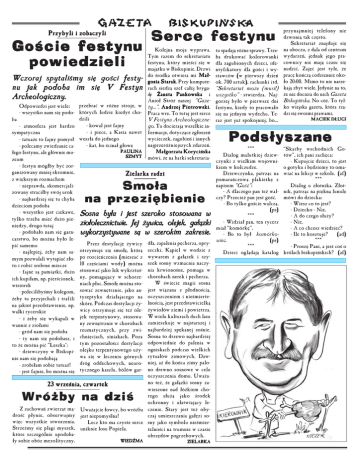 Przybyli i zobaczyli Goście festynu powiedzieli Serce festynu Kolejna moja wyprawa. Tym razem do sekretariatu festynu, który mieści się w majątku w Biskupinie. Drzwi do środka otwiera mi Mał− Wczoraj spytaliśmy się gości festy− gosia Starak Starak. Przy kompute− nu jak podoba im się V Festyn rach siedzą szef całej bryga− dy Żaneta Pankowska i Archeologiczny. Anioł Stróż naszej “Gaze− Odpowiedzi jest wiele: przebrać w różne stroje, w ty...”, Andrzej Piotrowski Piotrowski. − wszystko nam się podo− których ludzie kiedyś cho− Praca wre. To tutaj jest serce dzili ba V Festynu Archeologiczne− − kowal jest fajny − atmosfera jest bardzo go. Tu docierają wszelkie in− − i piece, a Kasia nawet formacje, dotyczące zgłoszeń sympatyczna wycieczek, zagubień i innych − tatuaże to fajny pomysł weszła do jednego najprzeróżniejszych zdarzeń. − kat, bo ścinał głowę − polecamy zwiedzanie ca− PAULINA Małgorzata Korycińska łego festynu, ale głównie mu− SZMYT mówi, że na barki sekretaria− zeum − festyn mógłby być zor− ganizowany mniej skromnie, Zielarka radzi z większym rozmachem − nieprawda, skomercjali− zowany straciłby swój urok − najbardziej się tu chyba dzieciom podoba − wszystko jest ciekawe, Sosna była i jest szeroko stosowana w tylko trzeba mieć dużo pie− ziołolecznictwie. Jej żywica, olejek, gałązki niędzy, drogo tutaj − podobało nam się garn− wykorzystywane są w szerokim zakresie. carstwo, bo można było le− Przez destylację żywicy dła, zapalenia pęcherza, opry− pić samemu otrzymuje się smołę, którą szczki. Kąpiel w wodzie z − najlepiej, żeby nam sa− po rozcieńczeniu (mieszać z wywarem z gałązek i szy− mym pozwalali wytapiać zło− 10 częściami wody) można szek sosny wzmacnia naczy− to i robić srebrne miecze nia krwionośne, pomaga w stosować jako lek wykrztuś− − fajne są pamiątki, dużo chorobach nerek i pęcherza. ny, pomagający w schorze− ich kupiłam, np. pierścionek, W świecie magii sosna niach płuc. Smołę można sto− wisiorek jest wiązana z płodnością, sować zewnętrznie, jako an− − polecilibyśmy kolegom, oczyszczeniem i nieśmierte− tyseptyku działajacego na żeby tu przyjechali i trafili lnością, jest przedstawicielką skórę. Podczas destylacji ży− na jakieś przedstawienie, np. wicy otrzymuje się też ole− żywiołów ziemi i powietrza. walki rycerskie − i żeby się wykąpali w jek terpentynowy, stosowa− W wielu kulturach duch lasu ny zewnętrznie w chorobach zamieszkuje w najstarszej i wannie z ziołami reumatycznych, przy zwi− najbardziej spękanej sośnie. − gród nam się podoba − ty nam się podobasz, i chnięciach, siniakach. Poza Sosna to drzewo najbardziej tym pozostałości destylacji odpowiednie do palenia w to że można pić “Leszka": − dziewczyny w Biskupi− olejku terpentynowego uży− ogniskach podczas wielkich wa się w leczeniu górnych rytuałów zimowych. Daw− nie nam się podobają − zrobiłam sobie tatuaż! dróg oddechowych, neuro− niej, aż do końca zimy palo− − jest fajnie, bo można się tycznego kaszlu, bólów gar− no drewno sosnowe w celu oczyszczenia domu. Uważa− no też, że gałązki sosny za− 23 września, czwartek wieszone nad łóżkiem cho− rego służą jako środek ochronny i ułatwiający le− Z zachowań zwierząt mą− Uważajcie łowcy, bo wróżba czenie. Stary jest też oby− drość płynie, obserwujmy jest niepomyślna! czaj umieszczania gałęzi so− więc wszystkie stworzenia. Lecz kto ma czyste serce sny jako symbolu nieśmier− Strzeżmy się plagi myszek, uniknie losu Popiela. telności na trumnie w czasie które szczególnie upodoba− obrzędów pogrzebowych. WIEDŹMA ły sobie obóz mezolityczny. ZIELARKA Smoła na przeziębienie Wróżby na dziś tu spadają różne sprawy. Trze− ba drukować kolorowanki dla zagubionych dzieci, ide− ntyfikatory dla gości i wy− stawców (w pierwszy dzień ok. 700 sztuk), rachunki itd. “Sekretariat może (musi!) wszystko” − stwierdza. Naj− gorzej było w pierwsze dni festynu, kiedy to pracowało się na jednym wydechu. Te− raz jest już spokojniej, bo... przynajmniej telefony nie dzwonią tak często. Sekretariat znajduje się na uboczu, z dala od centrum wydarzeń, jednak jego pra− cownicy nie mają czasu się nudzić. Zajęć jest tyle, że pracę kończą codziennie oko− ło 20:00. Mimo to nie narze− kają zbyt wiele. Jedynie na to, że nie dociera do nich Gazeta Biskupińska. No cóż. To tyl− ko wiejska gazeta, która rzą− dzi się swoimi prawami. MACIEK DŁUGI Podsłyszane *** Dialog malutkiej dziew− czynki z wielkim wojowni− kiem w kolczudze. Dziewczynka, patrząc na pomarańczową plakietkę z napisem “Gość”: − A dlaczego pan też wal− czy? Przecież pan jest gość. − Bo tylko goście walczą. (ps) *** − Widział pan, ten rycerz miał “komórkę”. − Bo to był komórko− wiec. (ps) *** Dzieci oglądają katalog “Skarby wschodnich Go− tów”, ich pani zachęca: − Kupujcie dzieci, to jest o gotyku i będziemy to oma− wiać na lekcji w szkole. (af) *** Dialog u złotnika. Złot− nik, patrząc na piękną lunulę mówi do dziecka: − Wiesz co to jest? − Dziecko − Nie. − A do czego służy? − Nie. − A co chcesz wiedzieć? − Ile to kosztuje? (ad) *** − Proszę Pani, a jest coś o królach biskupińskich? (af)