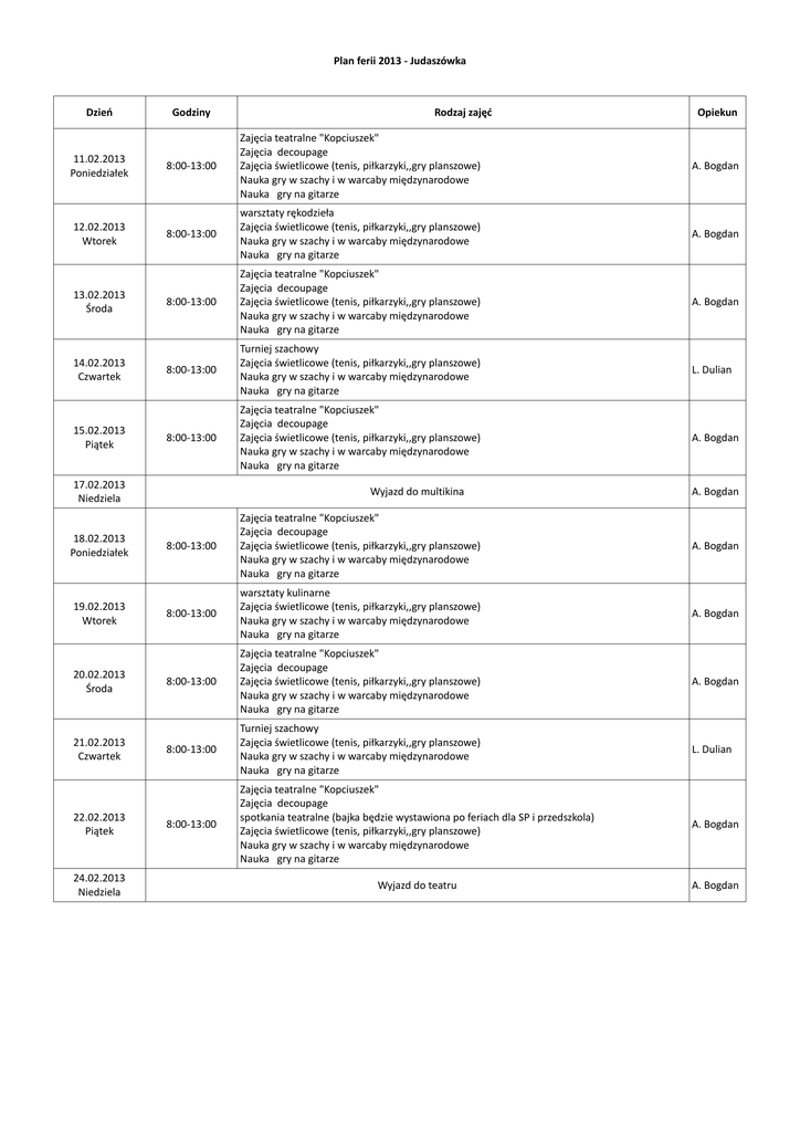 Plan ferii 2013 - Judaszówka Dzień Godziny Rodzaj zajęć Opiekun