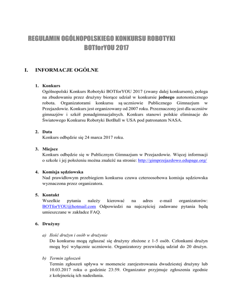 REGULAMIN OGÓLNOPOLSKIEGO KONKURSU ROBOTYKI BOTforYOU 2017 I. INFORMACJE OGÓLNE 1. Konkurs Ogólnopolski Konkurs Robotyki BOTforYOU 2017 (zwany dalej konkursem), polega na zbudowaniu przez drużyny biorące udział w konkursie jednego autonomicznego robota. Organizatorami konkursu są uczniowie Publicznego Gimnazjum w Przejazdowie. Konkurs jest organizowany od 2007 roku. Przeznaczony jest dla uczniów gimnazjów i szkół ponadgimnazjalnych. Konkurs stanowi polskie eliminacje do Światowego Konkursu Robotyki BotBall w USA pod patronatem NASA. 2. Data Konkurs odbędzie się 24 marca 2017 roku. 3. Miejsce Konkurs odbędzie się w Publicznym Gimnazjum w Przejazdowie. Więcej informacji o szkole i jej położeniu można znaleźć na stronie: http://gimprzejazdowo.edupage.org/ 4. Komisja sędziowska Nad prawidłowym przebiegiem konkursu czuwa czteroosobowa komisja sędziowska wyznaczona przez organizatora. 5. Kontakt Wszelkie pytania należy kierować na adres e-mail organizatorów: [email protected] Odpowiedzi na najczęściej zadawane pytania będą umieszczane w zakładce FAQ. 6. Drużyny a) Ilość drużyn i osób w drużynie Do konkursu mogą zgłaszać się drużyny złożone z 1-5 osób. Członkami drużyn mogą być wyłącznie uczniowie. Organizatorzy przewidują udział do 20 drużyn. b) Termin zgłoszeń Termin zgłoszeń upływa w momencie zarejestrowania dwudziestej drużyny lub 10.03.2017 roku o godzinie 23:59. Organizator przyjmuje zgłoszenia zgodnie z kolejnością ich nadesłania. Termin rejestracji drużyn oraz liczba startujących drużyn mogą zostać zmienione decyzją organizatora. Decyzja taka niezwłocznie zostanie umieszczona na stronie konkursu http://gimprzejazdowo.edupage.org/ c) Procedura zgłoszeń drużyny Drużynę należy zgłosić poprzez wypełnienie formularza dostępnego na stronie: http://gimprzejazdowo.edupage.org/. Każda drużyna powinna posiadać opiekuna. Opiekun drużyny nie jest członkiem drużyny. Umieszczenie drużyny na liście zgłoszonych drużyn opublikowanej na stronie WWW konkursu oznacza przyjęcie zgłoszenia przez organizatorów. Lista drużyn zostanie opublikowana po zakończeniu rejestracji. W przypadku braku zgłoszonej drużyny na liście, uczestnicy proszeni są o kontakt z organizatorami. Informacje o ewentualnych zmianach decyzji organizatorów odnośnie liczby drużyn oraz terminu rejestracji zostaną opublikowane na stronie internetowej konkursu najpóźniej 7 dni po terminie zakończenia rejestracji. d) Obowiązkowa opłata za udział w konkursie wynosi 20 zł od każdego członka drużyny. Pieniądze należy wpłacić na podane konto z dopiskiem – DAROWIZNA: 03833500030119438020000010 Dowód wpłaty prosimy przesłać na adres [email protected] II. WARUNKI TECHNICZNE KONKURSU 1. Konstrukcja robota Każda drużyna musi zbudować robota samodzielnie, wykorzystując dowolne części, które nie uszkodzą stołów turniejowych i nie zagrażają bezpieczeństwu uczestników. W konstrukcji robota nie może być wykorzystany żaden sensor reagujący na wydawane dźwięki. Maksymalne wymiary robota to 30 cm x 30 cm x 30 cm. Do wszystkich etapów może być użyty tylko jeden i ten sam robot. Budowa robota musi zostać zakończona do momentu rozpoczęcia konkursu. W czasie konkursu możliwe są jedynie drobne modyfikacje robota oraz dołączanie modułów w przerwach pomiędzy poszczególnymi etapami. 2. Programowanie Robota można programować w dowolnym środowisku programistycznym. Do programowania należy używać własnego komputera (organizatorzy nie udostępniają stanowiska komputerowego uczestnikom). W czasie trwania konkursu dozwolone są jedynie modyfikacje programu. 3. Testowanie Organizator przewiduje, co najmniej jedną sesję testową (w ramach możliwości 2 lub 3) prawdopodobnie w marcu 2017. Dokładne terminy zostaną podane na oficjalnej stronie konkursu dostępnej pod adresem http://gimprzejazdowo.edupage.org/. Chęć udziału w sesji testowej należy zgłosić organizatorowi drogą mailową na adres kontaktowy konkursu. Plansze testowe będą udostępnione również w dniu konkursu od godz. 8: 00 do zakończenia zawodów. Organizatorzy przygotują, co najmniej dwie plansze testowe - każdą do innego etapu. 4. Oświetlenie Podczas konkursu nad każdą planszą konkursową będzie zawieszone źródło światła oświetlające planszę. W dniu konkursu będzie możliwość kalibracji czujników do warunków oświetlenia. Podczas sesji testowych nie będzie takiej możliwości. W czasie konkursu drużyna może poprosić o wyłączenie oświetlenia, ale musi zgłosić to przed pierwszym przejazdem w danej serii. Dodatkowe informacje o oświetleniu będą umieszczone w dziale FAQ na stronie konkursu. III. PRZEBIEG KONKURSU 1. Harmonogram Konkurs rozpoczyna się o godzinie 10:00. Konkurs będzie odbywał się według podanego w dniu konkursu harmonogramu. 2. Zasady konsultacji opiekunów z drużyną W trakcie konkursu dozwolone są konsultacje uczestników wyłącznie z osobami będącymi jego uczestnikami lub organizatorami. Opiekunowie drużyn nie mogą przebywać w pomieszczeniach, w których drużyny przygotowują się do startu w zawodach. Złamanie tej zasady jest równoznaczne z dyskwalifikacją drużyny. 3. Formuła rozgrywek Konkurs składa się z trzech etapów. W trakcie konkursu dwa pierwsze etapy będą rozgrywane jednocześnie. Drużyny zostaną wpisane na listę zgodnie z kolejnością zgłoszeń, po czym podzielone na dwie równe grupy. Grupa pierwsza rozpocznie konkurs od wykonania dwóch przejazdów w etapie I, następnie po przerwie dwóch przejazdów w etapie II. Druga grupa rozpocznie od dwóch przejazdów w etapie II, a po przerwie dwóch przejazdów w etapie I. Kolejność startu będzie ściśle ustalona w trakcie konkursu. W III etapie wezmą udział tylko cztery drużyny, które uzyskały najlepsze wyniki po dwóch pierwszych etapach. Etap III składał się będzie z półfinału oraz fin