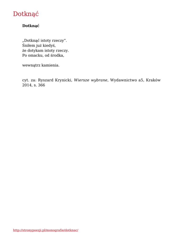 Dotknąć Dotknąć „Dotknąć istoty rzeczy”. Śniłem już kiedyś, że dotykam istoty rzeczy. Po omacku, od środka, wewnątrz kamienia. cyt. za: Ryszard Krynicki, Wiersze wybrane, Wydawnictwo a5, Kraków 2014, s. 366 http://stronypoezji.pl/monografie/dotknac/