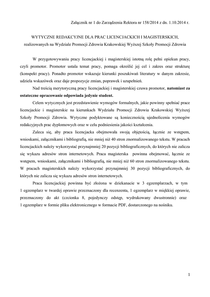 Załącznik nr 1 do Zarządzenia Rektora nr 158/2014 z dn. 1.10.2014 r. WYTYCZNE REDAKCYJNE DLA PRAC LICENCJACKICH I MAGISTERSKICH, realizowanych na Wydziale Promocji Zdrowia Krakowskiej Wyższej Szkoły Promocji Zdrowia W przygotowywaniu pracy licencjackiej i magisterskiej istotną rolę pełni opiekun pracy, czyli promotor. Promotor ustala temat pracy, pomaga określić jej cel i zakres oraz strukturę (konspekt pracy). Ponadto promotor wskazuje kierunki poszukiwań literatury w danym zakresie, udziela wskazówek oraz daje propozycje zmian, poprawek i uzupełnień. Nad treścią merytoryczną pracy licencjackiej i magisterskiej czuwa promotor, natomiast za ostateczne opracowanie odpowiada jedynie student. Celem wytycznych jest przedstawienie wymogów formalnych, jakie powinny spełniać prace licencjackie i magisterskie na kierunkach Wydziału Promocji Zdrowia Krakowskiej Wyższej Szkoły Promocji Zdrowia. Wytyczne podyktowane są koniecznością ujednolicenia wymogów redakcyjnych prac dyplomowych oraz w celu podniesienia jakości kształcenia. Zaleca się, aby praca licencjacka obejmowała swoją objętością, łącznie ze wstępem, wnioskami, załącznikami i bibliografią, nie mniej niż 40 stron znormalizowanego tekstu. W pracach licencjackich należy wykorzystać przynajmniej 20 pozycji bibliograficznych, do których nie zalicza się wykazu adresów stron internetowych. Praca magisterska powinna obejmować, łącznie ze wstępem, wnioskami, załącznikami i bibliografią, nie mniej niż 60 stron znormalizowanego tekstu. W pracach magisterskich należy wykorzystać przynajmniej 30 pozycji bibliograficznych, do których nie zalicza się wykazu adresów stron internetowych. Praca licencjackiej powinna być złożona w dziekanacie w 3 egzemplarzach, w tym 1 egzemplarz w twardej oprawie przeznaczony dla recenzenta, 1 egzemplarz w miękkiej oprawie, przeznaczony do akt (czcionka 8, pojedynczy odstęp, wydrukowany dwustronnie) oraz 1 egzemplarz w formie pliku elektronicznego w formacie PDF, dostarczonego na nośniku. 1 Układ pracy licencjackiej przeglądowej: 1. Strona tytułowa 2. Strona zawierająca ewentualne podziękowania lub motto 3. Spis treści 4. Wstęp 5. Treść właściwa – rozdziały, podrozdziały, punkty 6. Zakończenie (wnioski, podsumowanie) 7. Bibliografia 8. Streszczenie pracy 9. Spis tabel, wykresów, fotografii, załączników Strona tytułowa Strona tytułowa według wzoru, dostępna jest na stronie internetowej Krakowskiej Wyższej Szkoły Promocji Zdrowia: http://www.kwspz.pl/studenci/dokumenty/dokumenty-dotyczace-prac-dyplomowych/ Strona zawierająca ewentualne podziękowania lub motto Przykłady podziękowania: „Pragnę złożyć najserdeczniejsze podziękowania opiekunowi pracy, Pani/Panu…….. za okazaną pomoc, wsparcie merytoryczne oraz wyrozumiałość i cenne rady w trakcie pisania niniejszej pracy licencjackiej”. lub „Składam gorące podziękowania Pani/Panu………………. za wsparcie i udzielenie mi cennych wskazówek w przygotowaniu tej pracy.” Spis treści Spis treści obejmuje wszystkie elementy składowe pracy, z podaniem numerów stron zgodnych z tekstem pracy. Obejmuje: wstęp, każdy rozdział, podrozdział i punkt zawarty w poszczególnych składowych pracy, zakończenie (podsumowanie), bibliografię, ewentualnie spis tabel, wykresów, fotografii oraz załączników. Spis treści powinien być zredagowany tak, aby zmieścił się na jednej stronie, a także należy go wykonać i aktualizować automatycznie (przy pomocy odpowiedniej funkcji w komputerze). 2 Wstęp Wstęp ma charakter informacyjny i stanowi wizytówkę pracy. Jego ostateczna wersja, powinna powstać po napisaniu zasadniczej pracy, w celu kompleksowego przedstawienia jej zawartości. We wstępie należy uzasadnić ważność rozpatrywanego problemu dla nauki lub praktyki, jego specyfikę, aktualność, a także powiązanie z kierunkiem studiów i własnymi zainteresowaniami. Każda praca musi zawierać we wstępie opis założeń oraz zakres pracy, a także szczegółowo przedstawiać problemy badawcze. Treść właściwa – rozdziały, podrozdziały, punkty Treść właściwa pracy licencjackiej obejmuje treść wszystkich rozdziałów, podrozdziałów i punktów. Zaleca się równomierny rozkład treści w poszczególnych rozdziałach, wynikający z logicznego następstwa, ze względu na założony cel pracy. Podział pracy powinien być przejrzysty, logiczny, spójny i niedopuszczający do powtórzeń treści. Tytuły rozdziałów, podrozdziałów i punktów muszą odzwierciedlać ich zawartość merytoryczną i być w pełni zgodne ze spisem treści. Rozdziały należy rozpoczynać od nowej strony, natomiast podrozdziały i punkty pracy w sposób zachowujący jej ciągłość (z pozostawieniem jedynie odstępu pustych dwóch lub trzech wierszy). Zakończenie (wnioski, podsumowanie) Zakończenie powinno być podsumowaniem całości pracy, zarówno części teoretycznej jak i praktycznej i zawierać wnioski z niej płynące. Wnioski powinny wskazywać na spełnienie celu pracy, opierać się na wynikach przeprowadzonych badań i ewentualnie informować o możliwościach ich wykorzystania w praktyce. Bibliografia Bibliografię stanowi spis literatury, pozycji wydawniczych oraz innych źródeł informacji wykorzystanych w pracy licencjackiej. Minimalna liczba pozycji literaturowych, w przypadku pracy licencjackiej powinna wynieść 20 (nie licząc wykazu adresów stron internetowych). Dobór literatury powinien być ściśle związany z tematem pracy. 3 W spisie literatury należy zamieścić tylko te pozycje, na które powoływano się w tekście pracy. Spis literatury w bibliografii należy podać na osobnej stronie pracy, ułożony alfabetycznie, według nazwisk autorów. W pracach licencjackich KWSPZ mają zastosowanie przypisy numerowane według układu alfabetycznego. Przykład - fragment tekstu: „Aromaterapia to jeden z rodzajów kuracji. Polega ona na 