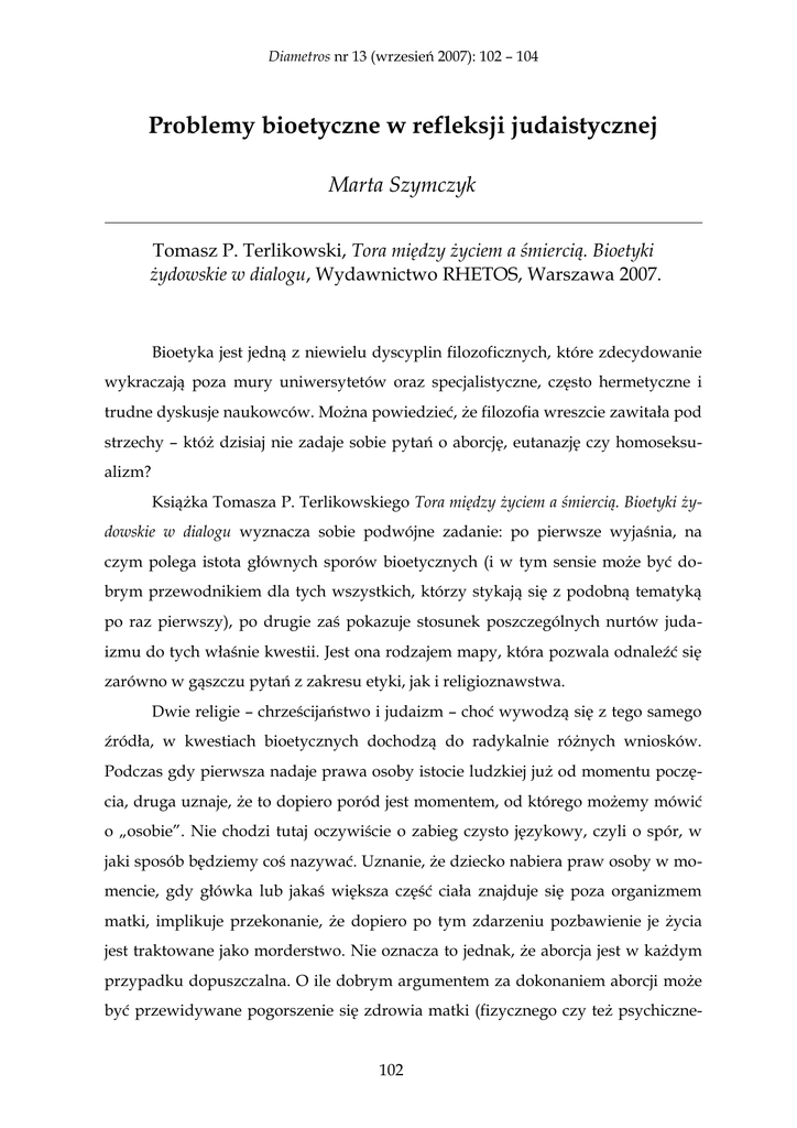 Diametros nr 13 (wrzesień 2007): 102 – 104 Problemy bioetyczne w refleksji judaistycznej Marta Szymczyk Tomasz P. Terlikowski, Tora między życiem a śmiercią. Bioetyki żydowskie w dialogu, Wydawnictwo RHETOS, Warszawa 2007. Bioetyka jest jedną z niewielu dyscyplin filozoficznych, które zdecydowanie wykraczają poza mury uniwersytetów oraz specjalistyczne, często hermetyczne i trudne dyskusje naukowców. Można powiedzieć, że filozofia wreszcie zawitała pod strzechy – któż dzisiaj nie zadaje sobie pytań o aborcję, eutanazję czy homoseksu alizm? Książka Tomasza P. Terlikowskiego Tora między życiem a śmiercią. Bioetyki ży dowskie w dialogu wyznacza sobie podwójne zadanie: po pierwsze wyjaśnia, na czym polega istota głównych sporów bioetycznych (i w tym sensie może być do brym przewodnikiem dla tych wszystkich, którzy stykają się z podobną tematyką po raz pierwszy), po drugie zaś pokazuje stosunek poszczególnych nurtów juda izmu do tych właśnie kwestii. Jest ona rodzajem mapy, która pozwala odnaleźć się zarówno w gąszczu pytań z zakresu etyki, jak i religioznawstwa. Dwie religie – chrześcijaństwo i judaizm – choć wywodzą się z tego samego źródła, w kwestiach bioetycznych dochodzą do radykalnie różnych wniosków. Podczas gdy pierwsza nadaje prawa osoby istocie ludzkiej już od momentu poczę cia, druga uznaje, że to dopiero poród jest momentem, od którego możemy mówić o „osobie”. Nie chodzi tutaj oczywiście o zabieg czysto językowy, czyli o spór, w jaki sposób będziemy coś nazywać. Uznanie, że dziecko nabiera praw osoby w mo mencie, gdy główka lub jakaś większa część ciała znajduje się poza organizmem matki, implikuje przekonanie, że dopiero po tym zdarzeniu pozbawienie je życia jest traktowane jako morderstwo. Nie oznacza to jednak, że aborcja jest w każdym przypadku dopuszczalna. O ile dobrym argumentem za dokonaniem aborcji może być przewidywane pogorszenie się zdrowia matki (fizycznego czy też psychiczne 102 Marta Szymczyk Problemy bioetyczne w refleksji judaistycznej go) po porodzie, o tyle nie może nim być stan zdrowia płodu. Zatem, nie można usunąć ciąży, jeśli głównym motywem byłaby poważna niepełnosprawność płodu. Oczywiście gdy te dwie dyrektywy są ze sobą w konflikcie (chodzi o sytuacje, w których matka przewiduje, że wychowywanie dziecka na przykład z syndromem Downa będzie dla niej dużym obciążeniem psychicznym), ważniejsze są prawa matki niż płodu, ponieważ matka jest pełną osobą, podczas gdy płód ma status je dynie osoby potencjalnej. To, co najbardziej zaskakuje w tej argumentacji, to fakt, że z jednej strony wszystkie nurty judaizmu, powołując się na Stary Testament, odrzu cają różnicowanie jakości życia ludzkiego (uznają, że życie dziecka niepełnospraw nego jest warte tyle samo, co życie dziecka zdrowego i dlatego nie jest to dobry ar gument na rzecz dokonania aborcji), z drugiej strony, kiedy mówią o potencjalnym pogorszeniu się stanu psychicznego matki po urodzeniu chorego dziecka, jednak to różnicowanie jakości życia zakładają (uznaje się, że życie poświęcone opiece nad chorym dzieckiem może mieć gorszą jakość od życia matki, która cieszy się zdro wym potomstwem). Terlikowski analizuje również stosunek głównych nurtów judaizmu do in nych dyskutowanych aktualnie kwestii: porusza problem homoseksualizmu, klono wania terapeutycznego i reprodukcyjnego, eutanazji. Współcześnie konfrontacja z tymi kwestiami wydaje się nie do uniknięcia. Z jednej strony refleksja ta ma wymiar społeczny – na przykład wymaga się od nas, obywateli, zajęcia konkretnego stano wiska wobec legalizacji eutanazji czy aborcji. Z drugiej zaś strony, ma ona wymiar indywidualny, osobisty – gwałtowny rozwój technologii prędzej czy później posta wi każdego z nas przed pewnymi dylematami moralnymi. W tle rozważań Terlikowskiego cały czas pojawia się pytanie o możliwość dialogu między chrześcijaństwem a Synagogą. Wydaje się, że dialog ów może zo stać zahamowany ze względu na różnice w spojrzeniu na pewne kwestie bioetycz ne. Rozbieżności te wynikają z zupełnie innego podejścia tych dwóch religii do Sta rego Testamentu. O ile chrześcijaństwo koncentruje się głównie na pewnej wizji me tafizycznej człowieka, judaizm skupia się na rozstrzygnięciach prawnych. Pierwsza religia będzie pytać o granicę i naturę człowieczeństwa, druga zaś będzie się zasta nawiać, czy w danym przypadku nie zostało przekroczone prawo. 103 Diametros nr 13 (wrzesień 2007): 102 – 104 Jedyna rzecz, która nieco razi w tej publikacji, to sposób jej wydania. Odnosi się wrażenie, że wydawnictwo nie mogło dokonać wyboru między dwiema formu łami: książką popularną i książką naukową. Niestety bogata literatura, na jaką po wołuje się autor, nie została zebrana i umieszczona na końcu książki w postaci bi bliografii. To samo z indeksem nazwisk. Autor, choć pisze językiem zrozumiałym i przystępnym, porusza trudne akademickie tematy, a więc szkoda, że wydawnictwo nie zadbało o to, aby każdy, kto będzie chciał dotrzeć do źródeł przytaczanych cyta tów, mógł to zrobić w łatwy sposób. 104