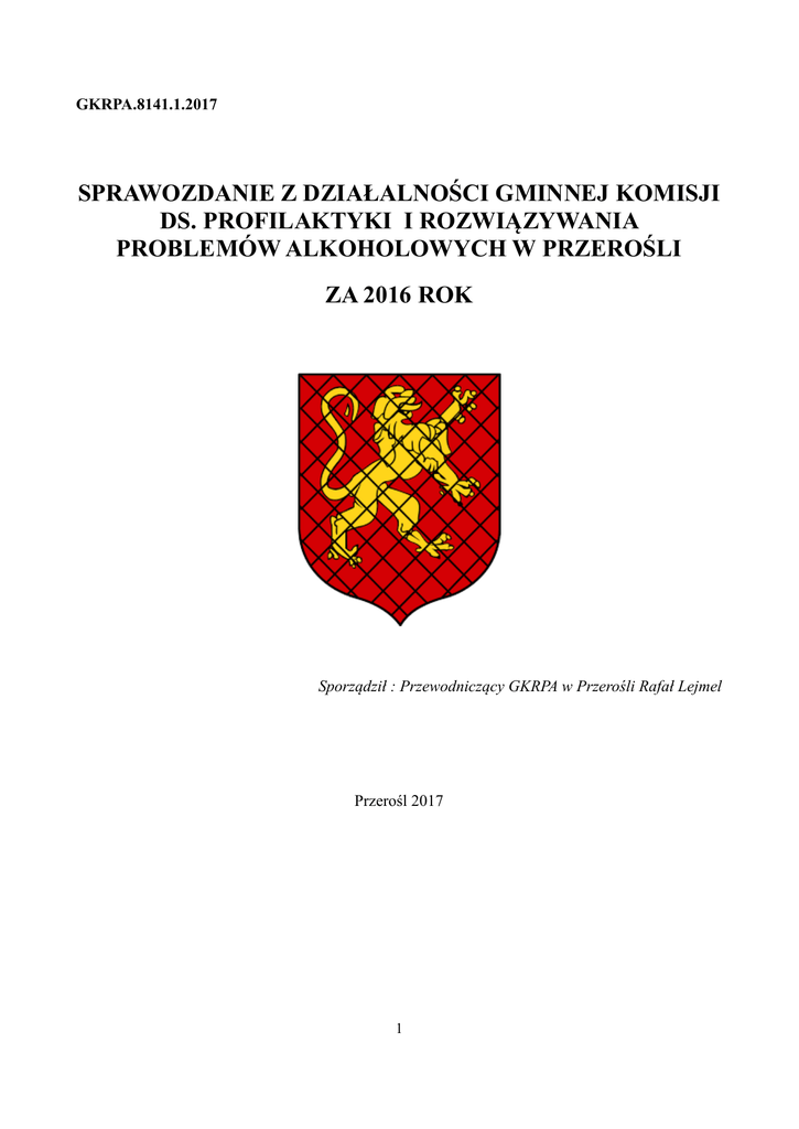 GKRPA.8141.1.2017 SPRAWOZDANIE Z DZIAŁALNOŚCI GMINNEJ KOMISJI DS. PROFILAKTYKI I ROZWIĄZYWANIA PROBLEMÓW ALKOHOLOWYCH W PRZEROŚLI ZA 2016 ROK Sporządził : Przewodniczący GKRPA w Przerośli Rafał Lejmel Przerośl 2017 1 Spis treści lp. strona I Wstęp 2 II Analiza wykorzystania środków finansowych 4 III Działalność merytoryczna Komisji w roku 2016 5 1. Gminny Punkt Konsultacyjny Poradnictwa Specjalistycznego dla osób z problemami opiekuńczo – wychowawczymi i przemocą w Starej Pawłówce oraz Punkt Konsultacyjny ds. przeciwdziałania alkoholizmowi w Przerośli 7 2. Współpraca z Poradnią Terapii Uzależnienia i Współuzależnienia od Alkoholu w Suwałkach. 8 IV DZIAŁALNOŚĆ PROFILAKTYCZNA 9 1. „Szukamy dobrych wzorców” 9 2. " Żyj zdrowo" 9 3. Kampania „Postaw na Rodzinę” 10 4. Spektakle profilaktyczne „ Nie jesteś sam” oraz „ Upadły anioł” 11 5. Konkurs Profilaktyki Uzależnień 13 6. Kampania Białej Wstążki pt: „ Źródłem mocy- rodzina bez przemocy” 13 7. Wyjazd edukacyjno- profilaktyczny do Pragi 14 8. Diagnoza problemu Alkoholowego 16 9. Dofinansowanie szkoleń/kursów 17 V VI VII 18 Przeciwdziałanie narkomanii 18 ZESPÓŁ INTERDYSCYPLINARNY KONTROLA PUNKTÓW SPRZEDAŻY NAPOJÓW ALKOHOLOWYCH 2 18 VIII 19 WSPÓŁPRACA WSTĘP Do głównych zadań realizowanych przez komisję należało prowadzenie działań związanych z profilaktyką i rozwiązywaniem problemów alkoholowych, narkomanii i przemocy poprzez: 1. Zwiększanie dostępności pomocy terapeutycznej i rehabilitacyjnej dla osób uzależnionych od alkoholu oraz członków ich rodzin: obsługa punktu konsultacyjno - informacyjnego dla osób uzależnionych i współuzależnionych od alkoholu, obsługa punktu konsultacyjnego poradnictwa specjalistycznego dla osób z problemami opiekuńczo – wychowawczymi i przemocą, dostarczanie informacji o prowadzeniu profesjonalnej terapii, dostarczanie społeczeństwu informacji o szkodliwości nadużywania alkoholu i środków psychoaktywnych ( ulotki ) motywowanie i kierowanie do leczenia odwykowego i uczestnictwa w zajęciach terapeutycznych, współuczestnictwo w realizacji programów terapeutycznych, profilaktyczno- edukacyjnych. 2. Udzielanie rodzinom, w których występuje problemy alkoholowe, pomocy psychospołecznej ze szczególnym uwzględnieniem ochrony przed przemocą w rodzinie: zobowiązanie do podjęcia leczenia odwykowego: przyjmowanie zgłoszeń o przypadkach nadużywania alkoholu z jednoczesnym występowaniem przesłanek powodujących rozkład życia rodzinnego, demoralizację nieletnich lub zakłócanie spokoju i porządku publicznego a także przemoc w rodzinie, wzywanie na rozmowę osób, co do których wpłynęło zgłoszenie i pouczenie o konieczności zaprzestania w/w działań, kierowanie na badanie przez biegłego w celu wydania opinii w przedmiocie uzależnienia od alkoholu, przygotowywanie dokumentacji związanej z postępowaniem sądowym, składanie wniosków o wszczęcie postępowania do Sądu Rejonowego w Suwałkach, niesienie pomocy członkom rodzin z problemem alkoholowym, przeciwdziałanie zjawisku przemocy w rodzinie, informowanie o możliwości uzyskania pomocy, udzielanie wsparcia osobom po zakończeniu terapii oraz członkom ich rodzin ( pomoc terapeutyczna i prawna), współpraca z innymi placówkami, organizacjami społecznymi w zakresie profilaktyki i rozwiązywania problemów alkoholowych. 3 Uczestnictwo w osobie koordynatora w kampaniach profilaktyczno - edukacyjnych 3. Prowadzenie profilaktycznej w szczególności dla dzieci i młodzieży: działalności informacyjnej i edukacyjnej, zaopatrzenie w materiały edukacyjne i informacyjne dotyczące problematyki uzależnień ( czasopisma, ulotki), współorganizowanie, konsultowanie zajęć profilaktycznych, pomoc przy tworzeniu programów profilaktycznych. 4. Nadzór nad ograniczeniem dostępności alkoholu trzeźwości i przeciwdziałaniu alkoholizmowi. z zakresu ustawy o wychowaniu w 5. Wspomaganie działalności instytucji, stowarzyszeń i osób fizycznych służących rozwiązywaniu problemów alkoholowych 6. Motywowanie do podnoszenia kwalifikacji przedstawicieli placówek oświaty, pomocy społecznej, policji, stowarzyszeń w zakresie znajomości i rozwiązywania problemów alkoholowych, 7. Podział i zlecanie zadań wynikających z Gminnego Programu Profilaktyki Rozwiązywania Problemów Alkoholowych, i 8. Dążenie do stworzenia zintegrowanego systemu profilaktyki gminnej – współpraca z przedstawicielami władz samorządowych, instytucji i organizacji na terenie gminy. ANALIZA WYKORZYSTANIA ŚRODKÓW FINANSOWYCH W 2016 roku za zezwolenia na sprzedaż napojów alkoholowych pozyskano kwotę 996,59 zł 22 Liczba punktów sprzedaży napojów alkoholowych w 2016 roku - 5 ilość wydanych zezwoleń : 4 ( jednorazowe ) Na rok 2016 zaplanowano na działanie Komisji kwotę 28 750,00 zł z czego zrealizowano kwotę 25 964,38 zł W tym wydatkowano: wynagrodzenie przewodniczącego i członków komisji 4 6 546,00 zł prowadzenie punktu konsultacyjnego dla osób z problemem 2 244,00 zł uzależnienia od alkoholu oraz członków ich rodzin Programy edukacyjno – profilaktyczne, szkolenia 12 657,38 zł Udział Gminy w Kampanii Przeciw Pijanym Kierowcom 1 230,00 zł Opinie o uzależnieniach/opłaty sądowe 2 435,00 zł Współfinansowanie turnusów terapeutycznych 500,00 zł Przeciwdziałanie narkomanii 250,00 zł Publikacje 102,00 zł DZIAŁALNOŚĆ MERYTORYCZNA KOMISJI W roku 2016 Komisja odbyła 13 spotkań, na których rozpatrywano sprawy dotyczące: Data posiedzenia Ilość spraw Merytoryka omawianych spraw 1 29 lutego 2016 roku 7 - Rozpatrzenie wniosków z policji o wszczęcie postępowania w przedmiocie uzależnienia od alkoholu - Rozpatrzenie wniosków instytucji, stowarzyszeń, osób fizycznych dotyczących wsparcia finansowego wobec prowadzonych działań profilaktycznych - Programy profilaktyczne/ konspekty działań - Skierowanie osób na ba