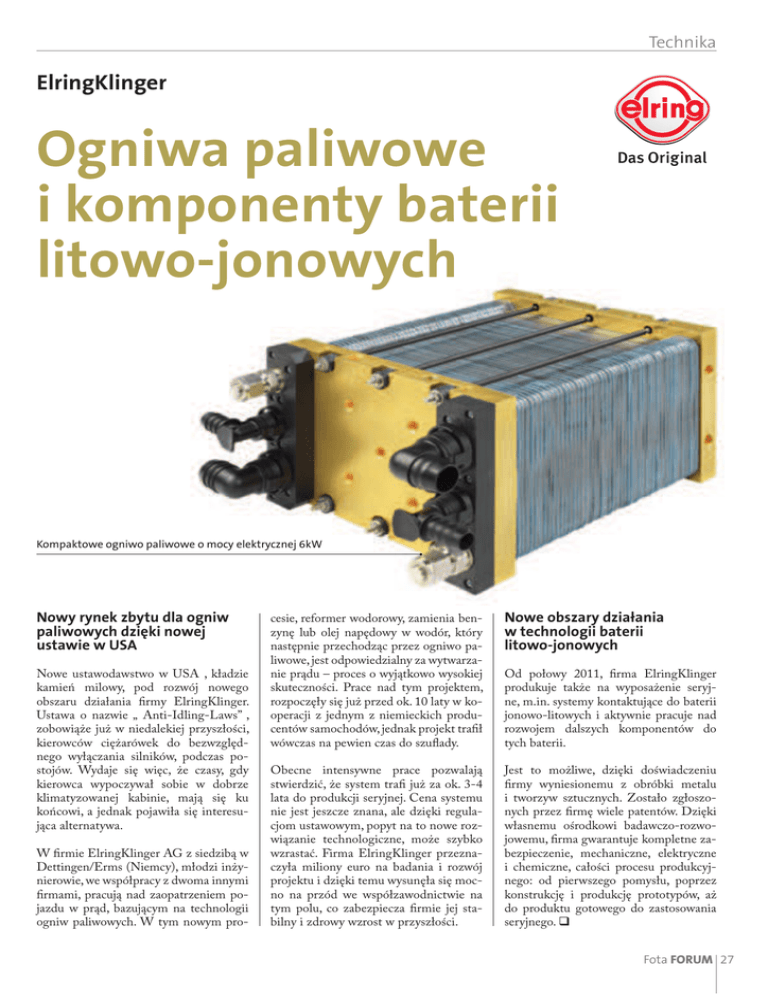 7HFKQLND ElringKlinger Ogniwa paliwowe i komponenty baterii litowo-jonowych .RPSDNWRZHRJQLZRSDOLZRZHRPRF\HOHNWU\F]QHMN: Nowy rynek zbytu dla ogniw paliwowych dzięki nowej ustawie w USA Nowe ustawodawstwo w USA , kładzie kamień milowy, pod rozwój nowego obszaru działania firmy ElringKlinger. Ustawa o nazwie „ Anti-Idling-Laws” , zobowiąże już w niedalekiej przyszłości, kierowców ciężarówek do bezwzględnego wyłączania silników, podczas postojów. Wydaje się więc, że czasy, gdy kierowca wypoczywał sobie w dobrze klimatyzowanej kabinie, mają się ku końcowi, a jednak pojawiła się interesująca alternatywa. W firmie ElringKlinger AG z siedzibą w Dettingen/Erms (Niemcy), młodzi inżynierowie, we współpracy z dwoma innymi firmami, pracują nad zaopatrzeniem pojazdu w prąd, bazującym na technologii ogniw paliwowych. W tym nowym pro- cesie, reformer wodorowy, zamienia benzynę lub olej napędowy w wodór, który następnie przechodząc przez ogniwo paliwowe, jest odpowiedzialny za wytwarzanie prądu – proces o wyjątkowo wysokiej skuteczności. Prace nad tym projektem, rozpoczęły się już przed ok. 10 laty w kooperacji z jednym z niemieckich producentów samochodów, jednak projekt trafił wówczas na pewien czas do szuflady. Nowe obszary działania w technologii baterii litowo-jonowych Obecne intensywne prace pozwalają stwierdzić, że system trafi już za ok. 3-4 lata do produkcji seryjnej. Cena systemu nie jest jeszcze znana, ale dzięki regulacjom ustawowym, popyt na to nowe rozwiązanie technologiczne, może szybko wzrastać. Firma ElringKlinger przeznaczyła miliony euro na badania i rozwój projektu i dzięki temu wysunęła się mocno na przód we współzawodnictwie na tym polu, co zabezpiecza firmie jej stabilny i zdrowy wzrost w przyszłości. Jest to możliwe, dzięki doświadczeniu firmy wyniesionemu z obróbki metalu i tworzyw sztucznych. Zostało zgłoszonych przez firmę wiele patentów. Dzięki własnemu ośrodkowi badawczo-rozwojowemu, firma gwarantuje kompletne zabezpieczenie, mechaniczne, elektryczne i chemiczne, całości procesu produkcyjnego: od pierwszego pomysłu, poprzez konstrukcję i produkcję prototypów, aż do produktu gotowego do zastosowania seryjnego. Od połowy 2011, firma ElringKlinger produkuje także na wyposażenie seryjne, m.in. systemy kontaktujące do baterii jonowo-litowych i aktywnie pracuje nad rozwojem dalszych komponentów do tych baterii. Fota FORUM 27