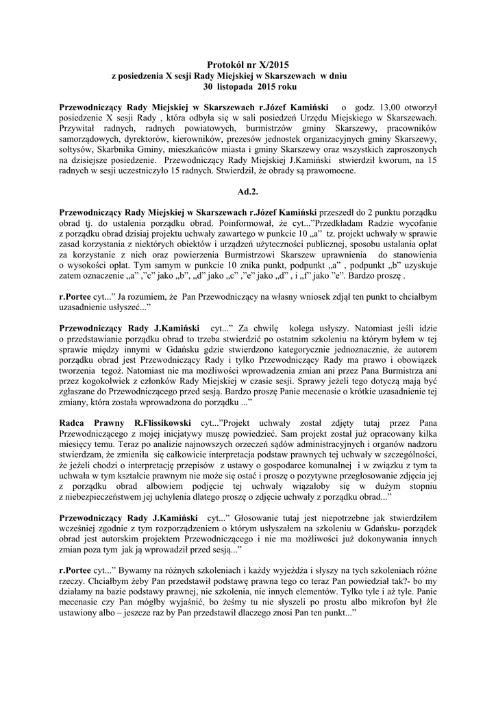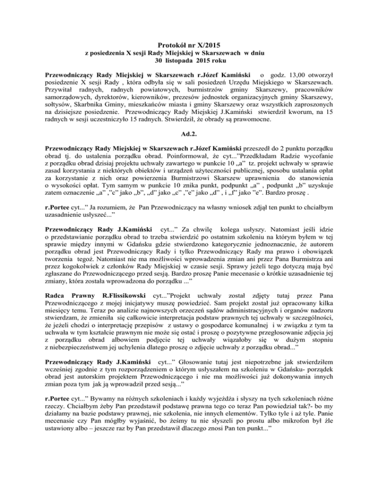 Protokół nr X/2015 z posiedzenia X sesji Rady Miejskiej w Skarszewach w dniu 30 listopada 2015 roku Przewodniczący Rady Miejskiej w Skarszewach r.Józef Kamiński o godz. 13,00 otworzył posiedzenie X sesji Rady , która odbyła się w sali posiedzeń Urzędu Miejskiego w Skarszewach. Przywitał radnych, radnych powiatowych, burmistrzów gminy Skarszewy, pracowników samorządowych, dyrektorów, kierowników, prezesów jednostek organizacyjnych gminy Skarszewy, sołtysów, Skarbnika Gminy, mieszkańców miasta i gminy Skarszewy oraz wszystkich zaproszonych na dzisiejsze posiedzenie. Przewodniczący Rady Miejskiej J.Kamiński stwierdził kworum, na 15 radnych w sesji uczestniczyło 15 radnych. Stwierdził, że obrady są prawomocne. Ad.2. Przewodniczący Rady Miejskiej w Skarszewach r.Józef Kamiński przeszedł do 2 punktu porządku obrad tj. do ustalenia porządku obrad. Poinformował, że cyt...”Przedkładam Radzie wycofanie z porządku obrad dzisiaj projektu uchwały zawartego w punkcie 10 „a” tz. projekt uchwały w sprawie zasad korzystania z niektórych obiektów i urządzeń użyteczności publicznej, sposobu ustalania opłat za korzystanie z nich oraz powierzenia Burmistrzowi Skarszew uprawnienia do stanowienia o wysokości opłat. Tym samym w punkcie 10 znika punkt, podpunkt „a” , podpunkt „b” uzyskuje zatem oznaczenie „a” ,”c” jako „b”, „d” jako „c” ,”e” jako „d” , i „f” jako ”e”. Bardzo proszę . r.Portee cyt...” Ja rozumiem, że Pan Przewodniczący na własny wniosek zdjął ten punkt to chciałbym uzasadnienie usłyszeć...” Przewodniczący Rady J.Kamiński cyt...” Za chwilę kolega usłyszy. Natomiast jeśli idzie o przedstawianie porządku obrad to trzeba stwierdzić po ostatnim szkoleniu na którym byłem w tej sprawie między innymi w Gdańsku gdzie stwierdzono kategorycznie jednoznacznie, że autorem porządku obrad jest Przewodniczący Rady i tylko Przewodniczący Rady ma prawo i obowiązek tworzenia tegoż. Natomiast nie ma możliwości wprowadzenia zmian ani przez Pana Burmistrza ani przez kogokolwiek z członków Rady Miejskiej w czasie sesji. Sprawy jeżeli tego dotyczą mają być zgłaszane do Przewodniczącego przed sesją. Bardzo proszę Panie mecenasie o krótkie uzasadnienie tej zmiany, która została wprowadzona do porządku ...” Radca Prawny R.Flissikowski cyt...”Projekt uchwały został zdjęty tutaj przez Pana Przewodniczącego z mojej inicjatywy muszę powiedzieć. Sam projekt został już opracowany kilka miesięcy temu. Teraz po analizie najnowszych orzeczeń sądów administracyjnych i organów nadzoru stwierdzam, że zmieniła się całkowicie interpretacja podstaw prawnych tej uchwały w szczególności, że jeżeli chodzi o interpretację przepisów z ustawy o gospodarce komunalnej i w związku z tym ta uchwała w tym kształcie prawnym nie może się ostać i proszę o pozytywne przegłosowanie zdjęcia jej z porządku obrad albowiem podjęcie tej uchwały wiązałoby się w dużym stopniu z niebezpieczeństwem jej uchylenia dlatego proszę o zdjęcie uchwały z porządku obrad...” Przewodniczący Rady J.Kamiński cyt...” Głosowanie tutaj jest niepotrzebne jak stwierdziłem wcześniej zgodnie z tym rozporządzeniem o którym usłyszałem na szkoleniu w Gdańsku- porządek obrad jest autorskim projektem Przewodniczącego i nie ma możliwości już dokonywania innych zmian poza tym jak ją wprowadził przed sesją...” r.Portee cyt...” Bywamy na różnych szkoleniach i każdy wyjeżdża i słyszy na tych szkoleniach różne rzeczy. Chciałbym żeby Pan przedstawił podstawę prawna tego co teraz Pan powiedział tak?- bo my działamy na bazie podstawy prawnej, nie szkolenia, nie innych elementów. Tylko tyle i aż tyle. Panie mecenasie czy Pan mógłby wyjaśnić, bo żeśmy tu nie słyszeli po prostu albo mikrofon był źle ustawiony albo – jeszcze raz by Pan przedstawił dlaczego znosi Pan ten punkt...” Radca Prawny R.Flissikowski cyt...” Ta uchwała w tym kształcie w jakim jest biorąc pod uwagę najnowsze orzeczenia sądów administracyjnych oraz organów nadzoru nie powinna być przez nasz organ uchwalana dlatego, że zmieniła się interpretacja podstawy prawnej, szczególnie jeżeli chodzi o ustawę o gospodarce komunalnej. W związku z powyższym istnieje duże niebezpieczeństwo uchylenia tej uchwały na co mam tu przykłady przez organ nadzoru. W związku z powyższym proszę Wysoką Radę o pozytywne ustosunkowanie się do wniosku Przewodniczącego. Dziękuję bardzo...” Przewodniczący Rady J.Kamiński cyt...” Podstawy prawnej nie przytoczę teraz, ponieważ mogę się powołać jedynie na to co przedstawiła nam na szkoleniu Pani dr Ewa Bosy, która jest członkiem Samorządowego Kolegium Odwoławczego, jest wykładowcą – już nie pamiętam gdzie. Więc Ja zdaje się, zdaje się na to co ktoś uprawniony do przedstawiania tego problemu mnie przekazał i dlatego informuję o tym Szanowną Radę. Nie będziemy już dyskutować dalej, przechodzimy do następnego punktu 3. Proszę. Ja biorę na siebie odpowiedzialność za tę zmianę. Koniec, kropka. Przechodzimy do punktu 3: Ad.3. Przewodniczący Rady Miejskiej przeszedł do 3 punktu porządku obrad tj. do odpowiedzi na interpelacje i wnioski zgłaszane na poprzednich sesjach. Z-ca M.Byczkowski udzielił odpowiedzi na interpelacje i wnioski ( zał ). Uwag nie zanotowano. Ad.4. Przewodniczący Rady J.Kamiński przeszedł do 4 punktu porządku obrad tj. do zatwierdzenia protokołu z IX sesji Rady Miejskiej w Skarszewach. Uwag do protokołu nie było. W głosowaniu jawnym, przy 2 głosach „wstrzymujących się” protokół z X sesji Rady Miejskiej w Skarszewach został przez Radę przyjęty . Ad.5. Przewodniczący Rady J.Kamiński przeszedł do 5 punktu porządku obrad tj. do Informacji Przewodniczącego Rady Miejskiej o działaniach podejmowanych w okresie międzysesyjnym. Przewodniczący Rady złożył p