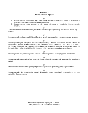 1 Rozdział I Postanowienia ogólne §1 1. Stowarzyszenie nosi nazwę: Ełckiego Stowarzyszenia Aktywnych „STOPA” w dalszych postanowieniach statutu zwany Stowarzyszeniem. 2. Stowarzyszenie może posługiwać się nazwą skróconą w brzmieniu: Stowarzyszenie STOPA. §2 Terenem działania Stowarzyszenia jest obszar Rzeczypospolitej Polskiej, zaś siedziba mieści się w Ełku. §3 Stowarzyszenie może prowadzić działalność na terenie innych państw z poszanowaniem ich praw. §4 Stowarzyszenie jest zawiązane na czas nieograniczony. Posiada osobowość prawną. Działa na podstawie przepisów ustawy Prawo o stowarzyszeniach z dnia 7 kwietnia 1989 r. (Dz. U. z 2001 r. Nr 79, poz. 855 z póź. zm.), ustawa o działalności pożytku publicznego i o wolontariacie z dnia 24 kwietnia 2003 r. (Dz. U. z 2010 r., Nr 234, poz. 1536 z póź. zm.) oraz niniejszego Statutu. §5 Stowarzyszenia ma prawo używania pieczęci i odznak zgodnie z obowiązującymi przepisami. §6 Stowarzyszenie może należeć do innych krajowych i międzynarodowych organizacji o podobnych celach. §7 Działalność stowarzyszenia oparta jest przede wszystkim na społecznej pracy jego członków. §8 Stowarzyszenie do prowadzenia swojej działalności może zatrudniać pracowników, w tym członków Stowarzyszenia. Ełckie Stowarzyszenie Aktywnych „STOPA” Tekst jednolity – Ełk, 24 czerwca 2015 roku 2 Rozdział II Cele i środki działania §9 Celem Stowarzyszenia jest: 1. Prowadzenie działalności na rzecz ogółu społeczeństwa poprzez (między innymi) wsparcie, promocję i animację społeczną, kulturalną, oświatową, 2. Działanie na rzecz porządku i bezpieczeństwa, 3. Wspieranie idei samorządności lokalnej i regionalnej, 4. Wspieranie i rozwój przedsiębiorczości, 5. Działania na rzecz kultury i tradycji regionu, 6. Wzmocnienie promocji subregionu Ełk – Gołdap – Olecko, jako atrakcyjnego turystycznie, 7. Tworzenie wzorca współpracy organizacji pozarządowych, administracji publicznej oraz biznesu, 8. Działania na rzecz partnerstwa między sektorowego, 9. Wspieranie idei jednoczącej się Europy i Unii Europejskiej, 10. Wspomaganie działań na rzecz ochrony środowiska naturalnego, 11. Wspieranie regionalnej współpracy zagranicznej, 12. Wspieranie organizacji pozarządowych, administracji publicznej oraz sektora biznesu w pozyskiwaniu zewnętrznych źródeł finansowania, 13. Integracja, promocja i lobbowanie na rzecz organizacji pozarządowych, 14. Wspieranie szeroko pojętej aktywności obywatelskiej, animowanie współpracy organizacji pozarządowych 15. Wspieranie działań aktywizujących nieformalne grupy młodzieżowe, osoby i grupy marginalizowane, 16. Wspieranie inicjatyw społecznych na rzecz dobroczynności, ochrony zdrowia i pomocy społecznej, rehabilitacji zawodowej i społecznej osób niepełnosprawnych i wykluczonych społecznie oraz na rzecz rozwoju lokalnego. 17. Działalność naukowa, naukowo – techniczna, wydawnicza, oświatowa, kulturalna, w zakresie objętym niniejszym statutem, 18. Działania na rzecz szeroko pojętej aktywizacji wsi, 19. Promowanie i wspieranie zdrowego i aktywnego trybu życia, 20. Inicjowanie i wspieranie działań na rzecz aktywnych form wypoczynku, 21. Wspieranie organizacyjne, finansowe i rzeczowe osób fizycznych i prawnych w zakresach objętych celami Stowarzyszenia. 22. Wspieranie polaków i Polonii zagranicą. 23. Wspieranie współpracy międzynarodowej i wymiany doświadczeń objętych celami Stowarzyszenia. § 10 Stowarzyszenie realizuje swoje cele w szczególności poprzez: 1. Prowadzenie kampanii społecznych, 2. Organizacji forum współpracy trójsektorowej, 3. Konferencji promujących aktywność społeczną, 4. Akcje promocyjne subregionu, 5. Udzielanie wsparcia technicznego, lokalowego, szkoleniowego oraz informacyjnego organizacjom pozarządowym oraz inicjatywom obywatelskim, Ełckie Stowarzyszenie Aktywnych „STOPA” Tekst jednolity – Ełk, 24 czerwca 2015 roku 3 6. Organizowanie spotkań liderów i członków organizacji pozarządowych w celu poszerzenia i pogłębienia współpracy pomiędzy organizacjami, 7. Diagnozę i prowadzenie stałego rozpoznawania potrzeb środowiska lokalnego, 8. Prowadzenie działalności wydawniczej i informacyjnej, w tym opracowywanie i publikowanie materiałów poświęconych problematyce zgodnej z celami Stowarzyszenia, 9. Współprace z instytucjami samorządowymi, państwowymi, organizacjami społecznymi działającymi w zakresie objętym celami Stowarzyszenia, 10. Współprace z krajowymi i zagranicznymi podmiotami zainteresowanymi celami stowarzyszenia, 11. Prowadzenie działalności edukacyjno – oświatowej, 12. Prowadzenie działalności animacyjnej społeczeństwa, 13. Tworzenie płaszczyzny współpracy pomiędzy organizacjami pozarządowymi w Polsce i Unii Europejskiej poprzez organizowanie spotkań, konferencji, szkoleń i inne, 14. Występowanie z inicjatywami na rzecz rozwoju lokalnego i regionalnego w województwie, 15. Wspieranie rozwoju współpracy i wymiany doświadczeń w zakresie rozwoju gospodarczego, kulturalnego, oświatowego i społecznego, ochrony środowiska naturalnego, 16. Prowadzenie działalności informacyjnej, konsultacyjnej i programowej, mającej na celu wspólne rozwiązywanie problemów organizacji pozarządowych, administracji publicznej oraz biznesu, 17. Opiniowanie przedstawionych projektów aktów prawnych, regulujących: 1) Działalność samorządu lokalnego, 2) Rozwój oraz umacnianie średniej i małej przedsiębiorczości. 18. Tworzenie i rozwój oraz promocję produktów turystycznych, 19. Współpraca z lokalnymi punktami informacji turystycznej, 20. Doskonalenie kadry Stowarzyszenia, 21. Inicjowanie, opiniowanie i wspomaganie planów rozwoju i modernizacji infrastruktury turystycznej, 22. Podejmowanie inicjatyw na rzecz Zjednoczonej Europy, w tym we współdziałaniu z krajami członkowskimi i kandydującymi do Unii Europejskiej, wspier
