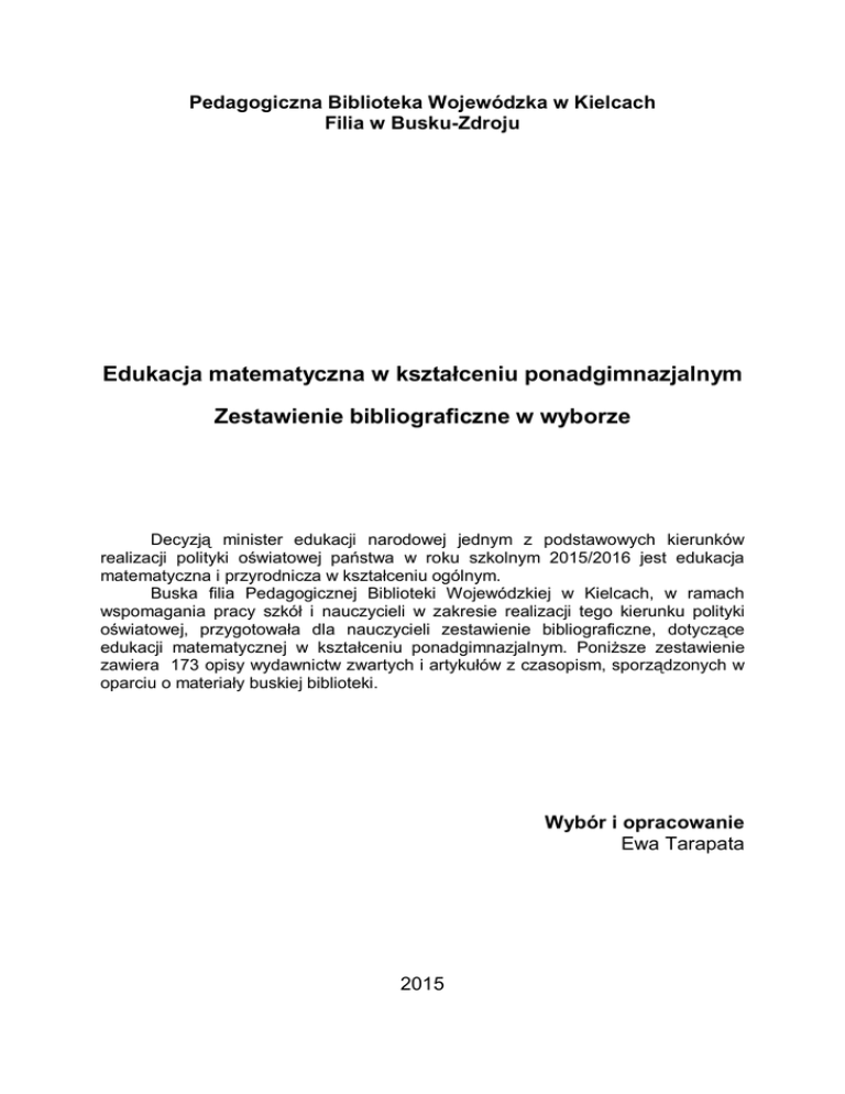 Pedagogiczna Biblioteka Wojewódzka w Kielcach Filia w Busku-Zdroju Edukacja matematyczna w kształceniu ponadgimnazjalnym Zestawienie bibliograficzne w wyborze Decyzją minister edukacji narodowej jednym z podstawowych kierunków realizacji polityki oświatowej państwa w roku szkolnym 2015/2016 jest edukacja matematyczna i przyrodnicza w kształceniu ogólnym. Buska filia Pedagogicznej Biblioteki Wojewódzkiej w Kielcach, w ramach wspomagania pracy szkół i nauczycieli w zakresie realizacji tego kierunku polityki oświatowej, przygotowała dla nauczycieli zestawienie bibliograficzne, dotyczące edukacji matematycznej w kształceniu ponadgimnazjalnym. Poniższe zestawienie zawiera 173 opisy wydawnictw zwartych i artykułów z czasopism, sporządzonych w oparciu o materiały buskiej biblioteki. Wybór i opracowanie Ewa Tarapata 2015 Wydawnictwa zwarte 1. Informator maturalny od 2005 roku z matematyki. – Warszawa : Centralna Komisja Egzaminacyjna, 2003. – S. 98 Nr inw. 796 b f. Wypożyczalnia 2. Marciniak, Zbigniew : Edukacja matematyczna i techniczna w szkole podstawowej, gimnazjum i liceum: matematyka, zajęcia techniczne, zajęcia komputerowe, informatyka : podstawa programowa z komentarzami / Zbigniew Marciniak. – S.I : s.n, 2009. – S. 51-80 : Komentarz do podstawy programowej przedmiotu Matematyka [Komentarz do podstawy programowej wszystkich czterech etapów edukacji] Nr inw. 839 b Czytelnia 3. Marciniak, Zbigniew : Edukacja matematyczna i techniczna w szkole podstawowej, gimnazjum i liceum: matematyka, zajęcia techniczne, zajęcia komputerowe, informatyka : podstawa programowa z komentarzami / Zbigniew Marciniak. – S.I : s.n, 2009. – S. 41-49 : Podstawa programowa przedmiotu Matematyka : IV etap edukacyjny. - S. 50 : Zalecane warunki i sposób realizacji [Podstawa dotyczy edukacji matematycznej na poziomie liceum] Nr inw. 839 b Czytelnia 4. Szurek, Michał : O nauczaniu matematyki : wykłady dla nauczycieli i studentów : tom 1 / Michał Szurek. – Gdańsk : Gdańskie Wydawnictwo Oświatowe, 2006. – S. 118, [2] Nr inw. 40117 Wypożyczalnia 5. Wells, David : Cudowne i interesujące łamigłówki matematyczne / David Wells. – Poznań : Zysk i S-ka Wydawnictwo, 2002. – 376 Nr inw. S/2788 Wypożyczalnia Wydawnictwa ciągłe 6. Adamska, Marta : Matura rozszerzona 2014 – za mało czasu? / Marta Adamska i in. // „Matematyka”. – 2014, nr 8, s. 50-56 7. Bolanowska, Monika : Matura 2011 – rutyna? : coroczne sprawozdanie pomaturalne naszych egzaminatorów / Monika Bolanowska i in. // „Matematyka”. – 2011, nr 8, s. 43-56 8. Bolanowska, Monika : Matura 2012 – CKE wyciągnęła wnioski? / Monika Bolanowska i in. // „Matematyka”. - 2012, nr 8, s. 33-42 9. Bolanowska, Monika : Matura rozszerzona 2013 – twórcza czy schematyczna? / Monika, Bolanowska // „Matematyka”. – 2013, nr 8, s. 47-54 10. Bolanowska, Monika : Pierwsza taka próbna matura… / Monika Bolanowska, Jan Kraszewski / „Matematyka”. – 2010, nr 1, s. 21-26 2 11. Bolanowska, Monika : Taka zwykła próbna matura? / Monika Bolanowska, Jan Kraszewski // „Matematyka”. – 2011, nr 1, s. 28-34 12. Bolanowski, Teofil : Matura podstawowa 2014 – zadania zamknięte / Teofil Bolanowski // „Matematyka”. – 2014, nr 8, s. 39-43 [Maturzysta ocenia test maturalny] 13. Bolanowski, Teofil : Rozważania leniwego trzecioklasisty / Teofil Bolanowski // „Matematyka”. – 2013, nr 8, s. 38-42 14. Chodnicki, Jerzy : O problemach z tekstem zadań egzaminacyjnych / Jerzy Chodnicki // „Matematyka”. – 2014, nr 9, s. 51-56 15. Grębski, Tomasz : Krzywe stożkowe w codziennym życiu / Tomasz Grębski // „Matematyka”. – 2015, nr 5, s. 15-23 16. Grębski, Tomasz : Młynek do liczb – czyli kalkulator Curta / Tomasz Grębski // „Matematyka”. – 2015, nr 4, s. 15-22 17. Guzicki, Wojciech : O rozwiązywaniu zadań metodą odgadywania / Wojciech Guzicki // „Matematyka”. – 2010, nr 11, s. 651-660 18. Jastrzębska, Lidia : Matematyka na maturze / Lidia Jastrzębska // „Nowa Szkoła”. – 2010, nr 2, s. 17-20 19. Karkut, Janusz : Matura rozszerzona z matematyki w 2015 r. / Janusz Karkut // „Matematyka”. – 2013, nr 1, s. 38-43 20. Kośka, Agnieszka : Już za rok matura… / Agnieszka Kośka // „Matematyka”. – 2013, nr 8, s. 43-46 [Spostrzeżenia nauczyciela przed maturą podstawową z matematyki] 21. Kowalska, Wioletta : Matura 2010 – za prosta? / Wioletta Kowalska, Jan Kraszewski // „Matematyka”. – 2010, nr 8, s. 483-491 [Artykuł zawiera spostrzeżenia i refleksje egzaminatorów maturalnych] 22. Kraszewski, Jan : Co wynika z wyników próbnej matury? / Jan Kraszewski // „Matematyka”. – 2010, nr 3, 147-148 23. Kraszewski, Jan : Jak oceniać zbyt proste rozwiązania? Przygotowania do matury 2015 / Jan Kraszewski // „Matematyka”. – 2014, nr 10, s. 45-47 24. Kraszewski, Jan : Matura podstawowa 2014 – strach się bać? / Jan Kraszewski i in. // „Matematyka”. – 2014, nr 8, s. 44-49 25. Kraszewski, Jan : Nowa nowa matura / Jan Kraszewski // „Matematyka”. – 2010, nr 6, s. 358-359 26. Krawczyk, Stańdo, Dorota : Wspomaganie procesu dydaktycznego przez „epogotowie matematyczne” / Dorota Krawczyk-Stańdo, Jacek Stańdo // „Edukacja”. – 2010, nr 2, s. 115-119 3 27. Krzemianowski, Zenon : Nauczyciel a efektywne nauczanie – uczenie się matematyki / Zenon Krzemianowski // „Matematyka”. – 2014, nr 9, s. 36-41 28. Kucio, Magdalena : GeoGebra nie tylko dla orłów / Magdalena Kucio // „Matematyka”. – 2015, nr 4, s. 39-42 29. Kucio, Magdalena : Matematykę można zobaczyć! / Magdalena Kucio / „Matematyka”. – 2010, nr 6, s. 371-375 [Nauczanie matematyki z wykorzystaniem programu GeoGebra] 30. Kucio, Magdalena : O optymalizacji raz jeszcze / Magdalena Kucio // „Matematyka”. – 2015, nr 4, s. 35-38 31. Kucio, Magdalena : Program Geogebra w nauczaniu matematyki / Magdalena Kucio, Marzena Płachciok // „Matematyka