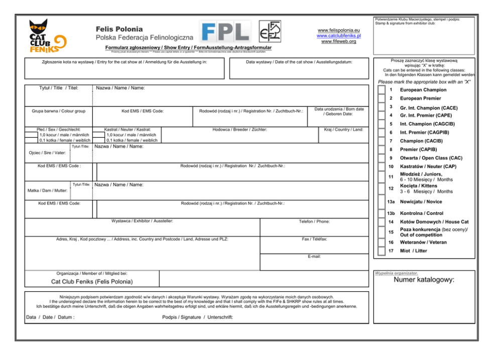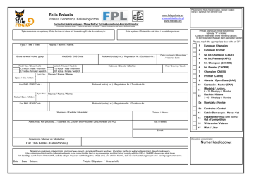 Potwierdzenie Klubu Macierzystego, stempel i podpis: Stamp & signature from exhibitor club: www.felispolonia.eu www.catclubfeniks.pl www.fifeweb.org Formularz zgłoszeniowy / Show Entry / FormAusstellung-Antragsformular Prosimy pisać drukowanymi literami *** Please use capital letters or a typewriter *** Bitte mit Schreibmaschine oder deutlich er Blockschrift ausfüllen .. .. Zgłoszenie kota na wystawę / Entry for the cat show at / Anmeldung für die Ausstellung in: Data wystawy / Date of the cat show / Ausstellungsdatum: Proszę zaznaczyć klasę wystawową wpisując “X” w kratkę: Cats can be entered in the following classes: In den folgenden Klassen kann gemeldet werden: Please mark the appropriate box with an ”X” Tytuł / Title / Titel: . . Nazwa / Name / Name: Grupa barwna / Colour group Kod EMS / EMS Code: Płeć / Sex / Geschlecht: 1,0 kocur / male / männlich 0,1 kotka / female / weiblich Tytuł /Title: . .. Rodowód (rodzaj i nr.) / Registration Nr. / Zuchtbuch-Nr.: .. Data urodzenia / Born date / Geboren Date: Hodowca / Breeder / Züchter: Kastrat / Neuter / Kastrat: 1,0 kocur / male / männlich 0,1 kotka / female / weiblich Kraj / Country / Land: . Nazwa / Name / Name: Ojciec / Sire / Vater: Kod EMS / EMS Code : . Rodowód (rodzaj i nr.) / Registration Nr./ Zuchtbuch-Nr.: . . .. 1 European Champion 2 European Premier 3 Gr. Int. Champion (CACE) 4 Gr. Int. Premier (CAPE) 5 Int. Champion (CAGCIB) 6 Int. Premier (CAGPIB) 7 Champion (CACIB) 8 Premier (CAPIB) 9 Otwarta / Open Class (CAC) 10 Kastratów / Neuter (CAP) Młodzież / Juniors, 6 - 10 Miesięcy / Months Kocięta / Kittens 3 - 6 Miesięcy / Months 11 Tytuł /Title: Nazwa / Name / Name: 12 Matka / Dam / Mutter: . Rodowód (rodzaj i nr.) / Registration Nr. / Zuchtbuch-Nr.: Kod EMS / EMS Code: . Wystawca / Exhibitor / Aussteller: . . Adres, Kraj , Kod pocztowy ... / Address, inc. Country and Postcode / Land, Adresse und PLZ: . Telefon / Phone: . . Fax / Téléfax: 13a Nowicjatu / Novice 13b Kontrolna / Control 14 Kotów Domowych / House Cat 15 Poza konkurencja (bez oceny)/ Out of competition 16 Weteranów / Veteran 17 Miot / Litter E-mail: Wypełnia organizator. Organizacja / Member of / Mitglied bei: Numer katalogowy: Cat Club Feniks (Felis Polonia) Niniejszym podpisem potwierdzam zgodność w/w danych i akceptuje Warunki wystawy. Wyrażam zgodę na wykorzystanie moich danych osobowych. I the undersigned declare the information herein to be correct to the best of my knowledge and that I shall comply with the FIFe & SHKRP show rules at all times. Ich bestätige durch meine Unterschrift, daß die obigen Angaben wahrheitsgetreu erfolgt sind, und erkläre hiermit, daß ich die Ausstellungsregeln und -bedingungen anerkenne. Data / Date / Datum : Podpis / Signature / Unterschrift: