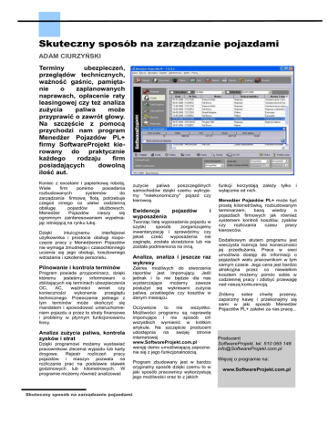 Skuteczny sposób na zarządzanie pojazdami ADAM CIURZYŃSKI Terminy ubezpieczeń, przeglądów technicznych, ważność gaśnic, pamiętanie o zaplanowanych naprawach, opłacenie raty leasingowej czy też analiza zużycia paliwa może przyprawić o zawrót głowy. Na szczęście z pomocą przychodzi nam program Menedżer Pojazdów PL+ firmy SoftwareProjekt kierowany do praktycznie każdego rodzaju firm posiadających dowolną ilość aut. Koniec z excelami i papierkową robotą. Wiele firm pomimo posiadania rozbudowanych systemów do zarządzania firmową flotą potrzebuje czegoś innego co ułatwi codzienną obsługę pojazdów służbowych. Menedżer Pojazdów cieszy się ogromnym zainteresowaniem wypełniając istniejącą na rynku lukę. Dzięki intuicyjnemu interfejsowi użytkownika i prostocie obsługi rozpoczęcie pracy z Menedżerem Pojazdów nie wymaga żmudnego i czasochłonnego uczenia się jego obsługi, kosztownego wdrażania i szkolenia personelu. Pilnowanie i kontrola terminów Program posiada przypominacz, dzięki któremu jesteśmy informowani o zbliżających się terminach ubezpieczenia OC, AC, ważności winiet czy konieczności wykonania przeglądu technicznego. Przeoczenie jednego z tym terminów może skończyć się mandatem i spowodować unieruchomieniem pojazdu a przez to straty finansowe i problemy w płynnym funkcjonowaniu firmy. Analiza zużycia paliwa, kontrola zysków i strat Dzięki programowi możemy wystawiać pracownikowi zlecenia wyjazdu lub karty drogowe. Rejestr rozliczeń pracy pojazdów i maszyn pozwala na rozliczanie prac na podstawie stawek godzinowych lub kilometrowych. W programie możemy również analizować Skuteczny sposób na zarządzanie pojazdami zużycie paliwa poszczególnych samochodów dzięki czemu wykryjemy "nieekonomiczny" pojazd czy kierowcę. Ewidencja pojazdów wyposażenia i Tworząc listę wyposażenia pojazdu w szybki sposób zorganizujemy inwentaryzację i sprawdzimy czy jakaś cześć wyposażenia nie zaginęła, została skradziona lub nie została podmieniona na inną. Analiza, analiza i jeszcze raz wykresy Zakres możliwych do stworzenia raportów jest imponujący. Jeśli jednak i to nie będzie dla nas wystarczające możemy zawsze posłużyć się wykresami zużycia paliwa, przebiegów czy kosztów w danym miesiącu. Oczywiście to nie wszystko. Możliwości programu są naprawdę imponujące i nie sposób ich wszystkich wymienić w krótkim artykule. Na szczęście producent udostępnia na swojej stronie internetowej www.SoftwareProjekt.com.pl wersję demo umożliwiającą zapoznanie się z jego funkcjonalnością. Program zbudowany jest w bardzo oryginalny sposób dzięki czemu to w jaki sposób pracownicy wykorzystują jego możliwości oraz to z jakich funkcji korzystają wyłącznie od nich. zależy tylko i Menedżer Pojazdów PL+ może być prostą kilometrówką, rozbudowanym terminarzem, bazą wiedzy o pojazdach firmowych jak również systemem kontroli kosztów, zysków czy rozliczania czasu pracy kierowców. Dodatkowym atutem programu jest wieczysta licencja bez konieczności jej przedłużania. Praca w sieci umożliwia dostęp do informacji o pojazdach wielu pracownikom w tym samym czasie. Jego cena jest bardzo atrakcyjna przez co niewielkim kosztem możemy pomóc sobie w codziennej pracy i zdobyć przewagę nad naszą konkurencją. Zróbmy sobie chwilę przerwy, zaparzmy kawę i przekonajmy się sami w jaki sposób Menedżer Pojazdów PL+ załatwi za nas pracę... Producent SoftwareProjekt, tel. 510 065 146 [email protected] Więcej o programie na: www.SoftwareProjekt.com.pl