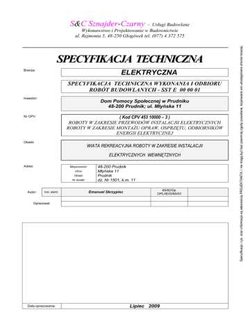 S&C Sznajder-Czarny – Usługi Budowlane Pracownia Usług Pr SPECYFIKACJA TECHNICZNA BranŜa: ELEKTRYCZNA SPECYFIKACJA TECHNICZNA WYKONANIA I ODBIORU ROBÓT BUDOWLANYCH - SST E 00 00 01 Inwestor: Dom Pomocy Społecznej w Prudniku 48-200 Prudnik; ul. Młyńska 11 Nr CPV: ( Kod CPV 453 10000 – 3 ) ROBOTY W ZAKRESIE PRZEWODÓW INSTALACJII ELEKTRYCZNYCH ROBOTY W ZAKRESIE MONTAśU OPRAW, OSPRZĘTU, ODBIORNIKÓW ENERGII ELEKTRYCZNEJ Obiekt: WIATA REKREACYJNA ROBOTY W ZAKRESIE INSTALACJII ELEKTRYCZNYCH WEWNĘTZNYCH Adres: Miejscowość: Ulica: Obręb: Nr działki: Autor: Inst. elektr. 48-200 Prudnik Młyńska 11 Prudnik dz. Nr 1501, k.m. 11 Emanuel Skrzypiec 85/82/Op OPL/IE/0295/03 Opracował: Data opracowania: Lipiec 2009 Specyfikacja i rys. oraz informacje są własnością PROJEKTANTA. i nie mogą być bez pisemnej zgody powielane, kopiowane ani udostępniane stronie trzeciej. Wykonawstwo i Projektowanie w Budownictwie ul. Rejmonta 5, 48-250 Głogówek tel. (077) 4 372 575 wszelkie prawa autorskie zastrzeŜone, reprodukcja wzbroniona Dz.U. Nr24 poz.83 23/02/1994 SPIS TREŚCI 1. WSTĘP ………..................................................................................... 3 1.1. Nazwa nadana zamówieniu przez zamawiającego .......................... 3 1.2. Przedmiot ST .................................................................................... 3 1.3. Zakres stosowania ST ...................................................................... 3 1.4. Przedmiot i zakres robót objętych ST ............................................... 3 1.5. Określenia podstawowe, definicje ................................................... .3 1.6. Ogólne wymagania dotyczące robót ............................................... .4 1.7. Dokumentacja robót montaŜowych ................................................. .4 1.8. Nazwy i kody .....................................................................................4 2. WYMAGANIA DOTYCZĄCE WŁAŚCIWOSCI MATERIAŁÓW .......... .5 3. WYMAGANIA DOTYCZĄCE SPRZĘTU, MASZYN I NARZĘDZI.........8 4. WYMAGANIA DOTYCZĄCE TRANSPORTU ......................................8 5. WYMAGANIA DOTYCZĄCE WYKONANIA ROBÓT ...........................8 6. KONTROLA JAKOŚCI ROBÓT ..................................................................9 7. WYMAGANIA DOTYCZĄCE PRZEDMIARU I OBMIARU ROBÓT....... 9 8. ODBIÓR ROBÓT ............................................................................... 10 9. PODSTAWA ROZLICZENIA ROBÓT ................................................ 10 10. DOKUMENTY ODNIESIENIA .......................................................... 10 NajwaŜniejsze oznaczenia i skróty: ST – Specyfikacja Techniczna SST – Szczegółowa Specyfikacja Techniczna ITB – Instytut Techniki Budowlanej PZJ – Program Zabezpieczenia Jakości 2 wszelkie prawa autorskie zastrzeŜone, reprodukcja wzbroniona Dz.U. Nr24 poz.83 23/02/1994 1. WSTĘP 1.1. Nazwa nadana zamówieniu przez zamawiającego PROJEKT INSTALACJI ELEKTRYCZNEJ POZALICZNIKOWEJ - BUDOWA WIATY REKREACYJNEJ 48-200 Prudnik, Młyńska 11, Dom Pomocy Społecznej w Prudniku, dz. Nr 1501, k.m. 11 INSTALACJE ELEKTRYCZNE. 1.2. Przedmiot ST Przedmiotem niniejszej specyfikacji technicznej (SST) są wymagania dotyczące wykonania i odbioru robót związanych układaniem i montaŜem elementów instalacji elektrycznej (układanie kabli i przewodów, montaŜ osprzętu i opraw) w obiektach kubaturowych oraz obiektach budownictwa inŜynieryjnego. 1.3. Zakres stosowania ST Specyfikacja techniczna szczegółowa (SST), stosowanej jest jako dokument przetargowy i kontraktowy przy zlecaniu i realizacji robót wymienionych w pkt. 1.2. Projektant sporządzający dokumentację projektową i odpowiednie szczegółowe specyfikacje techniczne wykonania i odbioru robót budowlanych moŜe wprowadzać do niniejszej standardowej specyfikacji zmiany, uzupełnienia lub uściślenia, odpowiednie dla przewidzianych projektem robót, uwzględniające wymagania Zamawiającego oraz konkretne warunki realizacji robót, niezbędne do uzyskania wymaganego standardu i jakości tych robót. Odstępstwa od wymagań podanych w niniejszej specyfikacji mogą mieć miejsce tylko w przypadkach prostych robót o niewielkim znaczeniu, dla których istnieje pewność, Se podstawowe wymagania będą spełnione przy zastosowaniu metod wykonania wynikających z doświadczenia oraz uznanych reguł i zasad sztuki budowlanej. 1.4. Przedmiot i zakres robót objętych ST Ustalenia zawarte w niniejszej specyfikacji technicznej (SST) dotyczą zasad wykonywania i odbioru robót zwianych z: - układaniem kabli i przewodów elektrycznych, - montaŜem opraw, osprzętu, urządzeń i odbiorników energii elektrycznej, wraz z przygotowaniem podłoŜa i robotami towarzyszącymi, dla obiektów kubaturowych oraz obiektów budownictwa inŜynieryjnego. ST dotyczy wszystkich czynności mających na celu wykonanie robót związanych z: - kompletacja wszystkich materiałów potrzebnych do wykonania podanych wyŜej prac, - wykonaniem wszelkich robót pomocniczych w celu przygotowania podłoŜa (w szczególności roboty murarskie, ślusarsko-spawalnicze montaŜ elementów osprzętu instalacyjnego itp.), - ułoŜeniem wszystkich materiałów w sposób i w miejscu zgodnym z dokumentacja techniczną, - wykonaniem oznakowania zgodnego z dokumentacją techniczną wszystkich elementów wyznaczonych w dokumentacji, - ułoŜeniem drutu stalowego (dla instalacji prowadzonych w rurkach ), ułatwiającego docelowe wciąganie zaprojektowanych przewodów (np. dla sieci elektrycznej), - wykonaniem oznakowania zgodnego z dokumentacja techniczna wszystkich wyznaczonych kabli i przewodów, - przeprowadzeniem wymaganych prób i badań oraz potwierdzenie protokołami kwalifikującymi montowany element instalacji elektrycznej. 1.5. Określenia podstawowe, definicje Określenia podane w niniejszej specyfikacji technicznej (ST) są zgodne z odpowiednimi normami oraz o