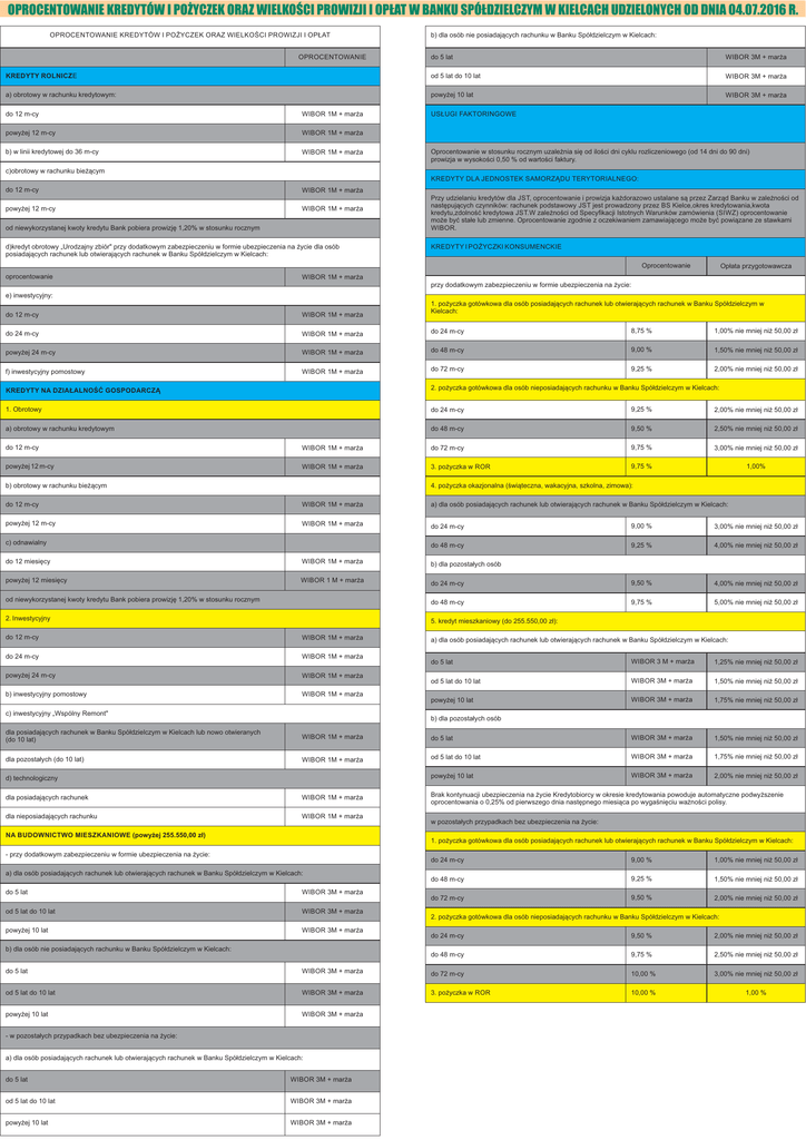 OPROCENTOWANIE KREDYTÓW I POŻYCZEK ORAZ WIELKOŚCI PROWIZJI I OPŁAT W BANKU SPÓŁDZIELCZYM W KIELCACH UDZIELONYCH OD DNIA 04.07.2016 R. OPROCENTOWANIE KREDYTÓW I POŻYCZEK ORAZ WIELKOŚCI PROWIZJI I OPŁAT b) dla osób nie posiadających rachunku w Banku Spółdzielczym w Kielcach: do 5 lat WIBOR 3M + marża KREDYTY ROLNICZE od 5 lat do 10 lat WIBOR 3M + marża a) obrotowy w rachunku kredytowym: powyżej 10 lat WIBOR 3M + marża OPROCENTOWANIE do 12 m-cy WIBOR 1M + marża powyżej 12 m-cy WIBOR 1M + marża b) w linii kredytowej do 36 m-cy WIBOR 1M + marża USŁUGI FAKTORINGOWE Oprocentowanie w stosunku rocznym uzależnia się od ilości dni cyklu rozliczeniowego (od 14 dni do 90 dni) prowizja w wysokości 0,50 % od wartości faktury. c)obrotowy w rachunku bieżącym KREDYTY DLA JEDNOSTEK SAMORZĄDU TERYTORIALNEGO: do 12 m-cy WIBOR 1M + marża powyżej 12 m-cy WIBOR 1M + marża od niewykorzystanej kwoty kredytu Bank pobiera prowizję 1,20% w stosunku rocznym d)kredyt obrotowy „Urodzajny zbiór" przy dodatkowym zabezpieczeniu w formie ubezpieczenia na życie dla osób posiadających rachunek lub otwierających rachunek w Banku Spółdzielczym w Kielcach: Przy udzielaniu kredytów dla JST, oprocentowanie i prowizja każdorazowo ustalane są przez Zarząd Banku w zależności od następujących czynników: rachunek podstawowy JST jest prowadzony przez BS Kielce,okres kredytowania,kwota kredytu,zdolność kredytowa JST.W zależności od Specyfikacji Istotnych Warunków zamówienia (SIWZ) oprocentowanie może być stałe lub zmienne. Oprocentowanie zgodnie z oczekiwaniem zamawiającego może być powiązane ze stawkami WIBOR. KREDYTY I POŻYCZKI KONSUMENCKIE Oprocentowanie oprocentowanie Opłata przygotowawcza WIBOR 1M + marża przy dodatkowym zabezpieczeniu w formie ubezpieczenia na życie: e) inwestycyjny: 1. pożyczka gotówkowa dla osób posiadających rachunek lub otwierających rachunek w Banku Spółdzielczym w Kielcach: do 12 m-cy WIBOR 1M + marża do 24 m-cy WIBOR 1M + marża do 24 m-cy 8,75 % 1,00% nie mniej niż 50,00 zł powyżej 24 m-cy WIBOR 1M + marża do 48 m-cy 9,00 % 1,50% nie mniej niż 50,00 zł f) inwestycyjny pomostowy WIBOR 1M + marża do 72 m-cy 9,25 % 2,00% nie mniej niż 50,00 zł KREDYTY NA DZIAŁALNOŚĆ GOSPODARCZĄ 2. pożyczka gotówkowa dla osób nieposiadających rachunku w Banku Spółdzielczym w Kielcach: 1. Obrotowy do 24 m-cy 9,25 % 2,00% nie mniej niż 50,00 zł a) obrotowy w rachunku kredytowym do 48 m-cy 9,50 % 2,50% nie mniej niż 50,00 zł do 12 m-cy WIBOR 1M + marża do 72 m-cy 9,75 % 3,00% nie mniej niż 50,00 zł powyżej 12 m-cy WIBOR 1M + marża 3. pożyczka w ROR 9,75 % 1,00% b) obrotowy w rachunku bieżącym 4. pożyczka okazjonalna (świąteczna, wakacyjna, szkolna, zimowa): do 12 m-cy WIBOR 1M + marża a) dla osób posiadających rachunek lub otwierających rachunek w Banku Spółdzielczym w Kielcach: powyżej 12 m-cy WIBOR 1M + marża do 24 m-cy 9,00 % 3,00% nie mniej niż 50,00 zł do 48 m-cy 9,25 % 4,00% nie mniej niż 50,00 zł c) odnawialny do 12 miesięcy WIBOR 1M + marża b) dla pozostałych osób powyżej 12 miesięcy WIBOR 1 M + marża do 24 m-cy 9,50 % 4,00% nie mniej niż 50,00 zł od niewykorzystanej kwoty kredytu Bank pobiera prowizję 1,20% w stosunku rocznym do 48 m-cy 9,75 % 5,00% nie mniej niż 50,00 zł 2. Inwestycyjny 5. kredyt mieszkaniowy (do 255.550,00 zł): do 12 m-cy WIBOR 1M + marża do 24 m-cy WIBOR 1M + marża powyżej 24 m-cy WIBOR 1M + marża b) inwestycyjny pomostowy WIBOR 1M + marża c) inwestycyjny „Wspólny Remont" a) dla osób posiadających rachunek lub otwierających rachunek w Banku Spółdzielczym w Kielcach: do 5 lat WIBOR 3 M + marża 1,25% nie mniej niż 50,00 zł od 5 lat do 10 lat WIBOR 3M + marża 1,50% nie mniej niż 50,00 zł powyżej 10 lat WIBOR 3M + marża 1,75% nie mniej niż 50,00 zł b) dla pozostałych osób dla posiadających rachunek w Banku Spółdzielczym w Kielcach lub nowo otwieranych (do 10 lat) WIBOR 1M + marża do 5 lat WIBOR 3M + marża 1,50% nie mniej niż 50,00 zł dla pozostałych (do 10 lat) WIBOR 1M + marża od 5 lat do 10 lat WIBOR 3M + marża 1,75% nie mniej niż 50,00 zł powyżej 10 lat WIBOR 3M + marża 2,00% nie mniej niż 50,00 zł d) technologiczny dla posiadających rachunek WIBOR 1M + marża dla nieposiadających rachunku WIBOR 1M + marża NA BUDOWNICTWO MIESZKANIOWE (powyżej 255.550,00 zł) Brak kontynuacji ubezpieczenia na życie Kredytobiorcy w okresie kredytowania powoduje automatyczne podwyższenie oprocentowania o 0,25% od pierwszego dnia następnego miesiąca po wygaśnięciu ważności polisy. w pozostałych przypadkach bez ubezpieczenia na życie: 1. pożyczka gotówkowa dla osób posiadających rachunek lub otwierających rachunek w Banku Spółdzielczym w Kielcach: - przy dodatkowym zabezpieczeniu w formie ubezpieczenia na życie: a) dla osób posiadających rachunek lub otwierających rachunek w Banku Spółdzielczym w Kielcach: do 5 lat WIBOR 3M + marża od 5 lat do 10 lat WIBOR 3M + marża powyżej 10 lat WIBOR 3M + marża b) dla osób nie posiadających rachunku w Banku Spółdzielczym w Kielcach: do 24 m-cy 9,00 % 1,00% nie mniej niż 50,00 zł do 48 m-cy 9,25 % 1,50% nie mniej niż 50,00 zł do 72 m-cy 9,50 % 2,00% nie mniej niż 50,00 zł 2. pożyczka gotówkowa dla osób nieposiadających rachunku w Banku Spółdzielczym w Kielcach: do 24 m-cy 9,50 % 2,00% nie mniej niż 50,00 zł do 48 m-cy 9,75 % 2,50% nie mniej niż 50,00 zł do 5 lat WIBOR 3M + marża do 72 m-cy 10,00 % 3,00% nie mniej niż 50,00 zł od 5 lat do 10 lat WIBOR 3M + marża 3. pożyczka w ROR 10,00 % 1,00 % powyżej 10 lat WIBOR 3M + marża - w pozostałych przypadkach bez ubezpieczenia na życie: a) dla osób posiadających rachunek lub otwierających rachunek w Banku Spółdzielczym w Kielcach: do 5 lat WIBOR 3M + marża od 5 lat do 10 lat WIBOR 3M + marża powyżej 10 lat WIBOR 3M + marża OPROCENTOWANIE KREDYTÓW I POŻYCZEK ORAZ WIELKOŚCI PROWIZJI I OPŁAT W BANKU S