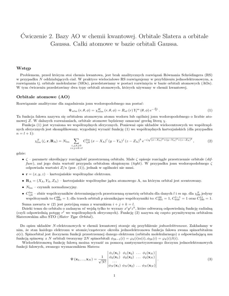 Ćwiczenie 2. Bazy AO w chemii kwantowej. Orbitale Slatera a orbitale