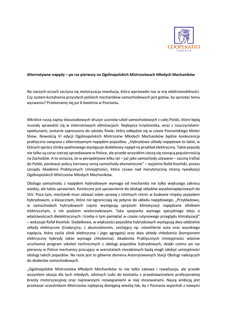 Alternatywne napędy – po raz pierwszy na Ogólnopolskich Mistrzostwach Młodych Mechaników Na naszych oczach zaczyna się motoryzacja rewolucja, która wprowadzi nas w erę elektromobilności. Czy system kształcenia przyszłych polskich mechaników samochodowych jest gotów, by sprostać temu wyzwaniu? Przekonamy się już 6 kwietnia w Poznaniu. Wkrótce ruszą zapisy dwuosobowych drużyn uczniów szkół samochodowych z całej Polski, które będą musiały sprawdzić się w internetowych eliminacjach. Najlepsza trzydziestka, wraz z nauczycielamiopiekunami, zostanie zaproszona do udziału finale, który odbędzie się w czasie Poznańskiego Motor Show. Nowością VI edycji Ogólnopolskich Mistrzostw Młodych Mechaników będzie konkurencja praktyczna związana z alternatywnym napędem pojazdów. „Hybrydowe układy napędowe to takie, w których oprócz silnika spalinowego występuje dodatkowy napęd na przykład elektryczny. Takie pojazdy nie tylko są coraz szerzej sprzedawane w Polsce, ale przede wszystkim cieszą się rosnącą popularnością na Zachodzie. A to oznacza, że w perspektywie kilku lat – już jako samochody używane – zaczną trafiać do Polski, ponieważ polscy kierowcy cenią samochody ekonomiczne” – wyjaśnia Rafał Kosiński, prezes zarządu Akademii Praktycznych Umiejętności, która czuwa nad merytoryczną stroną rywalizacji Ogólnopolskich Mistrzostw Młodych Mechaników. Obsługa samochodu z napędem hybrydowym wymaga od mechanika nie tylko większego zakresu wiedzy, ale także uprawnień. Konieczne jest uprawnienie do obsługi układów wysokonapięciowych do 1kV. Poza tym, mechanik musi zdawać sobie sprawę z istotnych różnic w budowie między pojazdem hybrydowym, a klasycznym, które nie ograniczają się jedynie do układu napędowego. „Przykładowo, w samochodach hybrydowych często występują sprężarki klimatyzacji napędzane silnikiem elektrycznym, a nie paskiem wielorowkowym. Taka sprężarka wymaga specjalnego oleju o właściwościach dielektrycznych i trzeba o tym pamiętać w czasie rutynowego przeglądu klimatyzacji” – wskazuje Rafał Kosiński. Dodatkowo, w większości pojazdów hybrydowych występują dwa oddzielne układy elektryczne (tradycyjny, z akumulatorem, zasilający np. oświetlenie auta oraz wysokiego napięcia, który zasila silnik elektryczny i jego agregaty) oraz dwa układy chłodzenia (komponent elektryczny hybrydy także wymaga chłodzenia). Akademia Praktycznych Umiejętności właśnie uruchamia program szkoleń technicznych z obsługi pojazdów hybrydowych, dzięki czemu po raz pierwszy w Polsce mechanicy pracujący w warsztatach niezależnych będą mogli zdobyć umiejętności obsługi takich pojazdów. Na razie jest to głównie domena Autoryzowanych Stacji Obsługi należących do dealerów samochodowych. „Ogólnopolskie Mistrzostwa Młodych Mechaników to nie tylko zabawa i rywalizacja, ale przede wszystkim okazja dla tych młodych, zdolnych ludzi do kontaktu z przedstawicielami profesjonalnej branży motoryzacyjnej oraz najnowszymi rozwiązaniami w niej stosowanymi. Naszą ambicją jest przekazać uczestnikom Mistrzostw najlepszą dostępną wiedzę tak, by z Poznania wyjechali z nowymi umiejętnościami i chęcią do dalszej nauki” – dodaje Adrian Dekowski, prezes zarządu Fundacji Cooperatio, która jest organizatorem tego wydarzenia. Więcej informacji na www.mistrzostwamechanikow.pl. Podpisy do zdjęć: 1. Silnik jak silnik? Nieprawda: to elektryczna jednostka napędowa Hyundaia Ioniqa. Pomarańczowym kolorem oznaczone są przewody wysokiego napięcia, po prawej stronie widać tradycyjny akumulator 12V podstawowej instalacji elektrycznej, zapewniającej między innymi zasilanie oświetlenia czy oczyszczania szyb. 2. Hybrydy plug-in to druga generacja spalinowo-elektrycznych układów napędowych. Taki samochód można także ładować „z gniazdka” i pokonać do kilkudziesięciu kilometrów w trybie bezemisyjnym, używając wyłącznie silnika lub silników elektrycznych.
