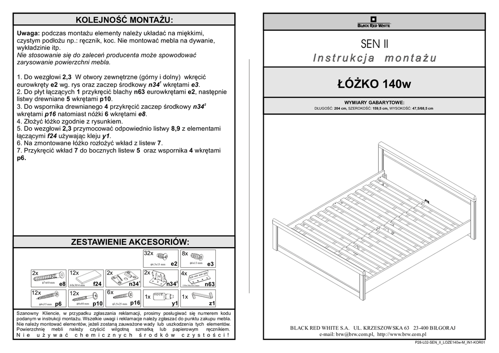 KOLEJNOÚà MONTAÝU: Uwaga: podczas monta¿u elementy nale¿y ukùadaã na miêkkimi, czystym podùo¿u np.: rêcznik, koc. Nie montowaã mebla na dywanie, wykùadzinie itp. Nie stosowanie siê do zaleceñ producenta mo¿e spowodowaã zarysowanie powierzchni mebla. 1. Do wezgùowi 2,3 W otwory zewnêtrzne (górny i dolny) wkrêciã 1 eurowkrêty e2 wg. rys oraz zaczep œrodkowy n34 wkrêtami e3. 2. Do pùyt ù¹cz¹cych 1 przykrêciã blachy n63 eurowkrêtami e2, nastêpnie listwy drewniane 5 wkrêtami p10. 2 3. Do wspornika drewnianego 4 przykrêciã zaczep œrodkowy n34 wkrêtami p16 natomiast nó¿ki 6 wkrêtami e8. 4. Zùo¿yã ùó¿ko zgodnie z rysunkiem. 5. Do wezgùowi 2,3 przymocowaã odpowiednio listwy 8,9 z elementami ù¹cz¹cymi f24 u¿ywaj¹c kleju y1. 6. Na zmontowane ùó¿ko rozùo¿yã wkùad z listew 7. 7. Przykrêciã wkùad 7 do bocznych listew 5 oraz wspornika 4 wkrêtami p6. SEN II £ÓÝKO 140w WYMIARY GABARYTOWE: D£UGOÚÃ: 204 cm, SZEROKOÚÃ: 159,5 cm, WYSOKOÚÃ: 47,5/68,5 cm ZESTAWIENIE AKCESORIÓW: 32x x13 mm 12x 2x 7x60 mm e8 12x x35 mm 60x30\4 mm p6 x40 mm n34 p10 x25 mm p16 x13 mm 2 1x e3 4x n34 1 6x 12x e2 2x 2x f24 8x y1 130x34x34/2mm 1x n63 z1 Szanowny Kliencie, w przypadku zgùaszania reklamacji, prosimy posùugiwaã siê numerem kodu podanym w instrukcji monta¿u. Wszelkie uwagi i reklamacje nale¿y zgùaszaã do punktu zakupu mebla. Nie nale¿y montowaã elementów, je¿eli zostan¹ zauwa¿one wady lub uszkodzenia tych elementów. Powierzchniê mebli nale¿y czyœciã wilgotn¹ szmatk¹ lub papierowym rêcznikiem. N i e u ¿ y w a ã c h e m i c z n y c h œ r o d k ó w c z y s t o œ c i ! BLACK RED WHITE S.A. UL. KRZESZOWSKA 63 23-400 BI£GORAJ e-mail: [email protected], http://www.brw.com.pl P28-L02-SEN_II_LOZE140w-M_IN1-KOR01 Symbol Wymiary elementu 1 1990x200 2 1590x610 3 1490x400 4 1973x70 5 1880x25 6 147x70 7 1872x697 8 1594x72 9 1494x72 n63 f24 e2 e2 y1 n63 Kod SE2-118/A SE2-014 SE2-015 ZZ1-710 ZZ1-709 SE2-408 ZZ1-502 SE2-581 SE2-582 p10 n341 e3 p6 e3 e3 e3 n342 p16 p16 p16 e8 P28-L02-SEN_II_LOZE140w-M_IN1-KOR01