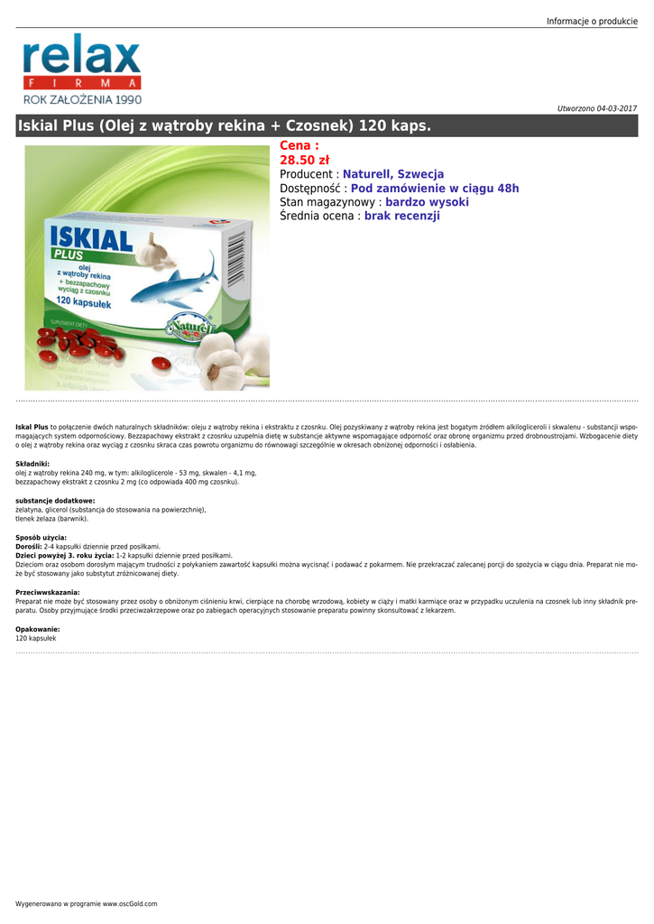 Informacje o produkcie Utworzono 04-03-2017 Iskial Plus (Olej z wątroby rekina + Czosnek) 120 kaps. Cena : 28.50 zł Producent : Naturell, Szwecja Dostępność : Pod zamówienie w ciągu 48h Stan magazynowy : bardzo wysoki Średnia ocena : brak recenzji Iskal Plus to połączenie dwóch naturalnych składników: oleju z wątroby rekina i ekstraktu z czosnku. Olej pozyskiwany z wątroby rekina jest bogatym żródłem alkilogliceroli i skwalenu - substancji wspomagających system odpornościowy. Bezzapachowy ekstrakt z czosnku uzupełnia dietę w substancje aktywne wspomagające odporność oraz obronę organizmu przed drobnoustrojami. Wzbogacenie diety o olej z wątroby rekina oraz wyciąg z czosnku skraca czas powrotu organizmu do równowagi szczególnie w okresach obniżonej odporności i osłabienia. Składniki: olej z wątroby rekina 240 mg, w tym: alkiloglicerole - 53 mg, skwalen - 4,1 mg, bezzapachowy ekstrakt z czosnku 2 mg (co odpowiada 400 mg czosnku). substancje dodatkowe: żelatyna, glicerol (substancja do stosowania na powierzchnię), tlenek żelaza (barwnik). Sposób użycia: Dorośli: 2-4 kapsułki dziennie przed posiłkami. Dzieci powyżej 3. roku życia: 1-2 kapsułki dziennie przed posiłkami. Dzieciom oraz osobom dorosłym mającym trudności z połykaniem zawartość kapsułki można wycisnąć i podawać z pokarmem. Nie przekraczać zalecanej porcji do spożycia w ciągu dnia. Preparat nie może być stosowany jako substytut zróżnicowanej diety. Przeciwwskazania: Preparat nie może być stosowany przez osoby o obniżonym ciśnieniu krwi, cierpiące na chorobę wrzodową, kobiety w ciąży i matki karmiące oraz w przypadku uczulenia na czosnek lub inny składnik preparatu. Osoby przyjmujące środki przeciwzakrzepowe oraz po zabiegach operacyjnych stosowanie preparatu powinny skonsultować z lekarzem. Opakowanie: 120 kapsułek Wygenerowano w programie www.oscGold.com