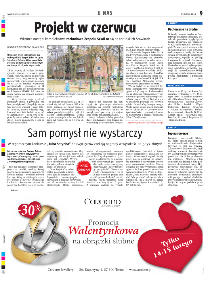C M Y K U NAS www.nowosci.com.pl 13 lutego 2014 Projekt w czerwcu krót ko Dachowanie na drodze Wkrótce nastąpi kompleksowa rozbudowa Zespołu Szkół nr 14 na toruńskich Stawkach JUSTYNA WOJCIECHOWSKA-NARLOCH C M Y K O kolejny, trzeci już budynek ma wzbogacić się Zespół Szkół nr 14 na Stawkach. Szkoła, która przed laty przejęła budynek po przeniesionym na Skarpę III LO, robi się za mała. ZS nr 14 przy ul. Hallera 79 funkcjonuje obecnie w dwóch gmachach. Pierwszy z nich to niewielki obiekt z aulą, drugi - okazały ceglany budynek, w przeszłości należący do iii Lo im. Lindego. Uczniowie podstawówki i gimnazjum nr 14 korzystają też ze zlokalizowanego obok basenu MoSiR. Fakt ten ma spory wpływ na rosnącą popularność szkoły. - Kiedy rodzice mogą wybierać pomiędzy szkołą z pływalnią lub bez, to większość zdecyduje się na ten pierwszy wariant - mówi Edyta Lisińska, mama 6-letniej olgi, która od września będzie się uczyć w „czternastce”. - Poza tym to naprawdę dobra szkoła. chodzą tam dzieci moich znajomych, a oni są bardzo zadowoleni. Jeden z budynków zajmowanych przez ZS nr 14. Kiedyś mieściło się tutaj III Liceum Ogólnokształcące FOT.: SłAWOMIR KOWALSKI o planach rozbudowy ZS nr 14 mówi się już od dawna. Kilka lat temu pojawiła się nawet koncepcja, aby na lewobrzeżu powołać szkołę ponadgimnazjalną, najlepiej liceum ogólnokształcące. Jedną z proponowanych wówczas lokalizacji był właśnie ZS nr 14 przy ul. Hallera. Miasto nie porzuciło tej koncepcji. w ogłoszonym niedawno przetargu na projekt rozbudowy znalazła się adnotacja, że ma on uwzględniać potrzeby gimnazjum oraz szkoły ponadgimnazjalnej. nowy budynek miałby posiadać dwie kondygnacje oraz łączną powierzchnię tysiąca metrów kwadra- towych. Ma się w nim znajdować m.in. pięć dużych sal i trzy małe. - na terenie Zespołu Szkół nr 14 ma być wybudowany 6-oddziałowy obiekt dydaktyczny na potrzeby szkół wchodzących w skład zespołu. w najbliższych latach liczba uczniów w Zespole Szkół nr 14 oraz w pobliskim Zespole Szkół nr 15 zdecydowanie wzrośnie. Budowa obiektu oraz korekta obwodów szkół pozwoli zapewnić lepsze warunki pracy zarówno ZS 14, jak i ZS 15 - wyjaśnia Aleksandra iżycka, rzeczniczka prezydenta Torunia. warto dodać, że w ostatnich latach kompleksowo rozbudowano „piętnastkę” przy ul. Paderewskiego. w ubiegłym roku zakończyły się natomiast prace w pobliskim przedszkolu przy ul. Złotej. Dzięki temu w placówce przybyło sto nowych miejsc. Mieszkańcy lewego brzegu wisły swoje dzieci mogą kształcić też w ZS nr 34 w czerniewicach (podstawówka i gimnazjum) oraz w kameralnej i pięknie położonej SP nr 17 na Rudaku. C M Y K - nie ma żadnego idealnego przepisu czy tabelki, według której można ocenić zabawny rysunek. To kwestia intuicji - twierdził Edward Lutczyn, który w minionych latach był jednym z jurorów toruńskiego konkursu. - Pomysł na rysunek nie może być banalny. Do tego docho- m ałże ńst wa Zawarte w Urzędzie Stanu cywilnego w Toruniu 1, 7 i 8 lutego 2014 r.: Michał Kalinowski - Klaudyna Braun, Krzysztof wolniszewski - Dorota Jaworska, Robert Stasiak - Edyta Piskorska, Łukasz Zaworski - Halina Karczewska, Łukasz Lewandowski - Kamila Delikat, Adrian Bilski - Katarzyna Jankowska, Krzysztof Bogusławski - Karolina Fidos. 9 97/112 Łup na rowerze W tegorocznym konkursie „Tuba Satyrica” na zwycięzców czekają nagrody w wysokości 11,5 tys. złotych dzi wykonanie warsztatowe. Gdy można zinterpretować dowolnie kreska jest nieudolna, pomysł nie „w odniesieniu do wszelkich przewystarczy. nie ma już teraz takich jawów ludzkiej aktywności (...) zarówno w odniesieniu do doświadpism, jak „Szpilki”. wygraczeń historycznych jak i czasów na w toruńskim konkursie obecnych, godnych najwyższej jest więc jedną z niewielu NASZ pochwały, jak i zdecydowaneszans, by zaistnieć. „Tuba Satyrica” ma chaPATRONAT go potępienia”. Główna narakter półotwarty i kierogroda w konkursie to 5 tys. zł. wana jest do artystów proDo tego dochodzi jeszcze pula fesjonalnie uprawiających nagród sponsorskich - 6,5 tys. zł. Zasady? Każdy uczestnik może karykaturę i rysunek satyryczny oraz do studentów wyższych szkół nadesłać nie więcej niż 5 prac. plastycznych. Hasło przewodnie Z konkursu wyłącza się rysunki w środę rano na drodze w Gortatowie niedaleko Brodnicy doszło do poważnie wyglądającej kolizji drogowej. na szczęście w zdarzeniu tym nikt nie ucierpiał. Ze wstępnych ustaleń policji wynika, że 21-latka kierująca volkswagenem caddy nie dostosowała prędkości do warunków drogowych, wpadła w poślizg i wywróciła pojazd. na szczęście kobiecie nic się nie stało. Uszkodzony został tylko pojazd oraz ogrodzenie prywatnej posesji. Za spowodowanie kolizji drogowej została ukarana przez policję mandatem i punktami (wap) karnymi. [email protected] Sam pomysł nie wystarczy Już po raz szósty w Dworze Artusa autorzy rysunków satyrycznych będą walczyć o nagrody. Hasło przewodnie tegorocznej edycji brzmi „We wszystkim miej miarę”. 9 opublikowane (również w internecie), nagradzane i zgłaszane do innych konkursów i nagród. Każdą pracę należy opatrzyć na odwrocie imieniem i nazwiskiem autora oraz ewentualnie tytułem. należy dołączyć do niej wypełnioną kartę zgłoszenia, którą można znaleźć na www.artus.torun.pl. Prace z dopiskiem „Tuba Satyrica” należy składać lub przesłać (decyduje data wpłynięcia) do 3 marca na adres: Dwór Artusa, Rynek Staromiejski 6, (tob) 87-100 Toruń. Policjanci zatrzymali 34-latka, który okradł jedną z irm w Aleksandrowie Kujawskim. wywiózł z niej na rowerze 3,5-metrowy dwuteownik, czyli stalowy element konstrukcyjny. Za popełnione przestępstwo grozi mu do 5 lat pozbawienia wolności. Złodzieja i łup zauważył na jednej z ulic pracownik okradzionej irmy. Gdy pr