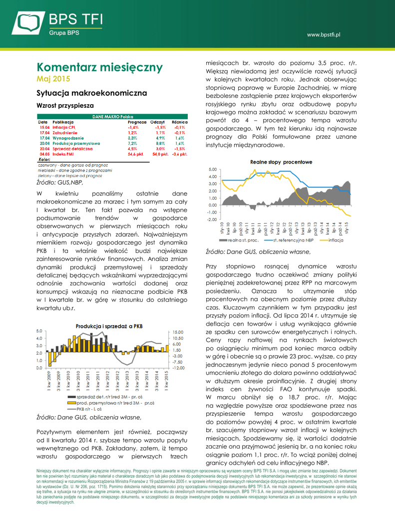 Komentarz miesięczny Maj 2015 Sytuacja makroekonomiczna Wzrost przyspiesza miesiącach br. wzrosło do poziomu 3,5 proc. r/r. Większą niewiadomą jest oczywiście rozwój sytuacji w kolejnych kwartałach roku. Jednak obserwując stopniową poprawę w Europie Zachodniej, w miarę bezbolesne zastąpienie przez krajowych eksporterów rosyjskiego rynku zbytu oraz odbudowę popytu krajowego można zakładać w scenariuszu bazowym powrót do 4 – procentowego tempa wzrostu gospodarczego. W tym też kierunku idą najnowsze prognozy dla Polski formułowane przez uznane instytucje międzynarodowe. Źródło: GUS,NBP, W kwietniu poznaliśmy ostatnie dane makroekonomiczne za marzec i tym samym za cały I kwartał br. Ten fakt pozwala na wstępne podsumowanie trendów w gospodarce obserwowanych w pierwszych miesiącach roku i antycypacje przyszłych zdarzeń. Najważniejszym miernikiem rozwoju gospodarczego jest dynamika PKB i ta właśnie wielkość budzi największe zainteresowanie rynków finansowych. Analiza zmian dynamiki produkcji przemysłowej i sprzedaży detalicznej będących wskaźnikami wyprzedzającymi odnośnie zachowania wartości dodanej oraz konsumpcji wskazują na nieznaczne podbicie PKB w I kwartale br. w górę w stosunku do ostatniego kwartału ub.r. Źródło: Dane GUS, obliczenia własne, Pozytywnym elementem jest również, począwszy od II kwartału 2014 r. szybsze tempo wzrostu popytu wewnętrznego od PKB. Zakładany, zatem, iż tempo wzrostu gospodarczego w pierwszych trzech Źródło: Dane GUS, obliczenia własne, Przy stopniowo rosnącej dynamice wzrostu gospodarczego trudno oczekiwać zmiany polityki pieniężnej zadekretowanej przez RPP na marcowym posiedzeniu. Oznacza to utrzymanie stóp procentowych na obecnym poziomie przez dłuższy czas. Kluczowym czynnikiem w tym przypadku jest przyszły poziom inflacji. Od lipca 2014 r. utrzymuje się deflacja cen towarów i usług wynikająca głównie ze spadku cen surowców energetycznych i rolnych. Ceny ropy naftowej na rynkach światowych po osiągnięciu minimum pod koniec marca odbiły w górę i obecnie są o prawie 23 proc. wyższe, co przy jednoczesnym jedynie nieco ponad 5 procentowym umocnieniu złotego do dolara powinno oddziaływać w dłuższym okresie proinflacyjnie. Z drugiej strony indeks cen żywności FAO kontynuuje spadki. W marcu obniżył się o 18,7 proc. r/r. Mając na względzie powyższe oraz spodziewane przez nas przyspieszenie tempa wzrostu gospodarczego do poziomów powyżej 4 proc. w ostatnim kwartale br. szacujemy stopniowy wzrost inflacji w kolejnych miesiącach. Spodziewamy się, iż wartości dodatnie zacznie ona przyjmować jesienią br. a na koniec roku osiągnie poziom 1,1 proc. r/r. To wciąż poniżej dolnej granicy odchyleń od celu inflacyjnego NBP. Niniejszy dokument ma charakter wyłącznie informacyjny. Prognozy i opinie zawarte w niniejszym opracowaniu są wyrazem oceny BPS TFI S.A. i mogą ulec zmianie bez zapowiedzi. Dokument ten nie powinien być rozumiany jako materiał o charakterze doradczym lub jako podstawa do podejmowania decyzji inwestycyjnych lub rekomendacja inwestycyjna, w szczególności nie stanowi on rekomendacji w rozumieniu Rozporządzenia Ministra Finansów z 19 października 2005 r. w sprawie informacji stanowiących rekomendacje dotyczące instrumentów finansowych, ich emitentów lub wystawców (Dz. U. Nr 206, poz. 1715). Pomimo dołożenia należytej staranności przy sporządzaniu niniejszego dokumentu BPS TFI S.A. nie może zapewnić, że prezentowane opinie okażą się trafne, a sytuacja na rynku nie ulegnie zmianie, w szczególności w stosunku do określonych instrumentów finansowych. BPS TFI S.A. nie ponosi jakiejkolwiek odpowiedzialności za działania lub zaniechania podjęte na podstawie niniejszego dokumentu, w szczególności za decyzje inwestycyjne podjęte na podstawie niniejszego komentarza ani za szkody poniesione w wyniku tych decyzji inwestycyjnych. Rynek akcji Powolny rozruch W kwietniu podobnie jak i w marcu sytuacja na warszawskiej giełdzie papierów wartościowych kształtowała się pozytywnie. Indeks WIG miesiąc zakończył na poziomie ponad 56,4 tys. pkt., a indeks WIG20 utrzymał się ponad 2,5 tys. pkt. W skali miesiąca indeks głównego rynku zyskał 4,4 proc., a indeks największych spółek 5,2 proc. Licząc od początku br. indeks WIG zyskał, więc już ponad 10 proc., a indeks WIG20 prawie 9 proc. (stan na 5 maja br.) . Zatem jak widać tendencje wzrostowe umacniają się. Jeśli jednak spojrzymy szerzej na sytuację na rynkach rozwiniętych i wschodzących to widać wyraźnie, że wzrosty na GPW nie wyglądają jakoś szczególnie imponująco. Kwiecień był pierwszym miesiącem tego roku, w którym średni dzienny poziom obrotów przekroczył poziom z przed roku (patrz wykres). Oczywiście do wyniku z 2013 r. wciąż jeszcze daleko (1129 mln zł), ale poprawa jest zauważalna. W kolejnych miesiącach poprawa koniunktury na GPW oraz większy ruch na rynku pierwotnym powinny spowodować napływ inwestorów indywidualnych. Źródło: Obliczenia własne, Źródło: Dane Bloomberg, Jak pisałem przed miesiącem o kondycji giełdy świadczy nie tylko sam poziom indeksu, ale również poziom dziennych obrotów? O ile wciąż jeszcze jest on niezbyt imponujący patrząc z perspektywy historycznej o tyle poprawa jest już widoczna. Źródło: Obliczenia własne, Wydaje się, że obecnie jest kilka czynników, które sprzyjają własne takiemu scenariuszowi. Po pierwsze pomimo ostatnich wzrostów na GPW, główne indeksy wciąż pozostają odległe od swoich historycznych maksimów. W przypadku indeksu WIG to poziom 67 568 pkt. z lipca 2007 r. (obecnie 56,4 tys. pkt.), a w przypadku indeksu WIG20 to 3 910 pkt. z października 2007 r. (obecnie nieco ponad 2,5 tys. pkt.) . Po wtóre na rynku długu widoczny jest gwałtowny spadek cen, co w najbliższej perspektywie nie będzie zachęcać do lokowania środków właśnie w tym segm