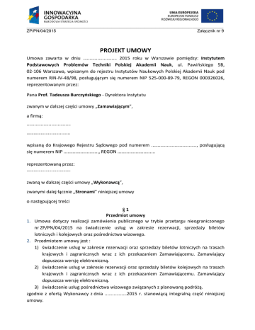 ______________________________________________________________________________________________________ Załącznik nr 9 ZP/PN/04/2015 PROJEKT UMOWY Umowa zawarta w dniu .......................... 2015 roku w Warszawie pomiędzy: Instytutem Podstawowych Problemów Techniki Polskiej Akademii Nauk, ul. Pawińskiego 5B, 02-106 Warszawa, wpisanym do rejestru Instytutów Naukowych Polskiej Akademii Nauk pod numerem RIN-IV-48/98, posługującym się numerem NIP 525-000-89-79, REGON 000326026, reprezentowanym przez: Pana Prof. Tadeusza Burczyńskiego - Dyrektora Instytutu zwanym w dalszej części umowy „Zamawiającym”, a firmą: .................................. ………………………......... wpisaną do Krajowego Rejestru Sądowego pod numerem ..................................., posługującą się numerem NIP ..........................., REGON ............................. reprezentowaną przez: ………………………………. zwaną w dalszej części umowy „Wykonawcą”, zwanymi dalej łącznie „Stronami” niniejszej umowy o następującej treści §1 Przedmiot umowy 1. Umowa dotyczy realizacji zamówienia publicznego w trybie przetargu nieograniczonego nr ZP/PN/04/2015 na świadczenie usług w zakresie rezerwacji, sprzedaży biletów lotniczych i kolejowych oraz pośrednictwa wizowego. 2. Przedmiotem umowy jest : 1) świadczenie usług w zakresie rezerwacji oraz sprzedaży biletów lotniczych na trasach krajowych i zagranicznych wraz z ich przekazaniem Zamawiającemu. Zamawiający dopuszcza wersję elektroniczną. 2) świadczenie usług w zakresie rezerwacji oraz sprzedaży biletów kolejowych na trasach krajowych i zagranicznych wraz z ich przekazaniem Zamawiającemu. Zamawiający dopuszcza wersję elektroniczną. 3) świadczenie usług pośrednictwa wizowego związanych z planowaną podróżą. zgodnie z ofertą Wykonawcy z dnia .................2015 r. stanowiącą integralną część niniejszej umowy. Załącznik nr 9 ZP/PN/04/2015 §2 Termin realizacji umowy Realizacja przedmiotu zamówienia odbywać się będzie sukcesywnie na podstawie zamówień złożonych w okresie od daty podpisania umowy do 31.12.2017 roku lub do wyczerpania limitu kwoty, o której mowa w § 4 ust.1. §3 Zobowiązania Wykonawcy W ramach realizacji zamówienia Wykonawca zobowiązuje się do : 1. sprzedaży biletów lotniczych zagranicznych i krajowych, także u przewoźników tzw. ”Tanie linie lotnicze”. 2. sprzedaży biletów kolejowych zagranicznych i krajowych. 3. wyszukiwania optymalnego połączenia pod względem ceny oraz czasu trwania podróży oraz przedstawiania Zamawiającemu niezwłocznie, nie później niż następnego dnia do godz.15.00 od złożenia zamówienia (telefonicznie, w formie elektronicznej [e-mail], faxem lub przez stronę internetową Wykonawcy) przez Zamawiającego z określeniem warunków podróży w tym m.in. czasu rozpoczęcia i zakończenia podróży minimum 2 wariantów przelotu , jeśli występują, oferując najtańszy bilet (najniższa cena biletu) na danej trasie i w danym dniu z wykorzystaniem wszystkich dostępnych promocji i taryf specjalnych. Składanie zamówienia osobiście lub telefonicznie winno być potwierdzone w formie pisemnej. 4. przekazania Zamawiającemu, z chwilą dokonania rezerwacji, jej potwierdzenia zawierającego ostateczną datę wykupu biletu na warunkach określonych w rezerwacji (przede wszystkim zachowanie określonej w rezerwacji ceny biletu lotniczego). Wykonawca będzie informował o zbliżających się terminach wykupu biletów przy dokonanych wcześniej rezerwacjach. 5. dostarczania biletów elektronicznych na określone przez Zamawiającego adresy poczty elektronicznej niezwłocznie tj.: nie później niż 3 godziny od momentu przekazania przez Zamawiającego prośby o wystawienie biletu. Bilety elektroniczne będą przekazywane, na adresy poczty elektronicznej określone przez Zamawiającego, bezpośrednio z terminalu Globalnego Systemu Dystrybucji (GDS) używanego przez Wykonawcę (niedopuszczalne jest przekazywanie tych biletów z adresów/skrzynek/poczty elektronicznej Wykonawcy). 6. dostarczania biletów papierowych do siedziby Zamawiającego lub w miejsca wskazane przez Zamawiającego na terenie Warszawy, wyłącznie na trasy, na które nie ma możliwości wystawienia biletów elektronicznych, w terminie ustalonym przez strony, nie później jednak niż 24 godziny przed planowanym terminem podróży 7. realizacji umowy korporacyjnej z LOT (Wykonawca zobowiązany jest do wpisywania na biletach nr umowy korporacyjnej ). Nr Umowy korporacyjnej z LOT: CTWAW273. 8. realizacji programów lojalnościowych linii lotniczych (np. AF i KLM-BlueBiz: PL01502, LHPartnerPlusBenefit: LCIPLB769; Um. CIP2RM9 – Austrian, Brussels Airlines, LH, Germanwings, Swiss),w tym kodowanie biletów w celu naliczenia punktów przez linię lotniczą. 9. zapewnienia biletu najtańszego na rynku, na danej trasie, z uwzględnieniem warunków podróży określonych przez Zamawiającego oraz bezkolizyjnej realizacji połączeń wieloetapowych i najkrótszych połączeń na danej trasie. 2 Załącznik nr 9 ZP/PN/04/2015 10. dokonywania bezpłatnych rezerwacji z uwzględnieniem: a) najlepszych cen (zniżki, promocje, stawki specjalne), b) szybkości i dogodności połączenia (przedstawianie kliku propozycji przelotu na wybranej trasie, także w celu ograniczenia kosztów podróży), c) informowanie drogą elektroniczną na adres e-mail (obejmujące dane rezerwacji, cenę biletu oraz termin wykupu) 11. przesyłania biletów w formie elektronicznej przez Wykonawcę Zamawiającemu zawierającymi dane identyczne z odpowiednimi danymi przechowywanymi w postaci elektronicznej w systemie rezerwacyjnym przewoźnika za pośrednictwem Globalnego Systemu Dystrybucji (GDS) użytkowanego przez Wykonawcę. Zakazane jest wprowadzanie jakichkolwiek zmian do biletu elektronicznego wygenerowanego za pośrednictwem stosowanego GDS. 12. bezkosztowego przyjmowania zw