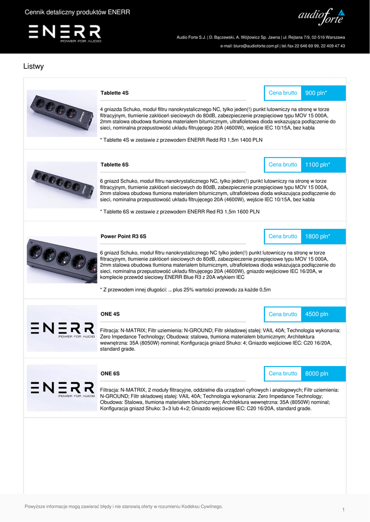 Cennik detaliczny produktów ENERR Audio Forte S.J. | D. Bączewski, A. Wójtowicz Sp. Jawna | ul. Rejtana 7/9, 02-516 Warszawa e-mail: [email protected] | tel./fax 22 646 69 99, 22 409 47 43 Listwy Tablette 4S Cena brutto 900 pln* 4 gniazda Schuko, moduł filtru nanokrystalicznego NC, tylko jeden(!) punkt lutowniczy na stronę w torze filtracyjnym, tłumienie zakłóceń sieciowych do 80dB, zabezpieczenie przepięciowe typu MOV 15 000A, 2mm stalowa obudowa tłumiona materiałem bitumicznym, ultrafioletowa dioda wskazująca podłączenie do sieci, nominalna przepustowość układu filtrujęcego 20A (4600W), wejście IEC 10/15A, bez kabla * Tablette 4S w zestawie z przewodem ENERR Redd R3 1,5m 1400 PLN Tablette 6S Cena brutto 1100 pln* 6 gniazd Schuko, moduł filtru nanokrystalicznego NC, tylko jeden(!) punkt lutowniczy na stronę w torze filtracyjnym, tłumienie zakłóceń sieciowych do 80dB, zabezpieczenie przepięciowe typu MOV 15 000A, 2mm stalowa obudowa tłumiona materiałem bitumicznym, ultrafioletowa dioda wskazująca podłączenie do sieci, nominalna przepustowość układu filtrujęcego 20A (4600W), wejście IEC 10/15A, bez kabla * Tablette 6S w zestawie z przewodem ENERR Red R3 1,5m 1600 PLN Power Point R3 6S Cena brutto 1800 pln* 6 gniazd Schuko, moduł filtru nanokrystalicznego NC tylko jeden(!) punkt lutowniczy na stronę w torze filtracyjnym, tłumienie zakłóceń sieciowych do 80dB, zabezpieczenie przepięciowe typu MOV 15 000A, 2mm stalowa obudowa tłumiona materiałem bitumicznym, ultrafioletowa dioda wskazująca podłączenie do sieci, nominalna przepustowość układu filtrujęcego 20A (4600W), gniazdo wejściowe IEC 16/20A, w komplecie przewód sieciowy ENERR Blue R3 z 20A wtykiem IEC * Z przewodem innej długości: … plus 25% wartości przewodu za każde 0,5m ONE 4S Cena brutto 4500 pln Filtracja: N-MATRIX; Filtr uziemienia: N-GROUND; Filtr składowej stałej: VAIL 40A; Technologia wykonania: Zero Impedance Technology; Obudowa: stalowa, tłumiona materiałem bitumicznym; Architektura wewnętrzna: 35A (8050W) nominal; Konfiguracja gniazd Shuko: 4; Gniazdo wejściowe IEC: C20 16/20A, standard grade. ONE 6S Cena brutto 8000 pln Filtracja: N-MATRIX, 2 moduły filtracyjne, oddzielne dla urządzeń cyfrowych i analogowych; Filtr uziemienia: N-GROUND; Filtr składowej stałej: VAIL 40A; Technologia wykonania: Zero Impedance Technology; Obudowa: Stalowa, tłumiona materiałem bitumicznym; Architektura wewnętrzna: 35A (8050W) nominal; Konfiguracja gniazd Shuko: 3+3 lub 4+2; Gniazdo wejściowe IEC: C20 16/20A, standard grade. Powyższe informacje mogą zawierać błędy i nie stanowią oferty w rozumieniu Kodeksu Cywilnego. 1 ZERO 6S Cena brutto 7000 pln* Filtracja: N-MATRIX; Filtr uziemienia: N-GROUND; Filtr składowej stałej: VAIL 40A; Technologia wykonania: Zero Impedance Technology; Obudowa: aluminiowa, modułowa, tłumiona materiałem bitumicznym; Architektura wewnętrzna: 45A (10350W) nominal; Konfiguracja gniazd Shuko: 6; Gniazdo wejściowe IEC: C20 16/20A, standard grade. * Gniazdo C20 16/20A, High-End audio grade, styki wykonane z czystej, 100% przewodzącej miedzi ETP dodatkowo 1000 PLN ZERO 8S Cena brutto 6000 pln* Filtracja: N-MATRIX; Filtr uziemienia: N-GROUND; Technologia wykonania: Zero Impedance Technology; Obudowa: aluminiowa, modułowa, tłumiona materiałem bitumicznym; Architektura wewnętrzna: 45A (10350W) nominal; Konfiguracja gniazd Shuko: 8; Gniazdo wejściowe IEC: C20 16/20A, standard grade. * Gniazdo C20 16/20A, High-End audio grade, styki wykonane z czystej, 100% przewodzącej miedzi ETP dodatkowo 1000 PLN AMULETT 4S Cena brutto 3000 pln* Filtracja: N-MATRIX; Filtr uziemienia: N-GROUND; Filtr składowej stałej: VAIL 30A; Technologia wykonania: Zero Impedance Technology; Obudowa: Stalowa, tłumiona materiałem bitumicznym; Architektura wewnętrzna: 28A (6440W) nominal; Konfiguracja gniazd Shuko: 4; Gniazdo wejściowe IEC: C20 16/20A, standard grade. Przewody Red R3 Cena brutto 600 pln* Konstrukcja: Dual Field; Materiał przewodników: miedź OFC 6N i elektrolityczna miedź posrebrzana; Materiał izolacji: HDPE; Ekranowanie: 2 gęste ekrany z ocynowanej miedzi; Otulina zewnętrzna: czarno/szara plecionka PVC; Wtyk Schuko: audio grade gold plated; Wtyk IEC: audio grade copper alloy; Nominalna przepustowość: 20A. * plus 25% wartości przewodu za każde 0,5m Blue R3 Cena brutto 800 pln* Konstrukcja: Dual Field; Materiał przewodników: miedź OFC 6N i elektrolityczna miedź posrebrzana; Materiał izolacji: HDPE; Ekranowanie: 2 gęste ekrany z ocynowanej miedzi; Otulina zewnętrzna: czarno/szara plecionka PVC; Wtyk Schuko: audio grade gold plated; Wtyk IEC: audio grade copper alloy; Nominalna przepustowość: 28A. * plus 25% wartości przewodu za każde 0,5m Powyższe informacje mogą zawierać błędy i nie stanowią oferty w rozumieniu Kodeksu Cywilnego. 2 Violet R3 Cena brutto 1400 pln* Konstrukcja: Dual Field PLUS; Materiał przewodników: miedź OFC 6N, miedź elektrolityczna czysta i posrebrzana; Materiał izolacji: HDPE; Ekranowanie: 2 gęste ekrany z ocynowanej miedzi elektrolitycznej; Otulina zewnętrzna: czarno/szara plecionka PVC; Wtyk Schuko: audio grade gold plated; Wtyk IEC: audio grade gold plated; Nominalna przepustowość: 38A. * plus 25% wartości przewodu za każde 0,5m Symbol Hybrid Cena brutto 2500 pln* Konstrukcja: Dual Field Design; Materiał przewodników: 2x hybryda z czystej i posrebrzanej miedzi elektrolitycznej, 4x miedź posrebrzana, 4x miedź OFC 6N; Materiał izolacji: Teflon FEP/HDPE; Ekranowanie: 2 gęste ekrany z ocynowanej miedzi elektrolitycznej; Otulina zewnętrzna: czarno/szara plecionka PVC; Wtyk Schuko: audio grade gold plated; Wtyk IEC: audio grade gold plated; Nominalna przepustowość: 44A. * plus 25% wartości przewodu za każde 0,5m Holograph Hybrid Cena brutto 3500 pln* Konstrukcja: Dual Field; Materiał przewodników: 4x hybryda z czystej i posrebrzanej miedzi elektrolitycznej, 4x miedź posrebrzana, 