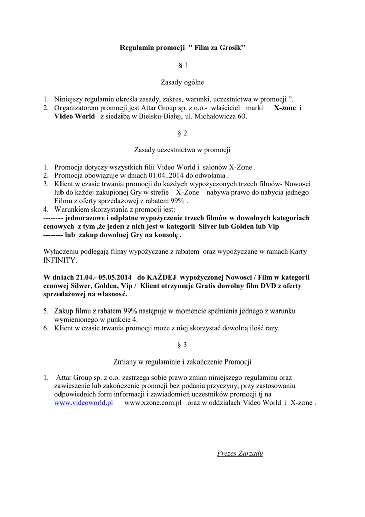 Regulamin promocji " Film za Grosik” §1 Zasady ogólne 1. Niniejszy regulamin określa zasady, zakres, warunki, uczestnictwa w promocji ”. 2. Organizatorem promocji jest Attar Group sp. z o.o.- właściciel marki X-zone i Video World z siedzibą w Bielsku-Białej, ul. Michałowicza 60. §2 Zasady uczestnictwa w promocji 1. Promocja dotyczy wszystkich filii Video World i salonów X-Zone . 2. Promocja obowiązuje w dniach 01.04..2014 do odwołania . 3. Klient w czasie trwania promocji do każdych wypożyczonych trzech filmów- Nowosci lub do każdej zakupionej Gry w strefie X-Zone nabywa prawo do nabycia jednego Filmu z oferty sprzedażowej z rabatem 99% . 4. Warunkiem skorzystania z promocji jest: -------- jednorazowe i odpłatne wypożyczenie trzech filmów w dowolnych kategoriach cenowych z tym ,że jeden z nich jest w kategorii Silver lub Golden lub Vip -------- lub zakup dowolnej Gry na konsolę . Wyłączeniu podlegają filmy wypożyczane z rabatem oraz wypożyczane w ramach Karty INFINITY. W dniach 21.04.- 05.05.2014 do KAŻDEJ wypożyczonej Nowosci / Film w kategorii cenowej Silwer, Golden, Vip / Klient otrzymuje Gratis dowolny film DVD z oferty sprzedażowej na własnosć. 5. Zakup filmu z rabatem 99% następuje w momencie spełnienia jednego z warunku wymienionego w punkcie 4. 6. Klient w czasie trwania promocji może z niej skorzystać dowolną ilość razy. §3 Zmiany w regulaminie i zakończenie Promocji 1. Attar Group sp. z o.o. zastrzega sobie prawo zmian niniejszego regulaminu oraz zawieszenie lub zakończenie promocji bez podania przyczyny, przy zastosowaniu odpowiednich form informacji i zawiadomień uczestników promocji tj na www.videoworld.pl www.xzone.com.pl oraz w oddziałach Video World i X-zone . Prezes Zarządu