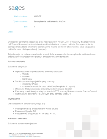 Kod szkolenia: Tytuł szkolenia: Dni: NUGET Zarządzanie pakietami z NuGet 1 Opis: Uczestnicy szkolenia zapoznają się z rozwiązaniem NuGet. Jest to natywny dla środowiska .NET sposób zarządzania zależnościami i artefaktami poprzez pakiety. Poza prezentacją samego menadżera omówione zostaną inne ważne elementy ekosystemu, takie jak galeria pakietów oraz pliki specyfikacji (nuspec). Zajęcia mają na celu wprowadzenie uczestników w zagadnienie zarządzania pakietami oraz przekazanie i wykształcenie praktyk związanych z tym tematem. Zakres szkolenia Szkolenie obejmuje: Wprowadzenie w podstawowe elementy biblioteki Widoki Modele Kontrolery Strukturyzowanie projektów przy pomocy: obszarów (Area) szablonów widoków oraz układów (Template & Layout) Używanie filtrów akcji oraz prawidłowe definiowanie ścieżek Elementy prawidłowej obsługi protokołu HTTP, szczególnie w zakresie Cache-Control Wytwarzanie serwisów RESTowych przy pomocy WebAPI Wymagania Od uczestników szkolenia wymaga się: Posługiwania się środowiskiem Visual Studio Znajomość języka C# Podstawowa znajomość HTTP oraz HTML Adresaci szkolenia Szkolenie adresowane jest do: Średnio zaawansowanych programistów .NET Cele szkolenia Głównymi celami szkolenia są: Zapoznanie się z zarządzaniem wspólnym elementami systemów poprzez pakiety NuGet Przygotowanie do wdrożenia zarządzania artefaktami poprzez NuGet w organizacji uczestnika Umiejętności zdobywane podczas zajęć Uczestnicy szkolenia po jego zakończeniu zdobędą następujące umiejętności: Definiowanie pakietów przy pomocy NuSpec Zarządzanie pakietami (tworzenie, instalacja) Wdrażanie i zarządzanie galerią pakietów Podstawy organizowania projektów i rozwiązań w oparciu o pakiety Parametry szkolenia Szkolenie trwa 1 dzień (1*7 godzin). Program szkolenia: 1. Wprowadzenie do zarządzania pakietami I. Definicja pakietu II. Pakiet jako element Continous Integration/Continous Delivery III. Semantyczne wersjonowanie aplikacji/bibliotek I. Analiza przykładowego pakietu II. Plik definicji pakietu III. Tworzenie i publikacja: i. Pakietów ii. Pakietów zlokalizowanych Od definicji iii. do pakietu Pakietów z symbolami 2. Galeria pakietów (NuGet Gallery) I. Instalacja II. Zarządzanie 3. Przegląd narzędzi współdziałających z pakietami NuGet I. Team City i publikacja pakietów II. OctopusDeploy Powered by TCPDF (www.tcpdf.org)