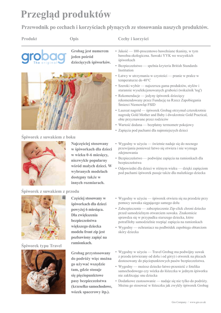 Przegląd produktów Przewodnik po cechach i korzyściach płynących ze stosowania naszych produktów. Produkt Opis Grobag jest numerem jeden pośród dziecięcych śpiworków. Cechy i korzyści • Jakość — 100-procentowo bawełniane tkaniny, w tym bawełna ekologiczna. Suwaki YYK we wszystkich śpiworkach • Bezpieczeństwo — spełnia kryteria British Standards Institution • Łatwy w utrzymaniu w czystości — pranie w pralce w temperaturze do 40°C • Szeroki wybór — najszersza gama produktów, stylów i starannie wyselekcjonowanych grubości (wskaźnik 'tog') • Rekomendacje — jedyny śpiworek dziecięcy rekomendowany przez Fundację na Rzecz Zapobiegania Śmierci Niemowląt FSID • Laureat nagród — śpiworek Grobag otrzymał czterokrotnie nagrodę Gold Mother and Baby i dwukrotnie Gold Practical, obie przyznawane przez rodziców • Wartość dodana — bezpłatny termometr pokojowy • Zapięcia pod pachami dla najmniejszych dzieci Śpiworek z suwakiem z boku Najczęściej stosowany • Wygodny w użyciu — świetnie nadaje się do nocnego przewijania ponieważ łatwo się otwiera i nie wymaga w śpiworkach dla dzieci zdejmowania w wieku 0-6 miesięcy, • Bezpieczeństwo — podwójne zapięcia na ramionkach dla niezwykle popularny bezpieczeństwa wśród małych dzieci. W • Odpowiedni dla dzieci w różnym wieku — dzięki zapięciom wybranych modelach pod pachami śpiworek pasuje także dla malutkiego dziecka dostępny także w innych rozmiarach. Śpiworek z suwakiem z przodu Śpiworek typu Travel Częściej stosowany w śpiworkach dla dzieci powyżej 6 miesiąca. Dla zwiększenia bezpieczeństwa większego dziecka modelu front zip jest pozbawiony zapięć na ramionkach. • Wygodny w użyciu — śpiworek otwiera się na przodzie przy pomocy suwaka sięgającego samego dołu • Zabezpieczenie — zabezpieczenie Zip-click chroni dziecko przed samodzielnym otwarciem suwaka. Znakomicie sprawdza się w przypadku starszego dziecka, które potrafiłoby samodzielnie rozpiąć zapięcia na ramionkach • Wygodny — ochraniacz na podbródek zapobiega obtarciom skóry dziecka Grobag przystosowany • Wygodny w użyciu — Travel Grobag ma podwójny suwak z przodu (otwierany od dołu i od góry) i otworek na plecach do podróży więc można dostosowany do pięciopunktowych pasów bezpieczeństwa. go używać wszędzie • Wygodny — możesz dziecko łatwo przenieść z fotelika tam, gdzie stosuje samochodowego czy wózka do łóżeczka w jednym śpiworku nie zakłócając snu dziecka się pięciopunktowe • Dodatkowe zastosowanie — nadaje się nie tylko do podróży. pasy bezpieczeństwa Można go stosować w łóżeczku jak zwykły śpiworek Grobag (krzesełko samochodowe, wózek spacerowy itp.). Gro Company / www.gro.co.uk Produkt Opis Cechy i korzyści Regulowana zasłona zaciemniająca do stosowania w domu i poza domem. • Przenośna — do używania w domu lub w podróży • Poprawia sen — zapewnia dogodne warunki dla snu poprzez blokadę światła. • Wygodna — w pełni dostosowuje się do większości okien. Przylega do szyby za pomocą przyssawek. • Jakość — czarna, gruba tkanina najwyższej jakości • Maksymalny rozmiar: 130 na 200 cm Cyfrowy termometr pokojowy zmieniający kolor w zależności od temperatury. • Sprytny — daje delikatne światło o barwie zmieniającej się w zależności od temperatury • Łatwy w użyciu — wystarczy jeden rzut oka (również z drugiego końca pokoju) • Bezpieczny — pozwala stworzyć najbezpieczniejsze warunki dla dziecka • Rekomendowany — produkt rekomendowany przez FSID • Kompatybilny ze śpiworkiem Grobag — pomocny przy wyborze grubości (wskaźnika 'tog') i ubranka przy korzystaniu ze śpiworka dziecięcego Grobag Nakładka na termometr Gro-egg. Nadaje Gro-egg uroczy charakter. • Nakładka na termometr Gro-egg tchnie nowe życie w Twój Gro-egg nadając mu nowy charakter • Zachowuje funkcję delikatnej lampki nocnej i termometru • Dostępny w trzech uroczych wariantach NEW ŚĆ! NOWO Zegar i nauczyciel czasu – • Sen dla Mamy i Dziecka — pozwala uniknąć nauczy dziecko kiedy czas przedwczesnych pobudek wstawać. • Zabawa — przyciąga uwagę i przemawia do dziecięcej wyobraźni • Łatwy do zrozumienia — ułatwi Maluchowi zrozumienie pojęcia czasu dzięki obrazkom słoneczka i znikającym gwiazdkom • Funkcjonalność — opcja cyfrowego wyświetlacza godzin zapozna dziecko z odczytywaniem czasu www.gro.co.uk / Gro Company