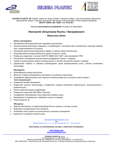 SILESIA PLASTIC SP. Z O.O. należy do Grupo Antolin i Industrias Alegre. Jest producentem elementów wyposażenia wnętrz z tworzyw sztucznych dla branży motoryzacyjnej. Firma posiada certyfikaty ISO/TS 16949, ISO 14001 oraz Ford Q1. Obecnie poszukujemy kandydatów do pracy na stanowisku: Kierownik Utrzymania Ruchu i Narzędziowni Miejsce pracy: Strzelin Zakres obowiązków: Zarządzanie kilkunastoosobowym zespołem pracowników Opracowywanie technologii związanej z modyfikacjami i remontami form wtryskowych wewnątrz zakładu oraz przeprowadzenie ich wyceny Utrzymanie technicznej infrastruktury zakładu w dobrym stanie technicznym, Gospodarowanie energią elektryczną, gazem ziemnym i wodą Praktyczna znajomość normami ISO/TS 16969, ISO 14001 oraz standardów TPM Planowanie i zarządzanie prewencyjnymi przeglądami maszyn i urządzeń Udział w opracowywaniu planów inwestycyjnych w ramach utrzymania maszyn i narzędzi Zapewnienie nadzoru w zakresie przestrzegania zasad bezpieczeństwa pracy, ochrony środowiska naturalnego Wymagania: Wykształcenie wyższe techniczne Minimum 3-letnie doświadczenie zawodowe na podobnym stanowisku Umiejętność diagnozowania oraz wsparcia merytorycznego przy usuwaniu awarii maszyn i form wtryskowych Znajomość obróbki skrawaniem Znajomość rysunku technicznego, umiejętność czytania schematów elektrycznych, pneumatycznych i hydraulicznych Dobra znajomość języka angielskiego Praktyczna znajomość MS Office, AutoCad Umiejętności menedżerskie oraz znajomość kodeksu pracy Nastawienie na współpracę i wdrażanie nowych rozwiązań Prawo jazdy kat. B Oferujemy: stabilne zatrudnienie w międzynarodowej firmie w oparciu o umowę o pracę atrakcyjne wynagrodzenie oraz szkolenia środowisko pracy oparte na nowoczesnych procesach zarządzania bezpieczne i przyjazne warunki pracy [email protected] lub Silesia Plastic Sp. z o.o., ul. Wrocławska 82, 57 - 100 Strzelin Informujemy, że skontaktujemy się tylko z wybranymi kandydatami. www.ialegre.com www.grupoantolin.com SILESIA PLASTIC Sp. z.o.o. Ul. Wrocławska 82, 57-100 Strzelin , PL REGON: 020075399, NIP: 8982065139, KAPITAŁ ZAKŁADOWY: 14 100 000 PLN KRS: 0000236792 – Sąd Rejonowy dla Wrocławia-Fabrycznej, VI Wydział Gospodarczy Krajowego Rejestru Sądowego