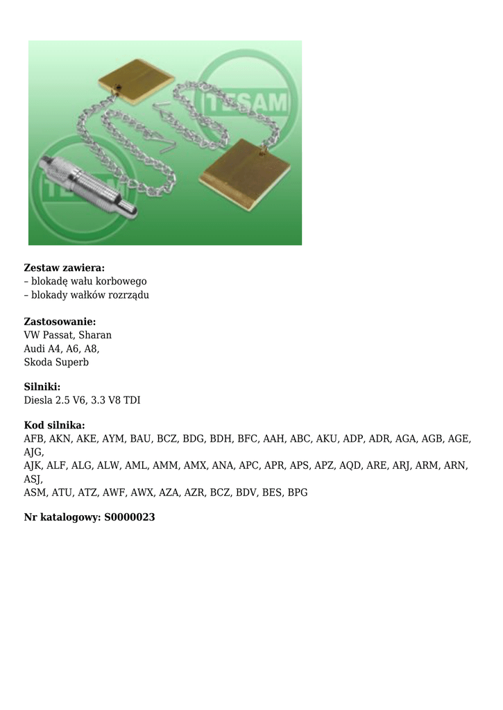 Zestaw zawiera: – blokadę wału korbowego – blokady wałków rozrządu Zastosowanie: VW Passat, Sharan Audi A4, A6, A8, Skoda Superb Silniki: Diesla 2.5 V6, 3.3 V8 TDI Kod silnika: AFB, AKN, AKE, AYM, BAU, BCZ, BDG, BDH, BFC, AAH, ABC, AKU, ADP, ADR, AGA, AGB, AGE, AJG, AJK, ALF, ALG, ALW, AML, AMM, AMX, ANA, APC, APR, APS, APZ, AQD, ARE, ARJ, ARM, ARN, ASJ, ASM, ATU, ATZ, AWF, AWX, AZA, AZR, BCZ, BDV, BES, BPG Nr katalogowy: S0000023