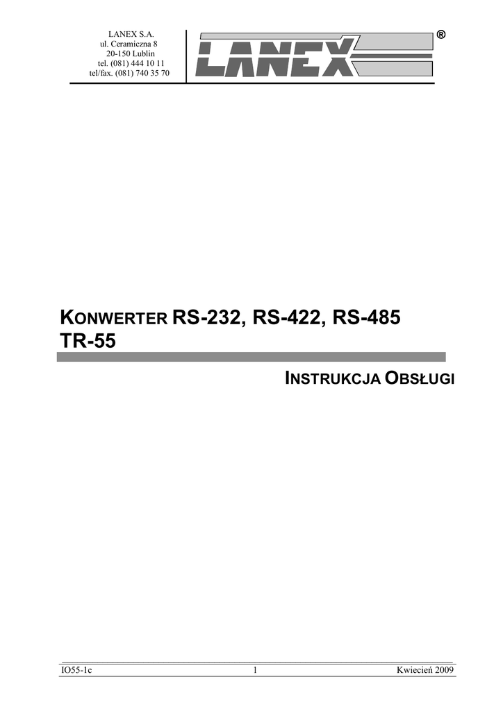 LANEX S.A. ul. Ceramiczna 8 20-150 Lublin tel. (081) 444 10 11 tel/fax. (081) 740 35 70 KONWERTER RS-232, RS-422, RS-485 TR-55 INSTRUKCJA OBSŁUGI _____________________________________________________________________________ IO55-1c 1 Kwiecień 2009 KONWERTER RS-232, RS-422, RS-485 INSTRUKCJA OBSŁUGI Spis treści 1. 2. 3. 4. 5. Charakterystyka ogólna................................................................................................. 5 1.1. Widok urządzenia..................................................................................................... 5 1.2. Przeznaczenie urządzenia......................................................................................... 5 1.3. Oznaczanie: .............................................................................................................. 6 1.4. Przykładowe sposoby wykorzystania konwertera.................................................... 7 Złącza i elementy sygnalizacyjne ............................................................................... 10 2.1. Złącza ..................................................................................................................... 12 2.1.1. TR-55.1 ........................................................................................................ 12 2.1.2. TR-55.2 ........................................................................................................ 13 2.2. Sygnalizacja ........................................................................................................... 14 2.3. Konfiguracja........................................................................................................... 14 Opis funkcjonalny ....................................................................................................... 15 Instalacja i obsługa...................................................................................................... 16 4.1. Warunki pracy ........................................................................................................ 16 4.2. Instalacja................................................................................................................. 16 4.3. Terminowanie magistrali........................................................................................ 16 4.4. Zasięg transmisji .................................................................................................... 17 4.4.1. Zasięg transmisji po stronie elektrycznej ..................................................... 17 4.4.2. Zasięg transmisji po stronie optycznej ......................................................... 17 4.5. Zasady posługiwania się złączami światłowodowymi........................................... 18 4.6. Zasilanie ................................................................................................................. 18 Dane techniczne .......................................................................................................... 18 5.1. Parametry optyczne ................................................................................................ 18 5.2. Parametry elektryczne interfejsów RS-232, RS-422, RS-485 ............................... 19 5.2.1. Interfejs RS-232 ........................................................................................... 19 5.2.2. Interfejs RS-422 i RS-485 ............................................................................ 19 5.3. Parametry mechaniczne.......................................................................................... 19 5.4. Wymagania środowiskowe .................................................................................... 19 5.4.1. Eksploatacja ................................................................................................. 19 5.4.2. Transport ...................................................................................................... 20 5.5. Kompatybilność elektromagnetyczna .................................................................... 20 5.6. Zasilanie ................................................................................................................. 20 5.7. Kompletacja wyrobu .............................................................................................. 21 Spis rysunków Rysunek 1. Widok urządzenia.................................................................................................... 5 Rysunek 2. Widok panelu przedniego konwertera TR-55 w wersji dwuwłóknowej z dwoma portami optycznymi.................................................................................................................. 10 Rysunek 3. Widok panelu przedniego konwertera TR-55 w wersji dwuwłóknowej z jednym portem optycznym.................................................................................................................... 10 Rysunek 4. Widok panelu przedniego konwertera TR-55 w wersji jednowłóknowej z dwoma portami optycznymi.................................................................................................................. 11 Rysunek 5. Widok panelu przedniego konwertera TR-55 w wersji jednowłóknowej z jednym portem optycznym.................................................................................................................... 11 Rysunek 6. Widok dołu konwertera TR-55 (wszystkie wersje)............................................... 12 Rysunek 7. Numeracja pinów złącza RJ-45............................................................................. 12 Rysunek 8. Złącze zasilania ..................................................................................................... 13 Rysunek 9. Numeracja pinów złącza śrubowego..................................................................... 13 ________________________________________________________________ IO55-1c 2 Kwiecień 2009 KONWERTER RS-232, RS-422, RS-485 INSTRUKCJA OBSŁUGI Rysun