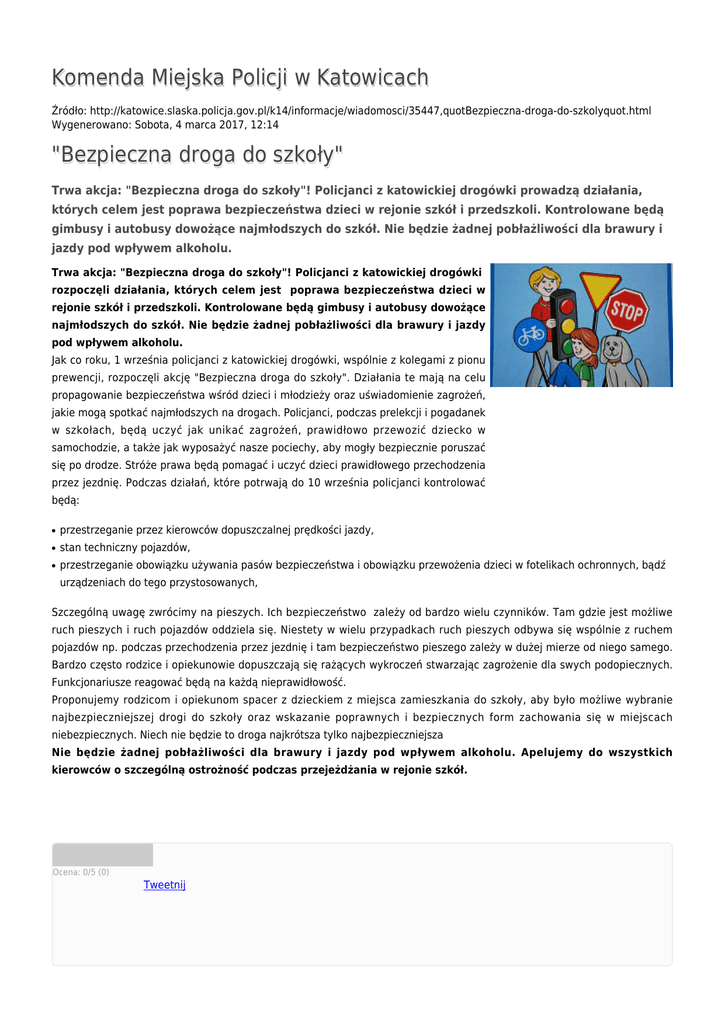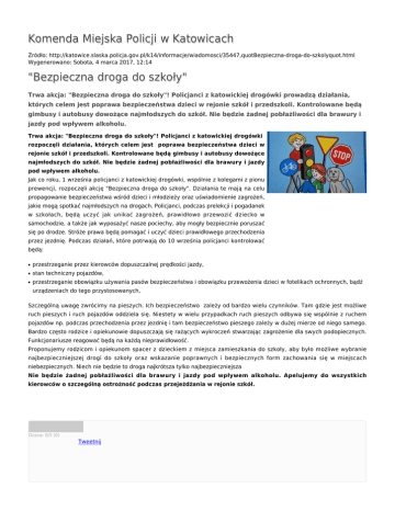 Komenda Miejska Policji w Katowicach Źródło: http://katowice.slaska.policja.gov.pl/k14/informacje/wiadomosci/35447,quotBezpieczna-droga-do-szkolyquot.html Wygenerowano: Sobota, 4 marca 2017, 12:14 "Bezpieczna droga do szkoły" Trwa akcja: "Bezpieczna droga do szkoły"! Policjanci z katowickiej drogówki prowadzą działania, których celem jest poprawa bezpieczeństwa dzieci w rejonie szkół i przedszkoli. Kontrolowane będą gimbusy i autobusy dowożące najmłodszych do szkół. Nie będzie żadnej pobłażliwości dla brawury i jazdy pod wpływem alkoholu. Trwa akcja: "Bezpieczna droga do szkoły"! Policjanci z katowickiej drogówki rozpoczęli działania, których celem jest poprawa bezpieczeństwa dzieci w rejonie szkół i przedszkoli. Kontrolowane będą gimbusy i autobusy dowożące najmłodszych do szkół. Nie będzie żadnej pobłażliwości dla brawury i jazdy pod wpływem alkoholu. Jak co roku, 1 września policjanci z katowickiej drogówki, wspólnie z kolegami z pionu prewencji, rozpoczęli akcję "Bezpieczna droga do szkoły". Działania te mają na celu propagowanie bezpieczeństwa wśród dzieci i młodzieży oraz uświadomienie zagrożeń, jakie mogą spotkać najmłodszych na drogach. Policjanci, podczas prelekcji i pogadanek w szkołach, będą uczyć jak unikać zagrożeń, prawidłowo przewozić dziecko w samochodzie, a także jak wyposażyć nasze pociechy, aby mogły bezpiecznie poruszać się po drodze. Stróże prawa będą pomagać i uczyć dzieci prawidłowego przechodzenia przez jezdnię. Podczas działań, które potrwają do 10 września policjanci kontrolować będą: ● przestrzeganie przez kierowców dopuszczalnej prędkości jazdy, ● stan techniczny pojazdów, ● przestrzeganie obowiązku używania pasów bezpieczeństwa i obowiązku przewożenia dzieci w fotelikach ochronnych, bądź urządzeniach do tego przystosowanych, Szczególną uwagę zwrócimy na pieszych. Ich bezpieczeństwo zależy od bardzo wielu czynników. Tam gdzie jest możliwe ruch pieszych i ruch pojazdów oddziela się. Niestety w wielu przypadkach ruch pieszych odbywa się wspólnie z ruchem pojazdów np. podczas przechodzenia przez jezdnię i tam bezpieczeństwo pieszego zależy w dużej mierze od niego samego. Bardzo często rodzice i opiekunowie dopuszczają się rażących wykroczeń stwarzając zagrożenie dla swych podopiecznych. Funkcjonariusze reagować będą na każdą nieprawidłowość. Proponujemy rodzicom i opiekunom spacer z dzieckiem z miejsca zamieszkania do szkoły, aby było możliwe wybranie najbezpieczniejszej drogi do szkoły oraz wskazanie poprawnych i bezpiecznych form zachowania się w miejscach niebezpiecznych. Niech nie będzie to droga najkrótsza tylko najbezpieczniejsza Nie będzie żadnej pobłażliwości dla brawury i jazdy pod wpływem alkoholu. Apelujemy do wszystkich kierowców o szczególną ostrożność podczas przejeżdżania w rejonie szkół. Ocena: 0/5 (0) Tweetnij