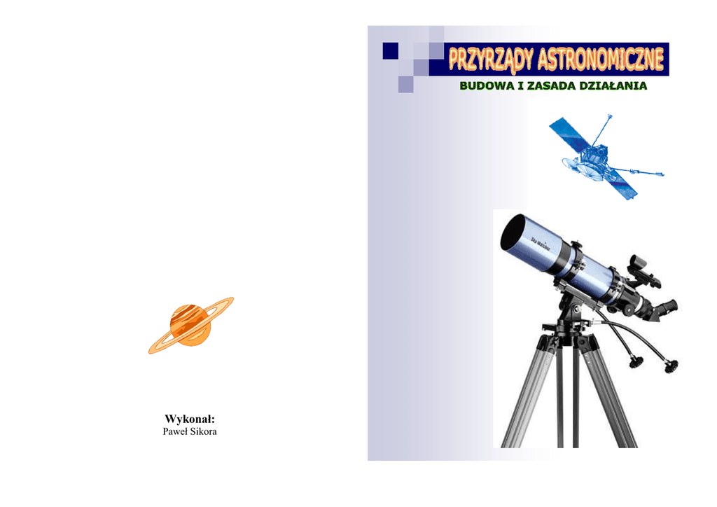 Wykonał: Paweł Sikora Teleskop – przyrząd optyczny złoŜony z dwóch elementów optycznych: obiektywu i okularu (teleskop soczewkowy) lub z okularu i zwierciadła (teleskop zwierciadlany) połączonych tubusem. SłuŜy do powiększania odległych obrazów. Zarówno teleskop soczewkowy, jak i teleskop zwierciadlany dają obraz rzeczywisty powiększony, odwrócony (soczewkowy). Buduje się wiele rodzajów teleskopów od prostych przyrządów optycznych słuŜących do obserwacji krajobrazu po złoŜone urządzenia słuŜące w astronomii (głównie teleskopy zwierciadlane, np. teleskop Hubble'a). Znaczna większość uŜywanych na świecie teleskopów o przeznaczeniu astronomicznym to sprzęt amatorski znajdujący się w prywatnych rękach miłośników astronomii. Hobby jakim jest oglądanie obiektów niebieskich zyskało w ciągu ostatnich lat równieŜ w Polsce ogromne rzesze entuzjastów czego skutkiem jest znaczna ilość nierzadko nawet dość zaawansowanego optycznie sprzętu w rękach amatorów. Teleskop optyczny umoŜliwia otrzymywanie wiernego (zarówno pod względem rozmieszczenia przestrzennego szczegółów, jak i rozkładu jasności), moŜliwie najjaśniejszego obrazu badanego wycinka nieba lub obiektu astronomicznego. Zastosowanie w teleskopie zwierciadeł lub soczewek o duŜej średnicy umoŜliwia wychwycenie rozproszonego światła pochodzącego od odległych obiektów dzięki czemu moŜliwa jest obserwacja lub rejestracja fotograficzna nawet bardzo słabo widocznych obiektów. UŜycie teleskopu umoŜliwia równieŜ znaczne zwiększenie zdolności rozdzielczej, dzięki czemu stają się rozróŜnialne obiekty (np. składniki gwiazdy podwójnej), które nieuzbrojonym okiem są widoczne jako pojedynczy obiekt. Powstający na powierzchni ogniskowej obraz moŜe być zarejestrowany na kliszy fotograficznej, za pomocą detektora CCD współpracującego z komputerem lub przez inne przyrządy, np. fotometry, spektrografy, umieszczone w tej płaszczyźnie lub w innym miejscu, do którego promieniowanie z płaszczyzny ogniskowej zostanie doprowadzone przez odpowiednie układy optyczne. W zaleŜności od tego, czy do skupienia dających obraz promieni wykorzystuje się zjawisko załamania czy odbicia, teleskopy dzielą się na refraktory i reflektory (jak równieŜ teleskopy złoŜone wykorzystujące zarówno soczewki jak i zwierciadła). Do obserwacji fotograficznych nieba uŜywa się teleskopów, w których zwierciadło główne jest sferyczne, a wady optyczne obrazu są zmniejszone przez umieszczenie na drodze wiązki promieniowania asferycznej (w teleskopie zwanej kamerą Schmidta) lub wypukło-wklęsłej soczewki (menisku) w teleskopie zwanej kamerą Maksutowa soczewki korygującej. Gdy zwierciadła główne i wtórne mają kształt odpowiednio dobranych hiperboloid, jest moŜliwe uzyskanie w ognisku Cassegraina stosunkowo duŜego pola widzenia wolnego od zniekształceń (układ Ritcheya–Chretiena). Ze względu na osiągane powiększenia teleskopy są zazwyczaj wyposaŜone w dodatkowa lunetę wizualną (szukacz), umoŜliwiającą odszukanie i wstępną identyfikację badanego obiektu. Elementy optyczne teleskopu są zwykle montowane tak, by mogły obracać się wokół 2 osi. W montaŜach paralaktycznych jedna z osi skierowana jest na biegun nieba (oś rektascensji, godzinna), a druga jest prostopadłej do niej (oś deklinacji). Specjalny mechanizm zegarowy z napędem obraca teleskop wokół osi rektascensji, kompensując pozorny ruch obrotowy nieba, dzięki czemu teleskop „patrzy” podczas obserwacji cały czas na badany obiekt. Dzięki stosowaniu komputerowych układów sterowania coraz częściej wykorzystywane są takŜe montaŜe azymutalne, w których korygowane są jednocześnie obie osie - w tym przypadku Ŝadna z nich nie jest skierowana na biegun nieba - oś azymutu wskazuje zenit, a prostopadła do niej oś wysokość nad horyzontem. Ze względu na zakłócający wpływ atmosfery ziemskiej ograniczający jakość uzyskiwanych obrazów teleskopy umieszcza się w obserwatoriach połoŜonych wysoko w górach jak równieŜ w przestrzeni kosmicznej (największym teleskopem kosmicznym jest umieszczony w 1990 r. na orbicie okołoziemskiej Teleskop Kosmiczny Hubble'a). Jednak poniewaŜ wielkość teleskopów umieszczanych w kosmosie ograniczona jest dostępnymi środkami transportowymi, a serwisowanie ich na orbicie niezwykle skomplikowane (czego dowiodła misja teleskopu Hubble'a) od wielu lat poszukuje się innych rozwiązań mających na celu eliminowanie zakłócającego wpływu atmosfery. NajwaŜniejszym osiągnięciem w tej dziedzinie jest zastosowanie cienkich luster, których kształt jest w czasie rzeczywistym korygowany tak, by anulować zniekształcenia fali światła docierającej do powierzchni lustra. Systemy takie, określane jako układy adaptywnej optyki, pozwalają obecnie osiągać w przypadku największych teleskopów, takich jak Large Binocular Telescope, osiągać rozdzielczość trzydziestokrotnie przewyŜszającą moŜliwości HST. Są jednak obszary, które wymagają umieszczenia teleskopów poza atmosferą. W szczególności całkowita nieprzezroczystość atmosfery dla promieniowania rentgenowskiego powoduje, Ŝe teleskopy rentgenowskie są umieszczane wyłącznie na sztucznych satelitach. Schemat refraktora Podstawowe parametry optyczne kaŜdego teleskopu to: - Średnica zwierciadła lub obiektywu (apertura) - decyduje o zdolności rozdzielczej sprzętu oraz zasięgu obserwacyjnym, większe instrumenty dają zwykle większe moŜliwości obserwacyjne, lepszą jakość obrazu i większą ilość szczegółów. - Ogniskowa - odległość pomiędzy ogniskiem układu optycznego a punktem głównym układu optycznego. - Światłosiła - określająca stosunek średnicy obiektywu i ogniskowej. - Powiększenie - w praktyce trudno uwaŜać je za parametr teleskopu gdyŜ zaleŜy od uŜytego okularu, okulary zaś zwykle są wymienne, co daje moŜliw