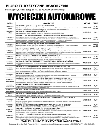 BIURO TURYSTYCZNE JAWORZYNA Pułaskiego 4, Krynica Zdrój, 18 471 61 71, www.btjaworzyna.pl WYCIECZKI AUTOKAROWE DATA 30.05.2015 sobota 30.05.2015 sobota WYCIECZKA JAWORZYNA ( 1114 mnpm ) - KOLEJ GONDOLOWA Wyjazd, zjazd kolejką gondolową na Jaworzynę /1114 mnpm/. Spacer do Schroniska- pamiętamy o turystycznym obuwiu. Bilet ulgowy przysługuje dzieciom, młodzieży szkolnej na podst. legitymacji , osobom powyżej 65 r. SŁOWACJA - SPŁYW DUNAJCEM-LEŚNICA Spływ Dunajcem po stronie słowackiej -trasa 10 km .Czas wolny w Leśnicy(Leśnicka Chata) GODZ CENA 14:00-17:00 45,00 ulg:40 13:30-20:00 70,00 08:30-18:00 85,00 ulg:75 07:00-0:00 130,00 ulg:120 10:00-16:00 40,00 09:00-21:30 95,00 ulg:90 08:30-18:00 85,00 08:30-16:00 75,00 ulg:65 10:00-17:30 55,00 18:30-21:30 60,00 18:30-21:30 35,00 14:00-17:00 20,00 13:30-20:00 70,00 13:30-18:00 40,00 13:30-20:30 60,00 ulg:55 14:00-17:00 20,00 13:30-20:30 75,00 ulg:65 SZAFLARY - KĄPIELISKO TERMALNE - GORĄCY POTOK (KĄPIELE LECZNICZE) 31.05.2015 niedziela 31.05.2015 niedziela 31.05.2015 niedziela 31.05.2015 niedziela 31.05.2015 niedziela 31.05.2015 niedziela 31.05.2015 niedziela 01.06.2015 poniedziałek 01.06.2015 poniedziałek 01.06.2015 poniedziałek 02.06.2015 wtorek 02.06.2015 wtorek 03.06.2015 środa 03.06.2015 środa 04.06.2015 czwartek Pobyt 5 godz. w basenach termalnych - kąpiele siarczkowo- siarkowodorowe ( 7 basenów zewn ). Stosowane są w różnych schorzeniach m.in.: reumatoidalnym zapaleniu stawów, chorobie zwyrodnieniowej stawów, dyskopatii i rwie kulszowej, po stanach pourazowych kości i stawów, nadciśnieniu tętniczym w I i II okresie, w chorobach dermatologicznych. Bilet ulg dot. emerytów pow.65 r.ż. dzieci i młodzieży, studentów do26 r.ż. WĘGRY-EGER -DOLINA PIĘKNEJ PANI- BASENY TERMALNE Zwiedzanie EGERU - Cytadela, Plac Istvana Dobo, Kościół Minorytów, Dolina "Pięknej Pani" - spacer po piwniczkach możliwość zakupu win egerskich, pobyt na kąpielisku termalnym w Egerze ( 3 gpdziny ). ZIEMIA SĄDECKA - STARY SĄCZ + NOWY SĄCZ Przejazd malowniczą Doliną Popradu przez Żegiestów, Rytro do Starego Sącza. Stary Sącz- Klasztor Klarysek ( XIII w.), zwiedzanie kościoła przyklasztornego, Ołtarz Papieski, przejazd do Nowego Sącza - ruiny zamku sądeckiego, Bazylika Św. Małgorzaty, czas wolny ok. 1 godz, powrót do Krynicy doliną Kamienicy Nawojowskiej. WĘGRY - MISZKOLC - KĄPIELISKO TERMALNE W GROTACH Miszkolc - zwiedzanie centrum miasta, czas wolny ok. 1 h, Tapolca - kąpielisko termalne w jaskiniach leczące zaburzenia krążenia, choroby ukł. oddechowego, trawiennego, nerwice, reumatyzm (pobyt 3 h). SŁOWACJA - WYSOKIE TATRY (SZCZYRBSKIE JEZIORO) -JASKINIA BIELAŃSKA Bielańska Jaskinia-najpiękniejsza tatrzańska jaskinia,spacer nad Szczyrbskim Jeziorem( piąty staw tatrzański),czas wolny o. 1 godz SŁOWACJA - VRBOV (KĄPIELISKO TERMALNE Z WODAMI SIARKOWYMI) 3 godz. pobytu na basenach-4 baseny termalne na zewn.o tem.26-38°C. Woda polecana przy leczeniu chorób reumatycznych, układu ruchowego, nerwowego, krążenia, przy chorobach górnych i dolnych dróg oddechowych. Bilet ulgowy dotyczy osób po 60 r.,dzieci do 12 l. W drodze powrotnej postój przy granicy na zakupy SŁOWACJA - LEWOCZA Zwiedzanie gotyckiego kościoła Św. Jakuba w Lewoczy - jednego z najcenniejszych zabytków Słowacji, dojazd od Spiskiego Zamku (zwiedzanie z zew.), czas wolny ok. 1 godz WYCIECZKA DOROŻKAMI + OGNISKO GÓRALSKIE Z KAPELĄ REGIONALNĄ Przejazd dorożkami do miejsca ogniska-ok.6 km, ognisko pod zadaszeniem z kiełbasą (dodatki: chleb, ketchup, musztarda) muzyka, tańce, żarty, wspólne śpiewanie. OBOWIĄZUJE DOBRY HUMOR. Powrót autokarem. OGNISKO GÓRALSKIE Z KAPELĄ REGIONALNĄ Przejazd autokarem, ognisko pod zadaszeniem z kiełbaską (dodatki: chleb, ketchup, musztarda) muzyka, tańce, żarty, anegdoty, wspólne śpiewanie. OBOWIĄZUJE DOBRY HUMOR OKOLICE KRYNICY- ŚLADAMI HISTORII Zwiedzanie zabytkowego kościoła w Tyliczu z 1612 r, cerkiew w Szczawniku z 1841r. SŁOWACJA - SPŁYW DUNAJCEM-LEŚNICA Spływ Dunajcem po stronie słowackiej -trasa 10 km .Czas wolny w Leśnicy(Leśnicka Chata) WYSOWA ZDRÓJ - CERKIEW W KWIATONIU - STADNINA KONI HUCULSKICH W REGETOWIE Spacer po uzdrowisku Wysowa-Zdrój. Zwiedzanie cerkiewki w Kwiatoniu - wpisanej na listę UNESCO oraz Stadniny Koni Huculskich "Gładyszów". JEZIORO CZORSZTYŃSKIE-REJS STATKIEM"HARNAŚ"-ZAMEK W NIEDZICY Pieniny- rejs stakiem po jeziorze Czorsztyńskim, zwiedzanie zamku w Niedzicy, powozowni. MUSZYNA - MUZEUM REGIONALNE - OGRODY ZMYSŁÓW Muszyna - muzeum regionalne ( historia państwa Muszyńskiego ) spacer po parku sensorycznym z wieżą widokową, czas wolny, zwiedzanie cerkwi w Powroźniku ( wpisana na listę UNESCO ) SŁOWACJA - VRBOV (KĄPIELISKO TERMALNE Z WODAMI SIARKOWYMI). 3 godz. pobytu na basenach-4 baseny termalne na zewn.o tem.26-38°C. Woda polecana przy leczeniu chorób reumatycznych, układu ruchowego, nerwowego, krążenia, przy chorobach górnych i dolnych dróg oddechowych. Bilet ulgowy dotyczy osób po 60 r.,dzieci do 12 l. W drodze powrotnej postój przy granicy na zakupy ZAPISY: BIURO TURYSTYCZNE JAWORZYNA!!! Pułaskiego 4 Krynica Zdrój, Polska18 471 61 71, e-mail:[email protected] czynne 8:00-19:00 (PN-PT), 9:00-15:00 (SO) BIURO TURYSTYCZNE JAWORZYNA Pułaskiego 4, Krynica Zdrój, 18 471 61 71, www.btjaworzyna.pl WYCIECZKI AUTOKAROWE DATA 04.06.2015 czwartek 04.06.2015 czwartek 04.06.2015 czwartek 05.06.2015 piątek WYCIECZKA WYCIECZKA DOROŻKAMI + OGNISKO GÓRALSKIE Z KAPELĄ REGIONALNĄ Przejazd dorożkami do miejsca ogniska-ok.6 km, ognisko pod zadaszeniem z kiełbasą (dodatki: chleb, ketchup, musztarda) muzyka, tańce, żarty, wspólne śpiewanie. OBOWIĄZUJE DOBRY HUMOR. Powrót autokarem. GODZ CENA 18:30-21:30 60,00 13:30-20:00 55,00 18:30-21:30 35,00 14:00-17:00 30,00 13:30-20:30 75,00 ulg:70 13:30-20:00 70,00 18:30-21:30 35,00 08:30-18:00 50,00 14:00-17:00 45,00 ulg:40 05:00-0:00 155,00 08:30-18:00 75,00 08:30-18