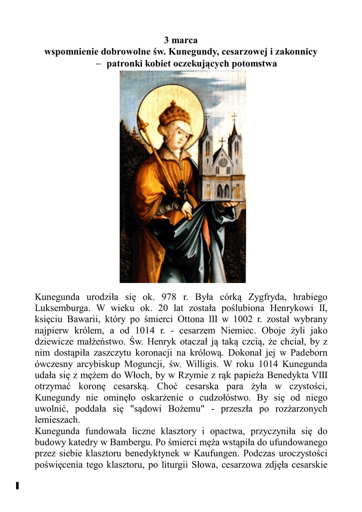 3 marca wspomnienie dobrowolne św. Kunegundy, cesarzowej i zakonnicy patronki kobiet oczekujących potomstwa Kunegunda urodziła się ok. 978 r. Była córką Zygfryda, hrabiego Luksemburga. W wieku ok. 20 lat została poślubiona Henrykowi II, księciu Bawarii, który po śmierci Ottona III w 1002 r. został wybrany najpierw królem, a od 1014 r. - cesarzem Niemiec. Oboje żyli jako dziewicze małżeństwo. Św. Henryk otaczał ją taką czcią, że chciał, by z nim dostąpiła zaszczytu koronacji na królową. Dokonał jej w Padeborn ówczesny arcybiskup Moguncji, św. Willigis. W roku 1014 Kunegunda udała się z mężem do Włoch, by w Rzymie z rąk papieża Benedykta VIII otrzymać koronę cesarską. Choć cesarska para żyła w czystości, Kunegundy nie ominęło oskarżenie o cudzołóstwo. By się od niego uwolnić, poddała się "sądowi Bożemu" - przeszła po rozżarzonych lemieszach. Kunegunda fundowała liczne klasztory i opactwa, przyczyniła się do budowy katedry w Bambergu. Po śmierci męża wstąpiła do ufundowanego przez siebie klasztoru benedyktynek w Kaufungen. Podczas uroczystości poświęcenia tego klasztoru, po liturgii Słowa, cesarzowa zdjęła cesarskie 1 szaty, ostrzygła włosy i odziała się w zgrzebny habit. Swój majątek przeznaczyła na fundacje kościelne i dobroczynne. Zrobiło to wielkie wrażenie na uczestnikach ceremonii. Opisuje to wydarzenie ks. Piotr Skarga w "Żywotach Świętych". Jako zakonnica służyła z oddaniem ludziom, zwłaszcza ubogim. Nie wyróżniała się niczym w ubóstwie i posłuszeństwie, nie wymawiała się od żadnych prac, nawet służebnych. Zmarła 3 marca 1033 r. Zgodnie z jej życzeniem została pochowana obok męża w katedrze bamberskiej. Natychmiast zaczęto oddawać jej publiczny kult. Innocenty III zatwierdził go w roku 1200. W ikonografii św. Kunegunda Luksemburska występuje w stroju cesarskim, najczęściej z mężem św. Henrykiem. Przedstawia się ją także w habicie zakonnym trzymającą w ręku kościół. Modlitwa: Boże, który pomiędzy innymi przedziwnymi dziełami Twoimi, świętą Kunegundę, Dziewicę, takimi cnotami przyozdobiłeś, że ona i w małżeństwie dziewictwo przechowała, a po śmierci małżonka wstąpiwszy do zakonu wysokimi cnotami zajaśniała, daj miłościwie, abyśmy starając się godnie Ją uczcić, za Jej pośrednictwem wedle możności naszej cnoty Jej naśladowali. Przez Pana naszego Jezusa Chrystusa, który króluje w Niebie i na ziemi. Amen. 2