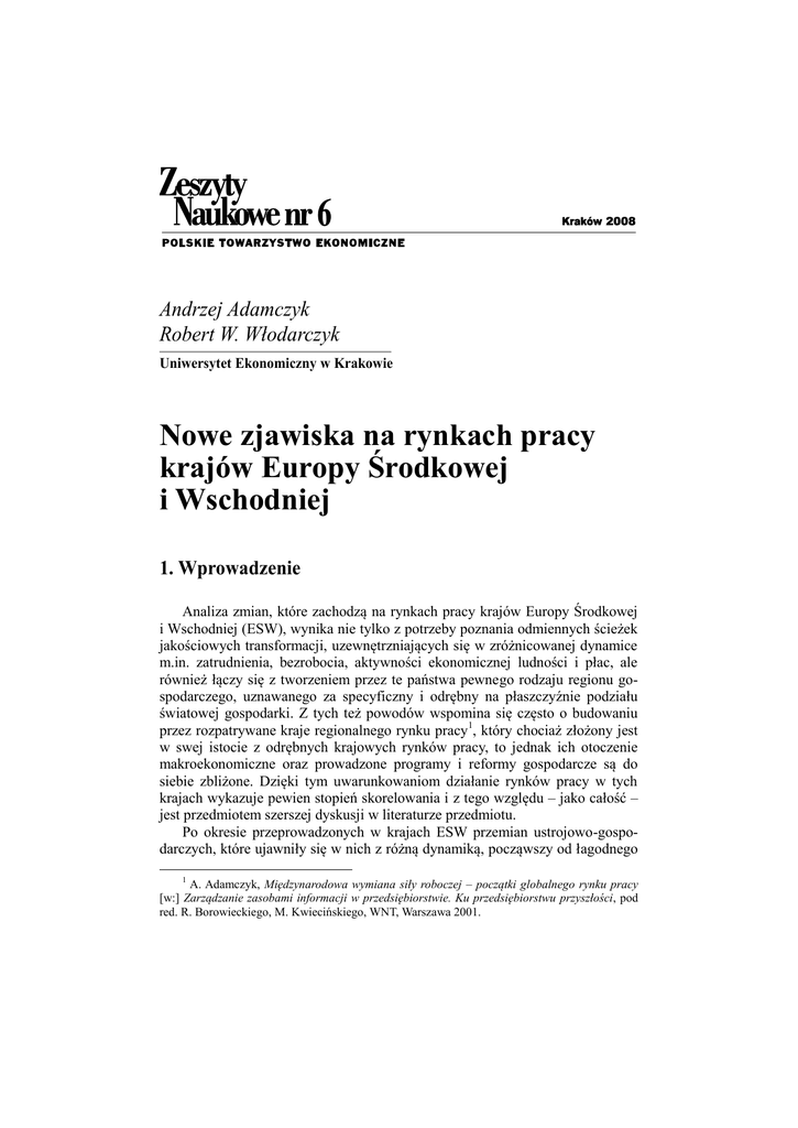 Andrzej Adamczyk Robert W. Włodarczyk Uniwersytet Ekonomiczny w Krakowie Nowe zjawiska na rynkach pracy krajów Europy Środkowej i Wschodniej 1. Wprowadzenie Analiza zmian, które zachodzą na rynkach pracy krajów Europy Środkowej i Wschodniej (ESW), wynika nie tylko z potrzeby poznania odmiennych ścieżek jakościowych transformacji, uzewnętrzniających się w zróżnicowanej dynamice m.in. zatrudnienia, bezrobocia, aktywności ekonomicznej ludności i płac, ale również łączy się z tworzeniem przez te państwa pewnego rodzaju regionu gospodarczego, uznawanego za specyficzny i odrębny na płaszczyźnie podziału światowej gospodarki. Z tych też powodów wspomina się często o budowaniu przez rozpatrywane kraje regionalnego rynku pracy1, który chociaż złożony jest w swej istocie z odrębnych krajowych rynków pracy, to jednak ich otoczenie makroekonomiczne oraz prowadzone programy i reformy gospodarcze są do siebie zbliżone. Dzięki tym uwarunkowaniom działanie rynków pracy w tych krajach wykazuje pewien stopień skorelowania i z tego względu – jako całość – jest przedmiotem szerszej dyskusji w literaturze przedmiotu. Po okresie przeprowadzonych w krajach ESW przemian ustrojowo-gospodarczych, które ujawniły się w nich z różną dynamiką, począwszy od łagodnego 1 A. Adamczyk, Międzynarodowa wymiana siły roboczej – początki globalnego rynku pracy [w:] Zarządzanie zasobami informacji w przedsiębiorstwie. Ku przedsiębiorstwu przyszłości, pod red. R. Borowieckiego, M. Kwiecińskiego, WNT, Warszawa 2001. 266 Andrzej Adamczyk, Robert W. Włodarczyk przejścia od gospodarki centralnie planowanej do systemu rynkowego aż po terapię szokową z recesją transformacyjną, zachodzą – w ostatnich latach – ważne zmiany na rynkach pracy krajów rozważanego regionu. Można przypuszczać, że jest to w większym stopniu już implikacja uczestnictwa tych krajów w Unii Europejskiej, a także w europejskiej unii monetarnej, niż samych przemian ustrojowych. Funkcjonowanie tych krajów w ramach Wspólnoty wiąże się z wdrożeniem nowych reguł, szczególnie dotyczących swobodnego przepływu osób i siły roboczej, a także budową nowoczesnych struktur ekonomicznych. Z kolei uczestnictwo lub przygotowania do udziału we wspólnym obszarze walutowym wymaga nie tylko różnorodnych dostosowań nominalnych w gospodarce, ale również modyfikacji realnej strony systemu gospodarczego. Ponadto zachowanie się współczesnych rynków pracy w krajach ESW jest konsekwencją pewnych utrwalonych uwarunkowań i zależności oraz tego, że nadal istnieją instytucje, które nie poddały się reformom w ramach procesu transformacji. Celem opracowania jest pokazanie nowych zjawisk na rynkach pracy w krajach ESW, uwydatniając stopień heterogeniczności rynków pracy poszczególnych krajów tego regionu, a także określenie stopnia opóźnienia i zakresu niedostosowania rynków pracy tych krajów na tle państw UE-15. Z uwagi na tak sformułowany cel badań w drugim punkcie pokazano główne kierunki dyskursu w literaturze nad zmianami na rynkach pracy w krajach ESW. Następnie przeprowadzono analizę empiryczną, której istotą było pokazanie zmian ilościowych w zakresie siły roboczej, w szczególności w obszarze zatrudnienia, aktywności ekonomicznej ludności, bezrobocia, płac i wydajności pracy. Artykuł kończy podsumowanie, w którym przedstawiono wnioski z przeprowadzonej analizy i wskazano na ewentualne dalsze kierunki badań. 2. Dyskusja nad zmianami na rynkach pracy w krajach Europy Środkowej i Wschodniej Zmiana ustroju społeczno-gospodarczego w krajach ESW wymusiła konieczność restrukturyzacji ważnego ich elementu strukturalnego, którym jest rynek pracy. Duże znaczenie przemian na rynkach pracy w tych krajach dla powodzenia procesu transformacji podkreślają przykładowo T. Boeri i M. Keese, którzy piszą, że: „Stworzenie elastyczności i dynamizmu na rynkach pracy krajów ESW ma duże znaczenie w determinowaniu szybkości i końcowych rezultatów procesu transformacji gospodarek od systemu centralnie planowanego do systemu rynkowego” 2. 2 T. Boeri, M. Keese, Labour Markets and the Transition in Central and Eastern Europe, „OECD Economic Studies” 1992, nr 18, s. 134. Nowe zjawiska na rynkach pracy… 267 W ramach zachodzącego w krajach ESW procesu transformacji – obok charakterystycznych uwarunkowań w każdym z tych państw – można wskazać trzy nadrzędne czynniki, które w nowym otoczeniu makroekonomicznym decydowały o kierunku ewolucji rynków pracy w tym regionie. Jako pierwszy z nich należy wymienić proces przenoszenia, czy niekiedy nawet kopiowania, z wyżej rozwiniętych gospodarek rynkowych wzorów rozwiązań zarówno prawnych, jak i instytucjonalnych, dotyczących budowy tych rynków. Drugim jest modyfikacja dotychczasowej struktury produkcji, wyznaczająca nowy popyt na siłę roboczą, ale również uniemożliwiająca dostęp do źródła dochodów wielu grupom pracowników tych krajów, które w poprzednim systemie gospodarczym nie były zagrożone bezrobociem. Trzeci czynnik związany jest z globalizacją i postępem technologiczno-informacyjnym, który tworzy odrębne źródło oddziaływania na rynki pracy i wychodzi niejako poza kwestię samego procesu transformacji. Aspekt ten ujawnił się głównie poprzez zmianę produkcyjności pracy i kreowanie nowego popytu na pracę, w szczególności popytu na wysokiej klasy specjalistów w dziedzinie informatyki, telekomunikacji, finansów i rynków kapitałowych, biotechnologii czy inżynierii genetycznej3. Wszystkie te czynniki, w połączeniu ze specyficznymi determinantami dla każdego z krajów, musiały spowodować ogromne przeobrażenia w zakresie absorpcji zasobów siły roboczej. C. Sorrentino podkreśla w swoim opracowaniu złożoność problemów związanych z rynkiem pracy, które w krajach ESW od początku transformacji czekały na rozwiązanie,